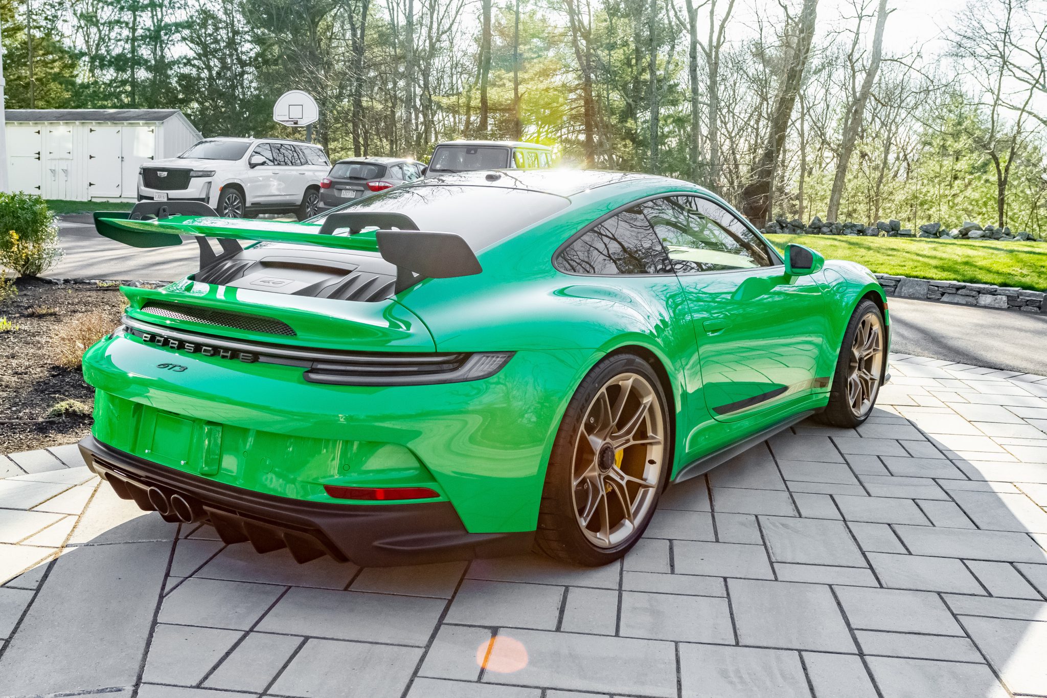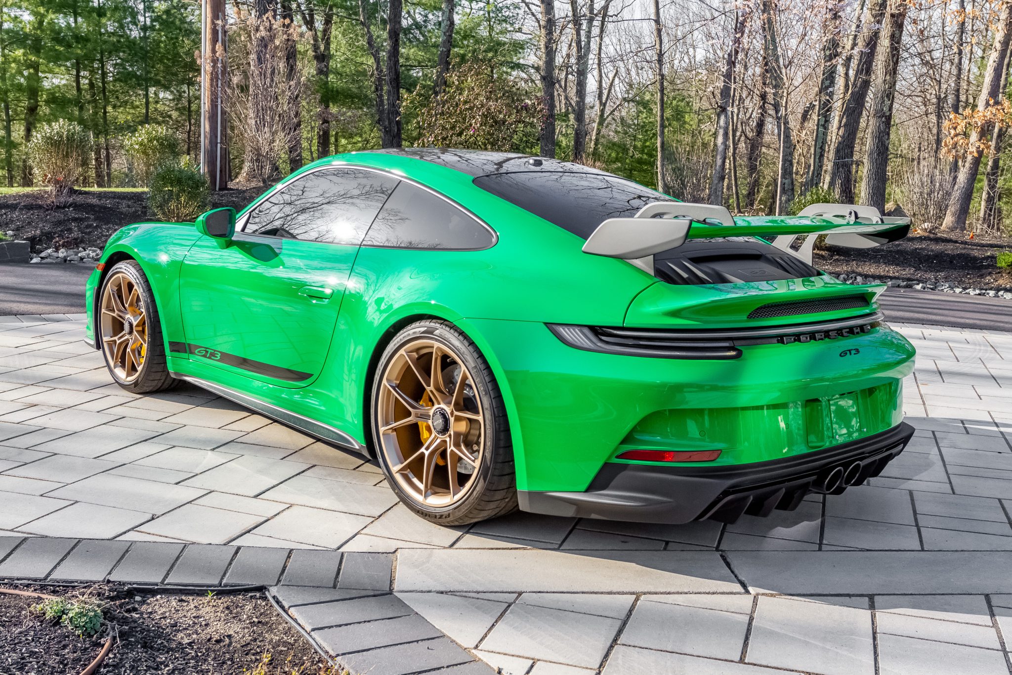 Forged 20″ and 21″ center-lock wheels with a Satin Neodyme finish are mounted with 255/35 front and 315/30 rear Pirelli P Zero Corsa tires. Braking is provided by yellow Porsche-branded six-piston front and four-piston rear aluminum monoblock calipers fitted over carbon-ceramic reinforced rotors. The car features a double-wishbone front suspension setup with Porsche Active Suspension Management as well as a front-axle lift system and rear-axle steering.