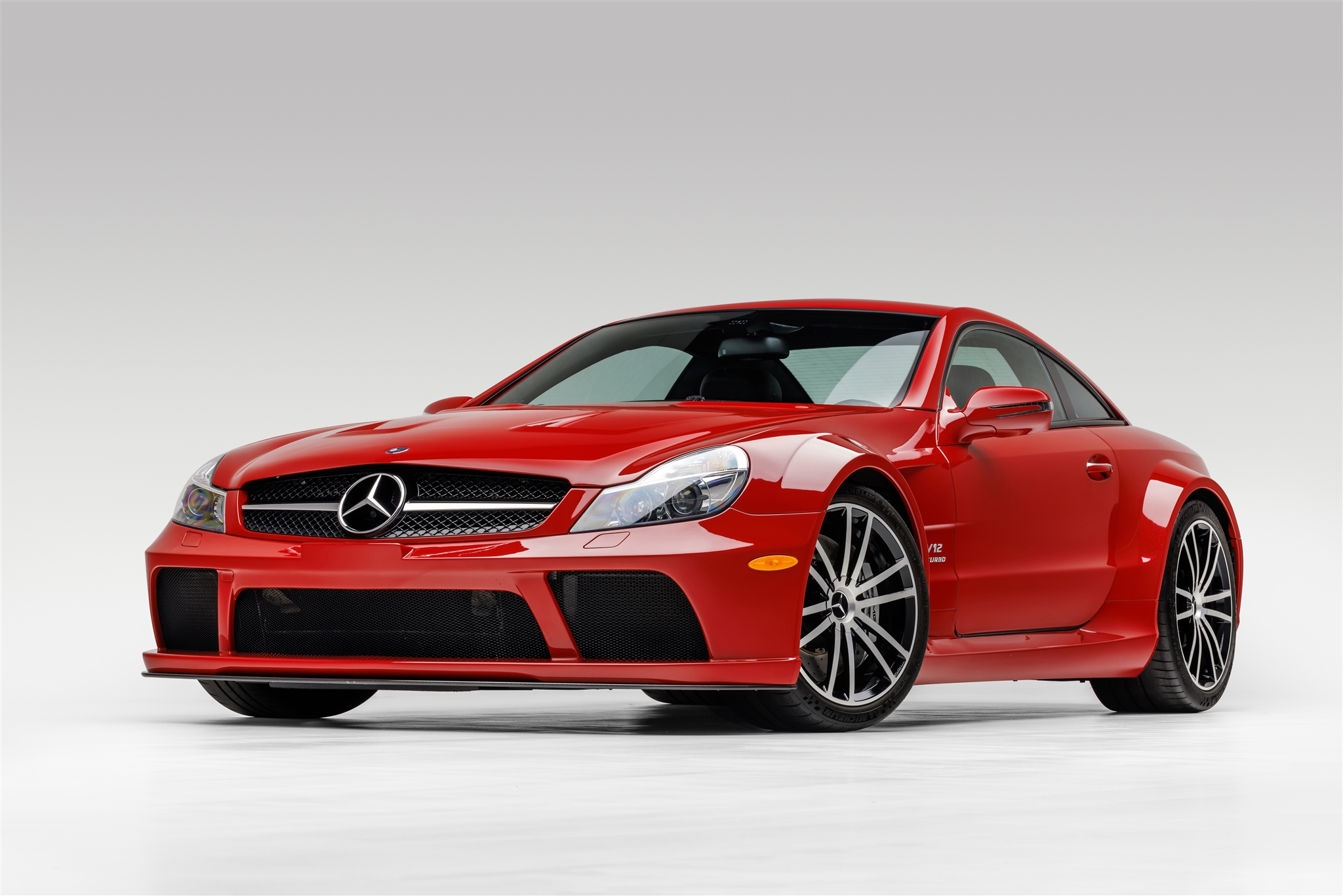 The forged 19″ and 20″ AMG twin-spoke alloy wheels are mounted with 265/35 front and 325/30 rear Michelin Pilot Sport Cup 2 tires. The track is widened by 4.5” at the front and 4.1” at the rear compared to a standard SL65, and the car features an active-roll stabilization system. Stopping power is provided by silver AMG-branded calipers over slotted and cross-drilled rotors at all four corners.