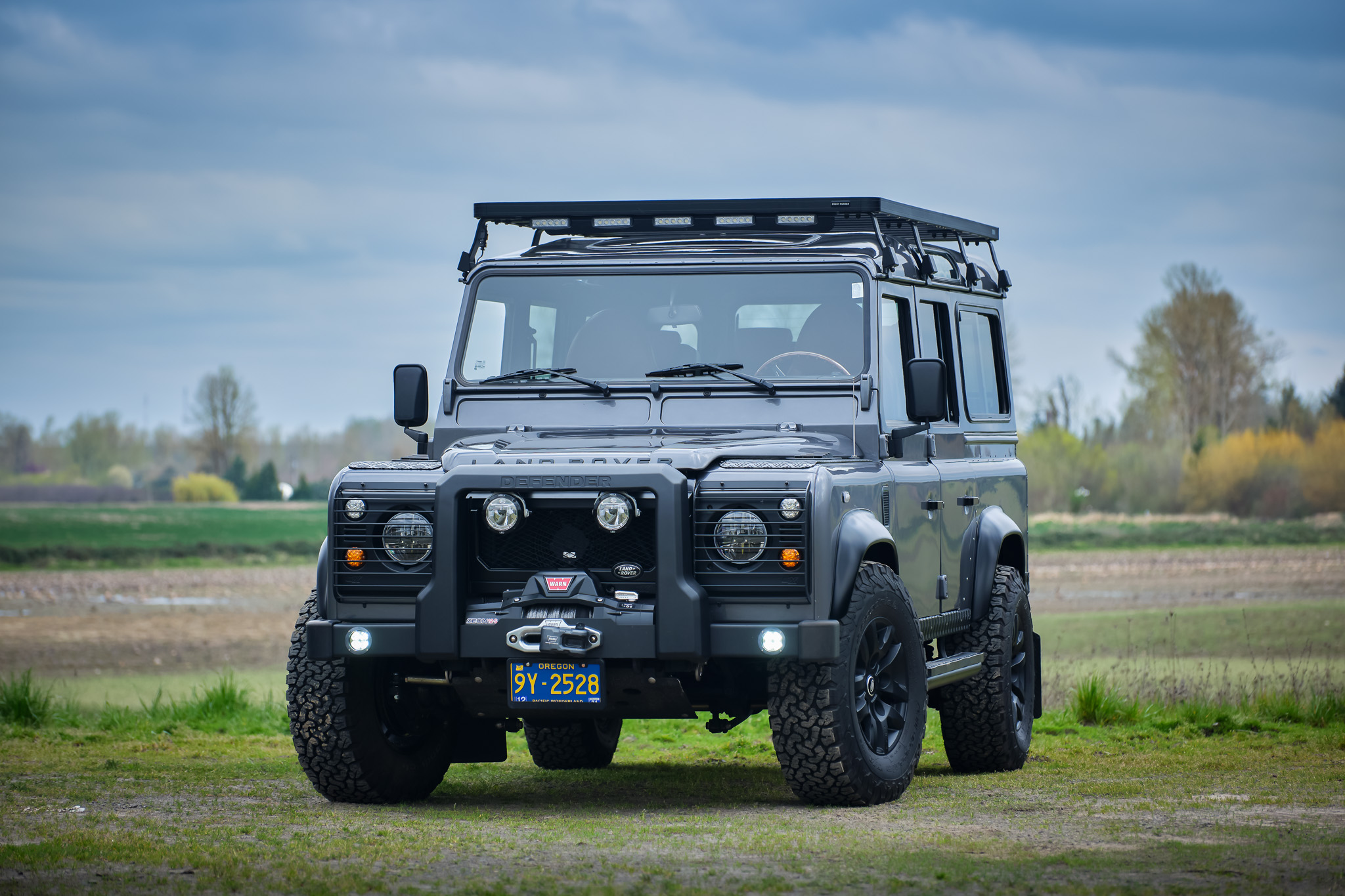 Satin-black 18″ Kahn 1948 wheels are wrapped in 265/75 BFGoodrich All-Terrain KO2 tires. A matching spare is mounted to a swing-away carrier at the rear. The Bilstein and Eibach performance suspension package was optioned, and braking is handled by TAROX six-piston front and rear calipers.