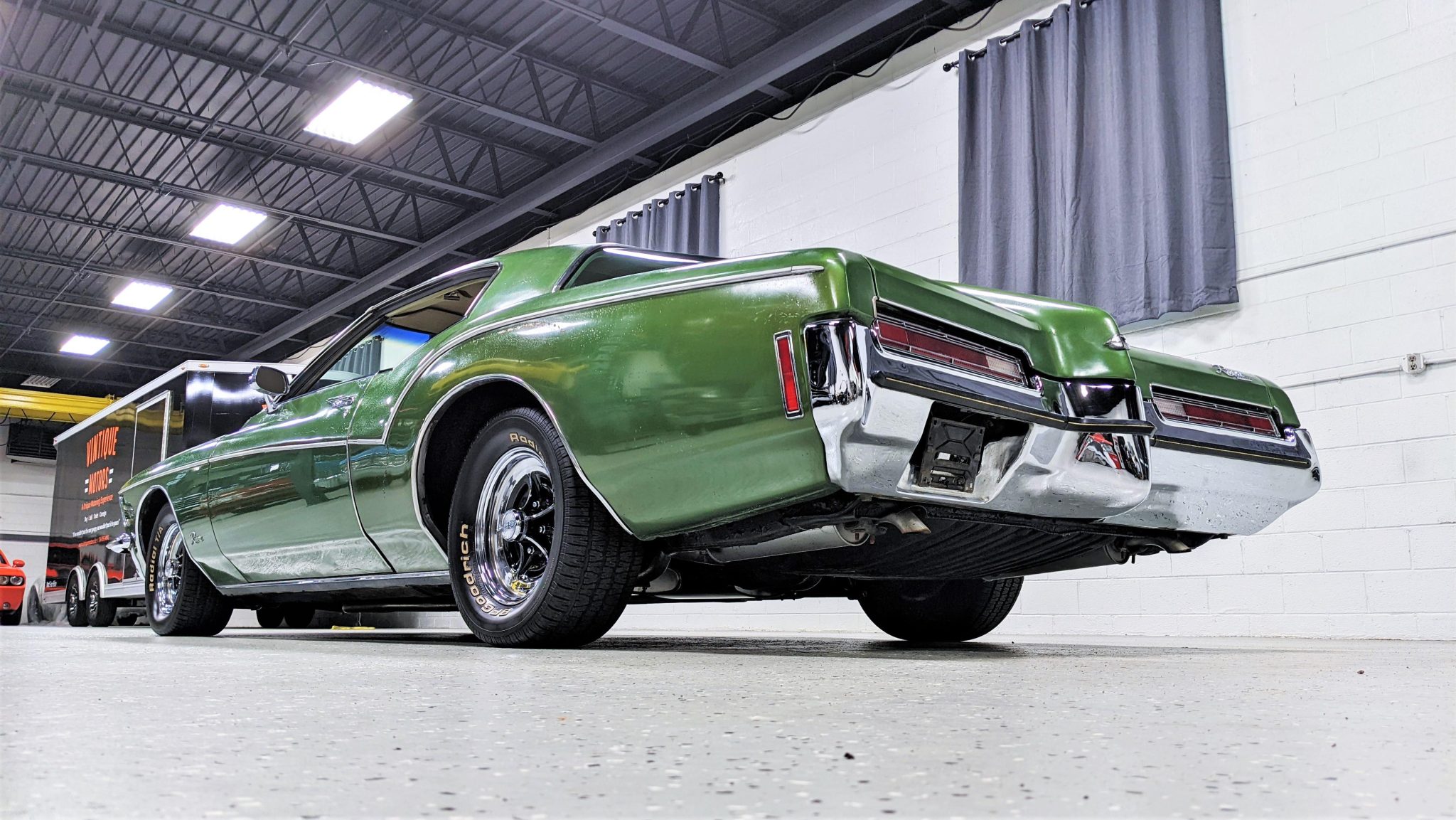 Rally wheels with Riviera-branded centers were refinished in 2015 are mounted with 15″ BFGoodrich white-letter tires. A full-size spare mounted with an older tire is located in the trunk. Power-assisted disc brakes are complemented by rear drums, and the car is equipped with power steering.
