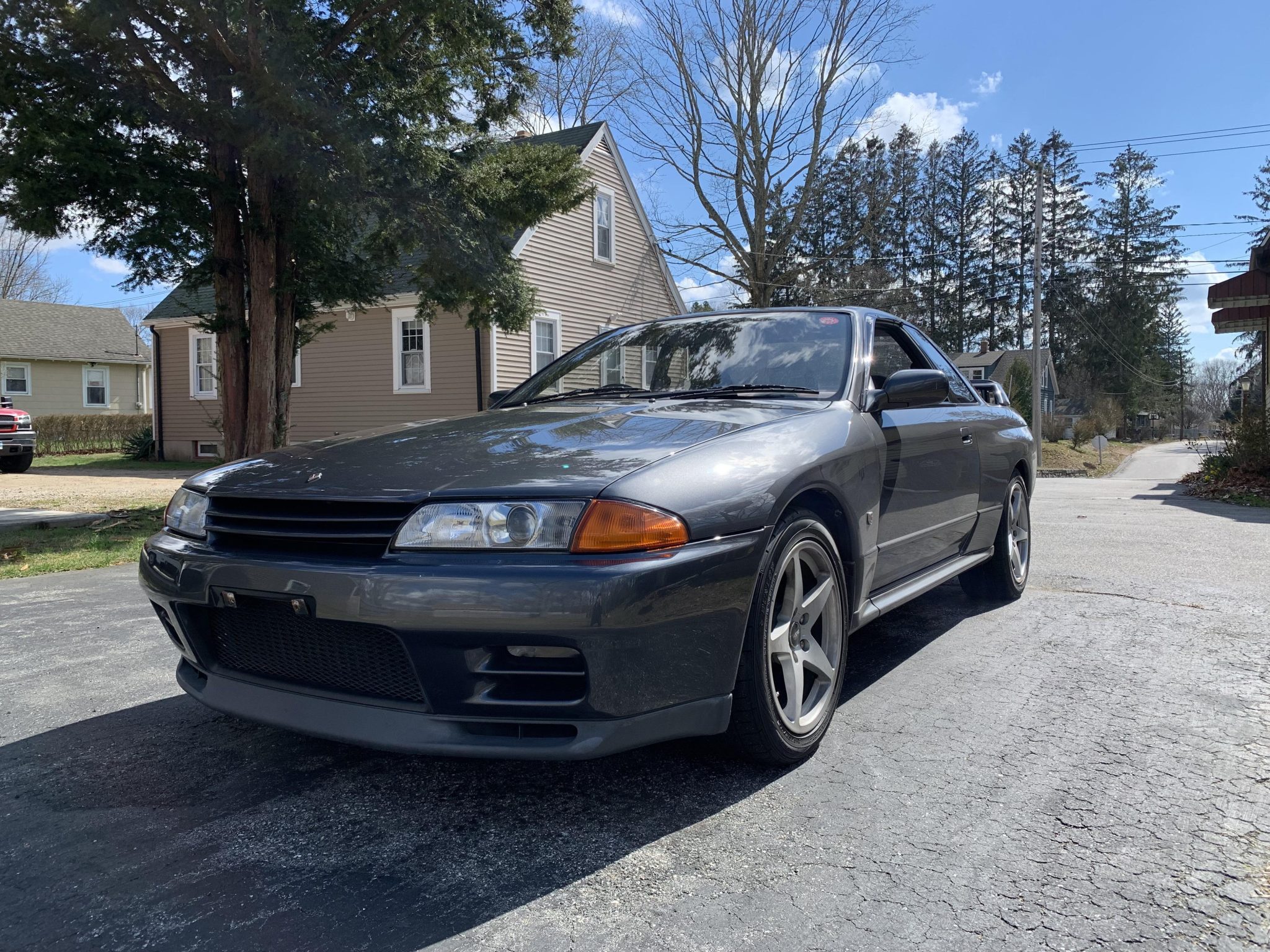 Silver 17″ NISMO NS5R alloy wheels are mounted with 245/45 Continental Extreme Contact DWS Plus tires showing 2022 date codes. The R32 GT-R features Super HICAS four-wheel steering, and braking is handled by four-wheel cross-drilled rotors with gray Nissan-branded calipers and ABS. A NISMO front strut tower brace has been fitted, and service performed under previous ownership in 2017 is said to have included overhauling the brake calipers and installing replacement brake lines, rotors, and pads. Work performed under current ownership included installing BC Racing adjustable coilovers as well as replacing the front upper control arms, front bushings, rear caster arms, rear tie rods, and rear traction arms.