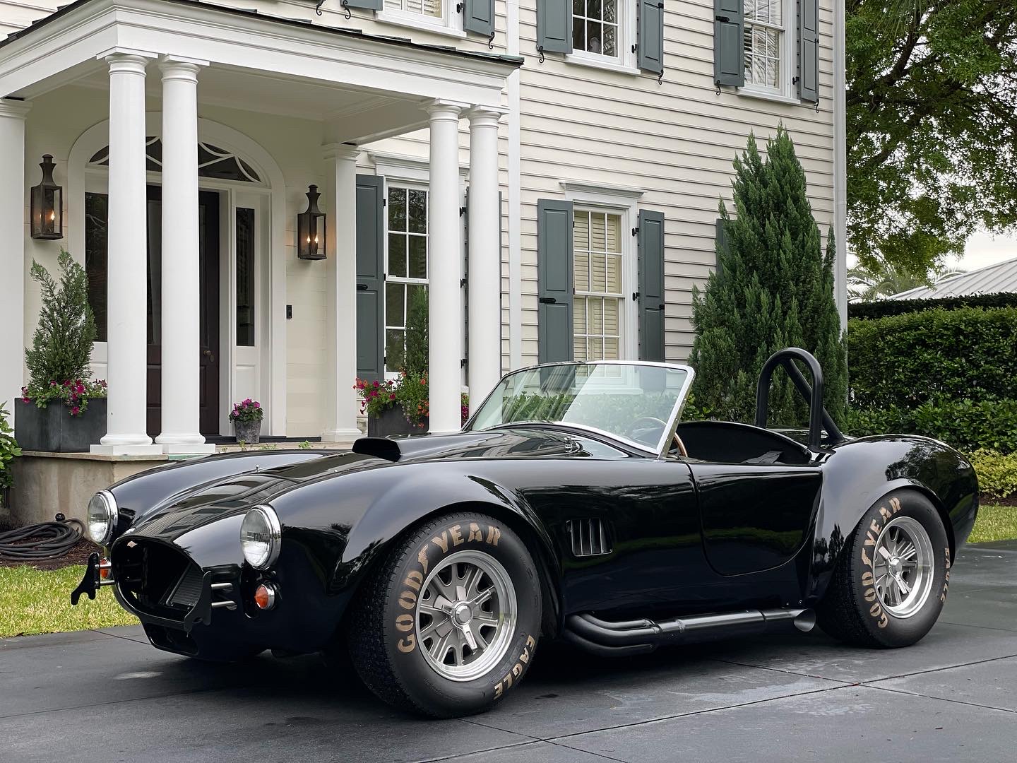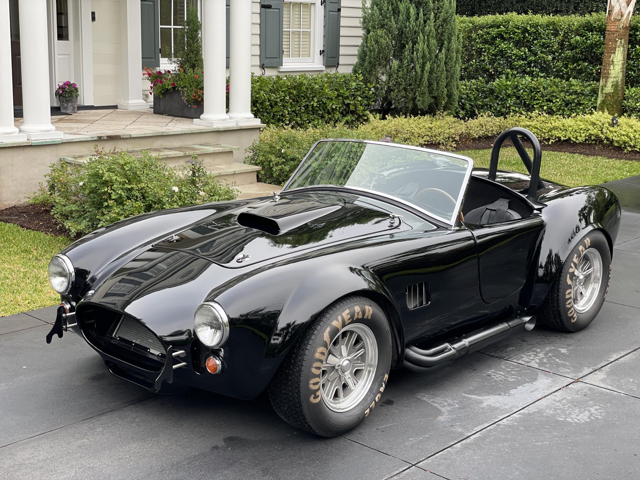 Halibrand-style 15″ wheels are wrapped in Goodyear Eagle tires sized 26.5×8.0″ up front and 265×10.5″ in back. The hubs were converted to a five-bolt system and the wheels and tires were mounted during current ownership.