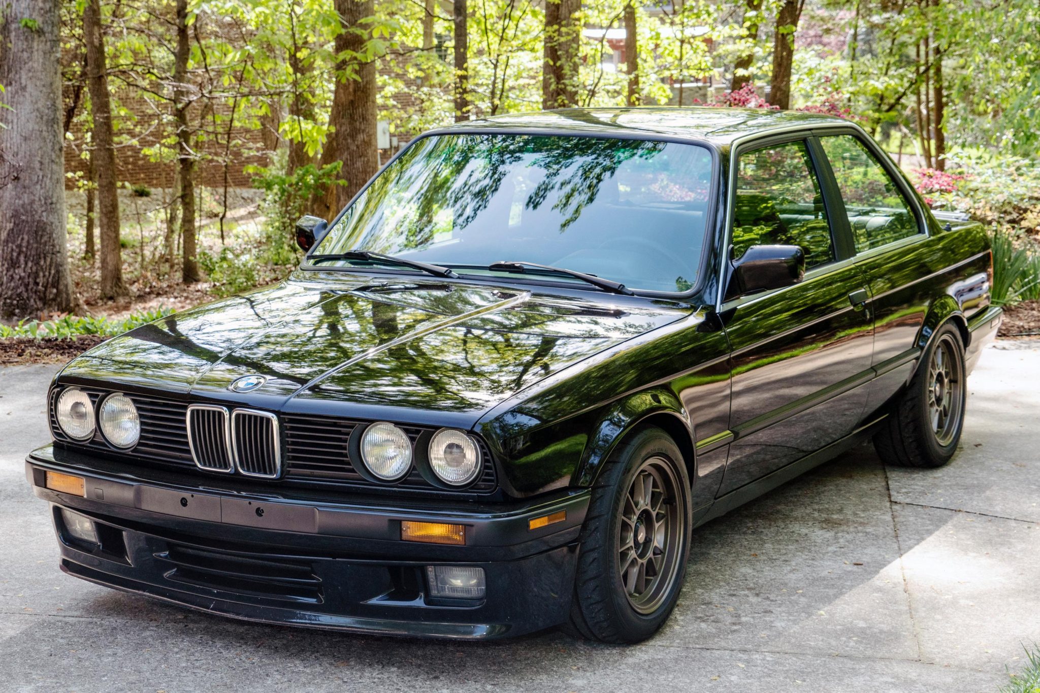 Bronze-finished 15″ König 12-spoke wheels are wrapped in 205/50 Bridgestone Potenza tires showing 2017 date codes. Modifications are said to include Bilstein shocks, a Racing Dynamics front sway bar, a set of Ireland Engineering lowering springs, stainless-steel brake lines, and Bimmerworld wheel studs. A factory basket-weave 14″ wheel and spare tire are mounted in the trunk, and a set of four factory basket-weave 14” wheels is included in the sale.
