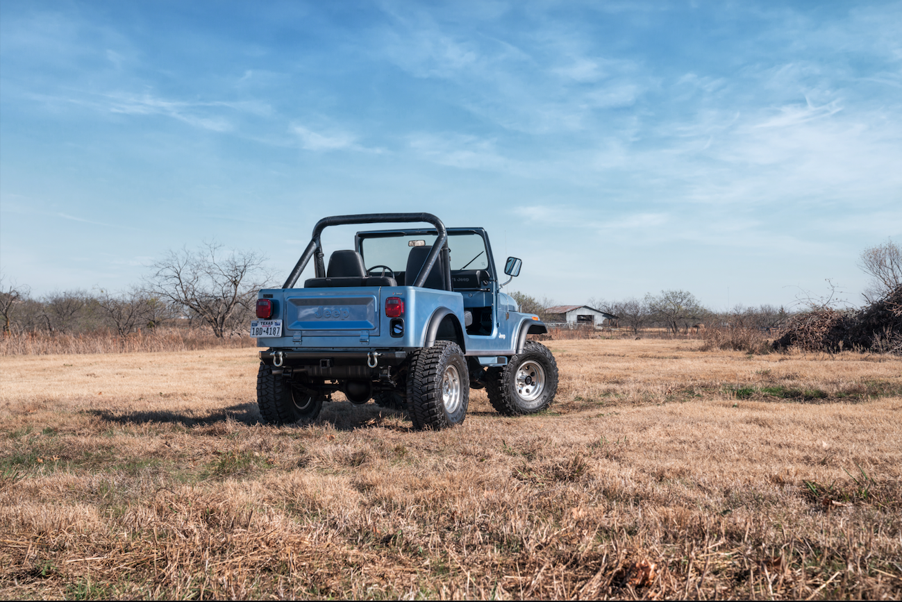 Polished 15″ American Racing wheels are mounted with 33×12.5″ Goodyear Wrangler MT/R tires that were mounted in 2017. Stopping power is provided by front disc brakes and rear drums. Modifications include a 1.5” body lift and a 2″ lift kit with Fox shocks. The steering stabilizer, brake master cylinder, and drag link have been replaced under current ownership.