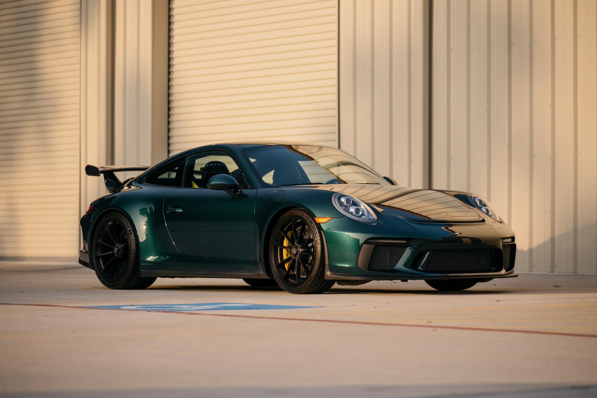 Satin black 20″ center-lock wheels are wrapped in 245/35 front and 305/30 rear Michelin Sport Cup 2 tires. The car is equipped with rear-axle steering, an optional front-axle lift system, and Porsche Ceramic Composite Brakes with yellow calipers.