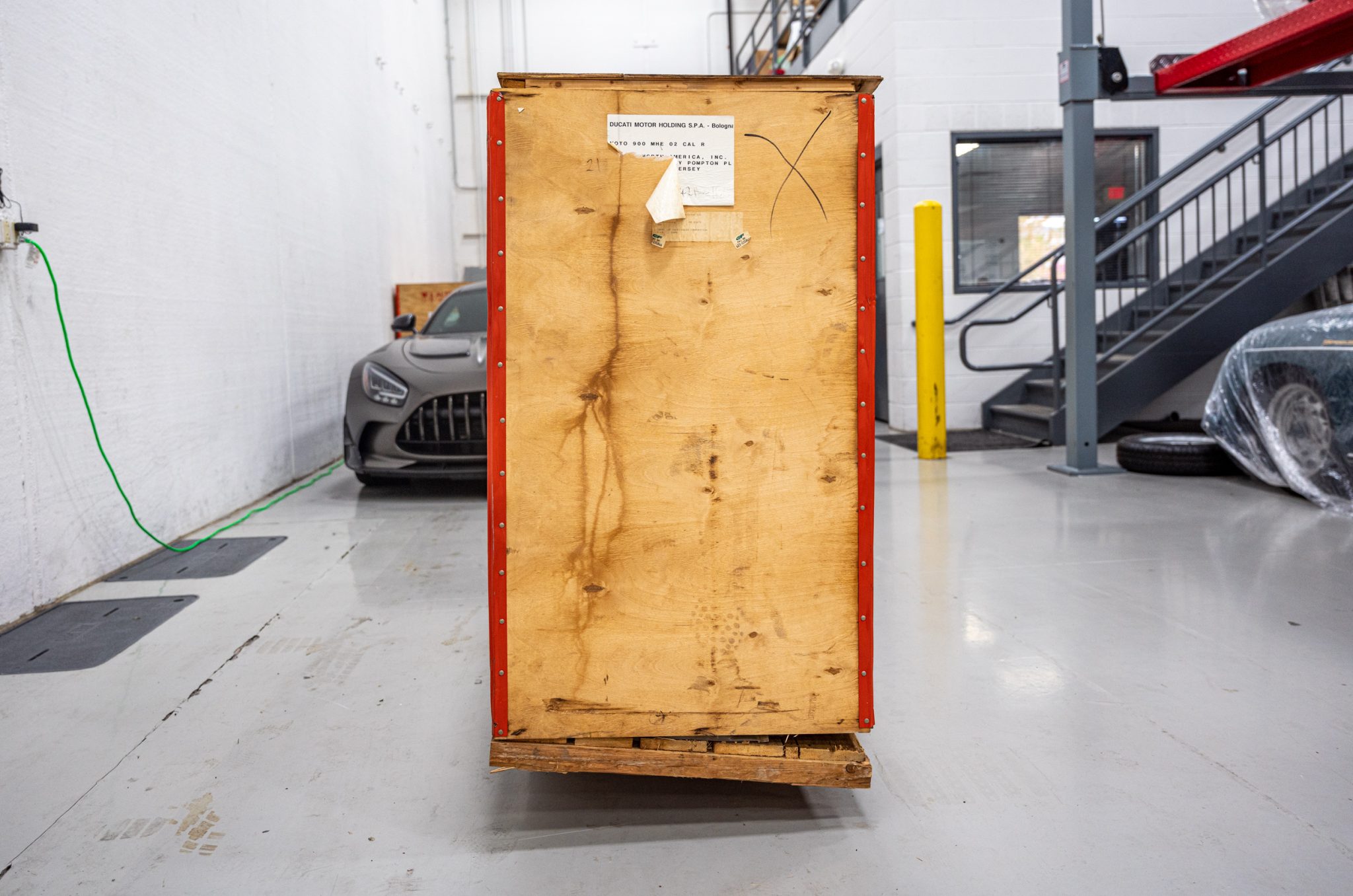 The bike is covered with the protective materials used to pack it for initial dealer delivery. Typical equipment includes five-spoke 17″ Antera wheels, an inverted 43mm Showa fork, an adjustable Paioli piggyback monoshock, a single-sided swingarm, and triple Brembo disc brakes.