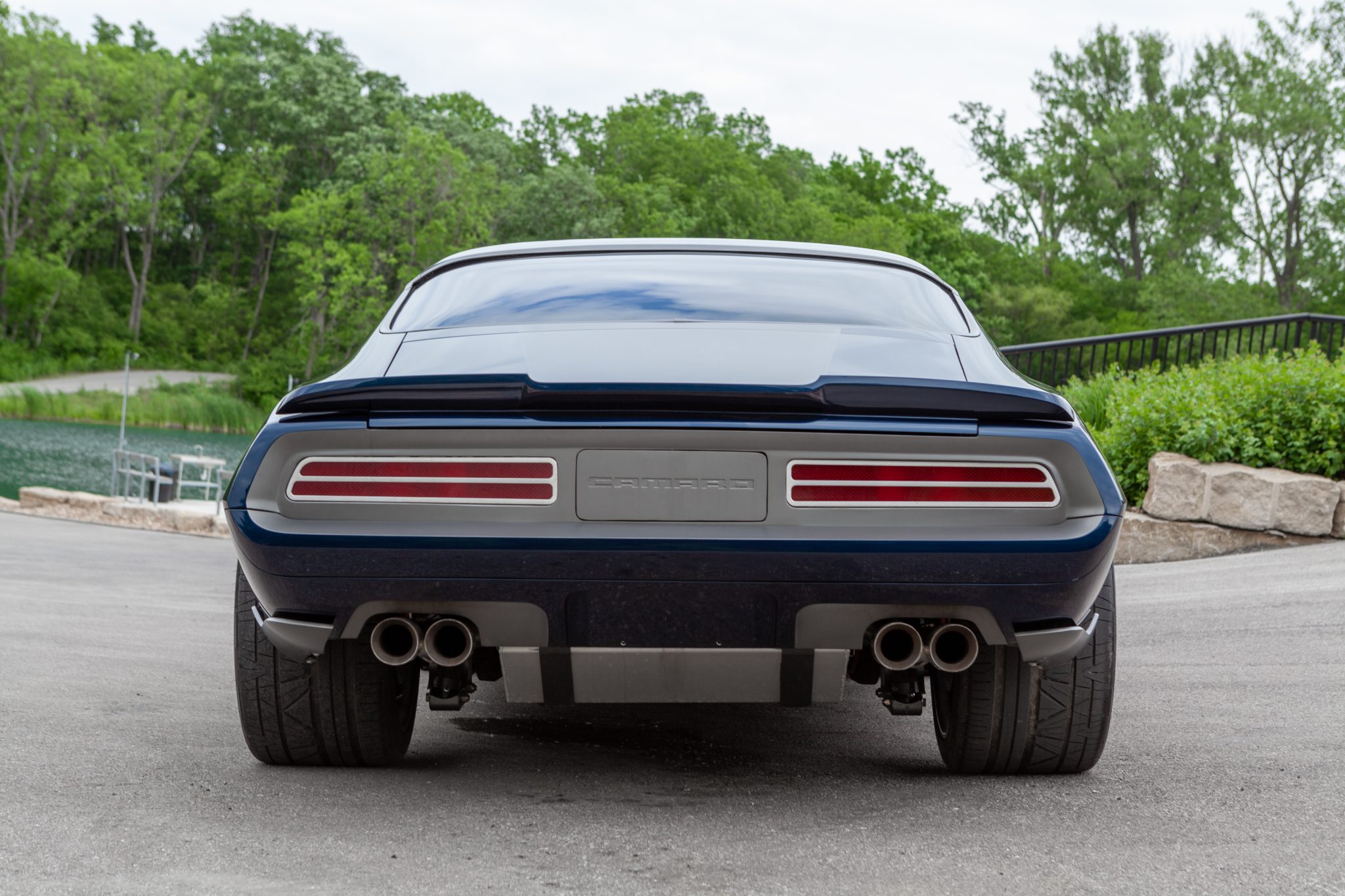The staggered Boze Forged Clutch wheels are finished in dark gray with gloss black barrels and are mounted with Nitto Invo tires measuring 275/35/18 up front and 345/30/19 out back. The front suspension features a Detroit Speed subframe, tubular control arms, a large-diameter sway bar, subframe connectors, and power-assisted rack and pinion steering. The rear features a Detroit Speed QUADRALink system with a Panhard bar, and adjustable JRI aluminum coilovers are fitted at all four corners. Stopping power is provided by Wilwood six-piston front and four-piston rear calipers over drilled and slotted rotors.
