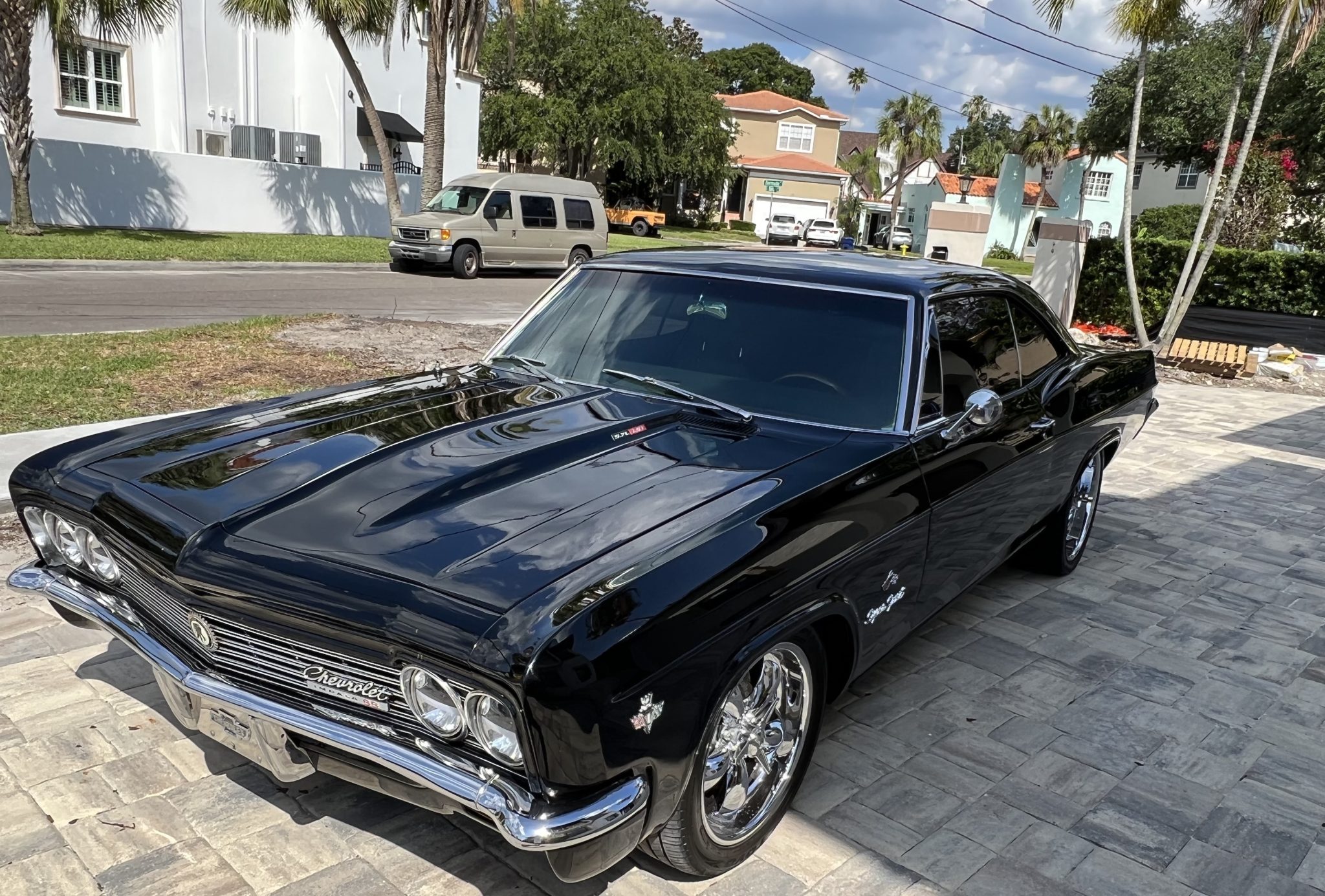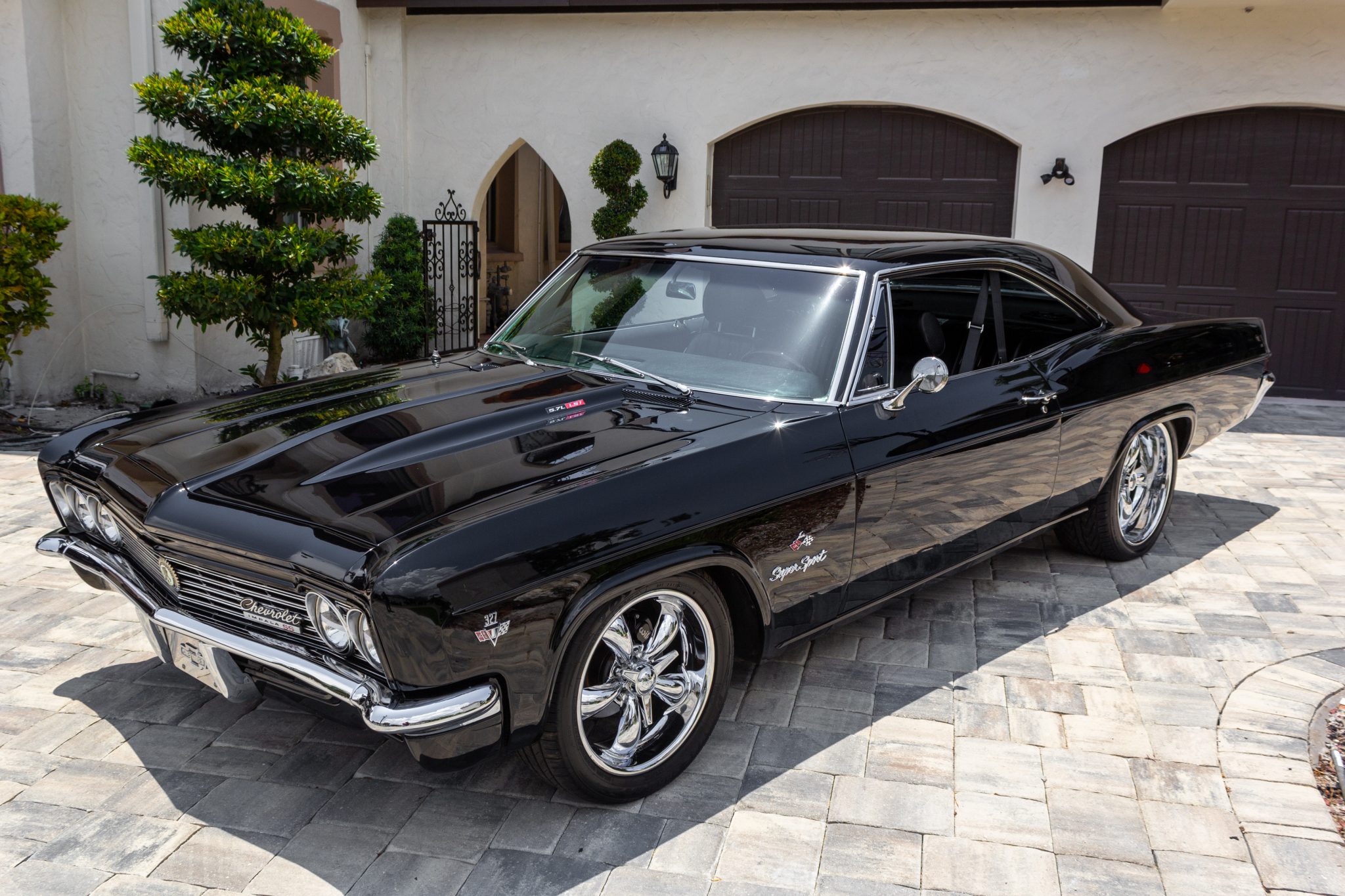 Chrome 20″ wheels are mounted with 275/40 Toyo Proxes Sport tires that show 2020 date codes. The car was fitted with a Ridetech air suspension system and Wilwood four-wheel disc brakes during the 2012 refurbishment.
