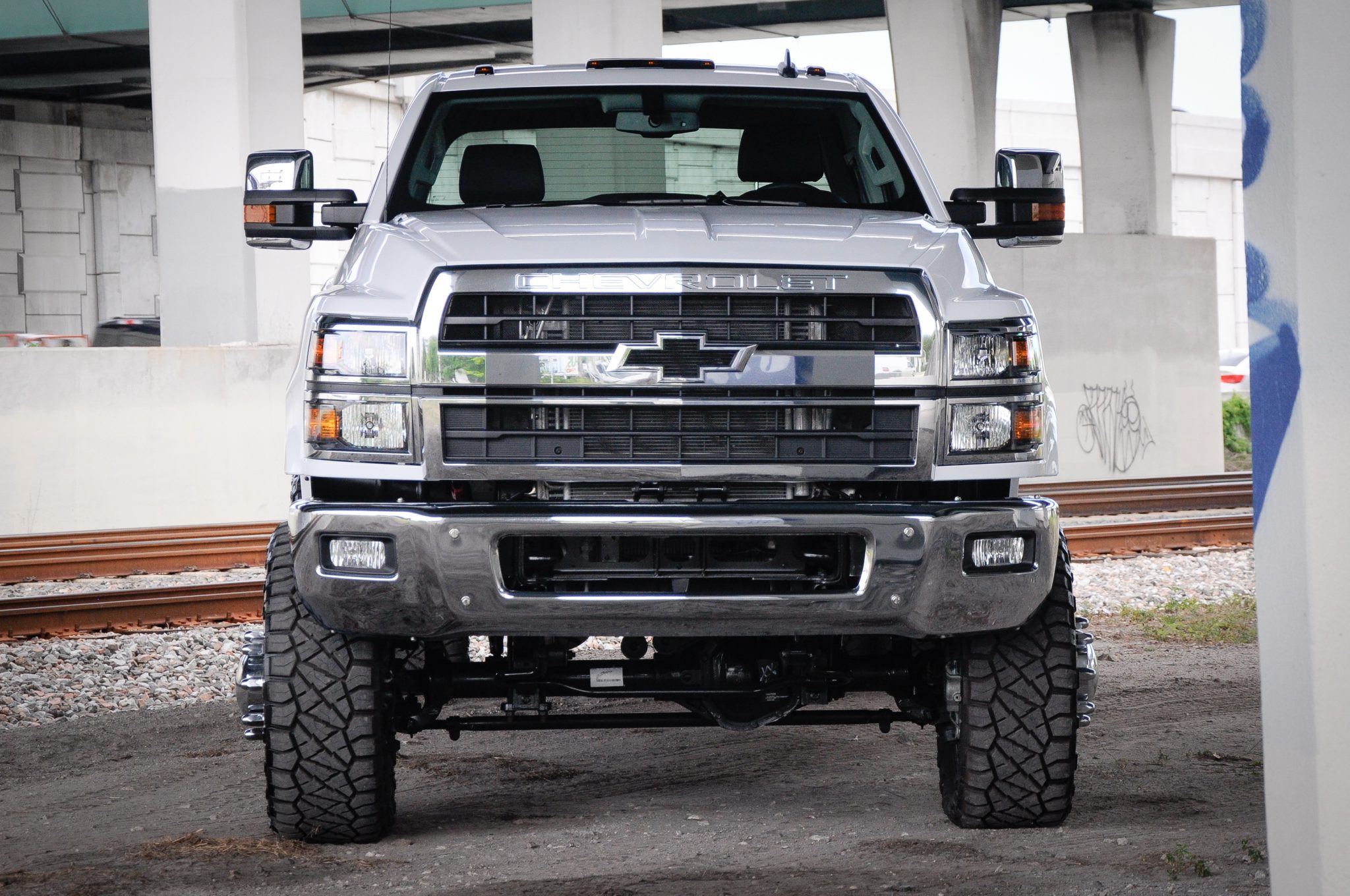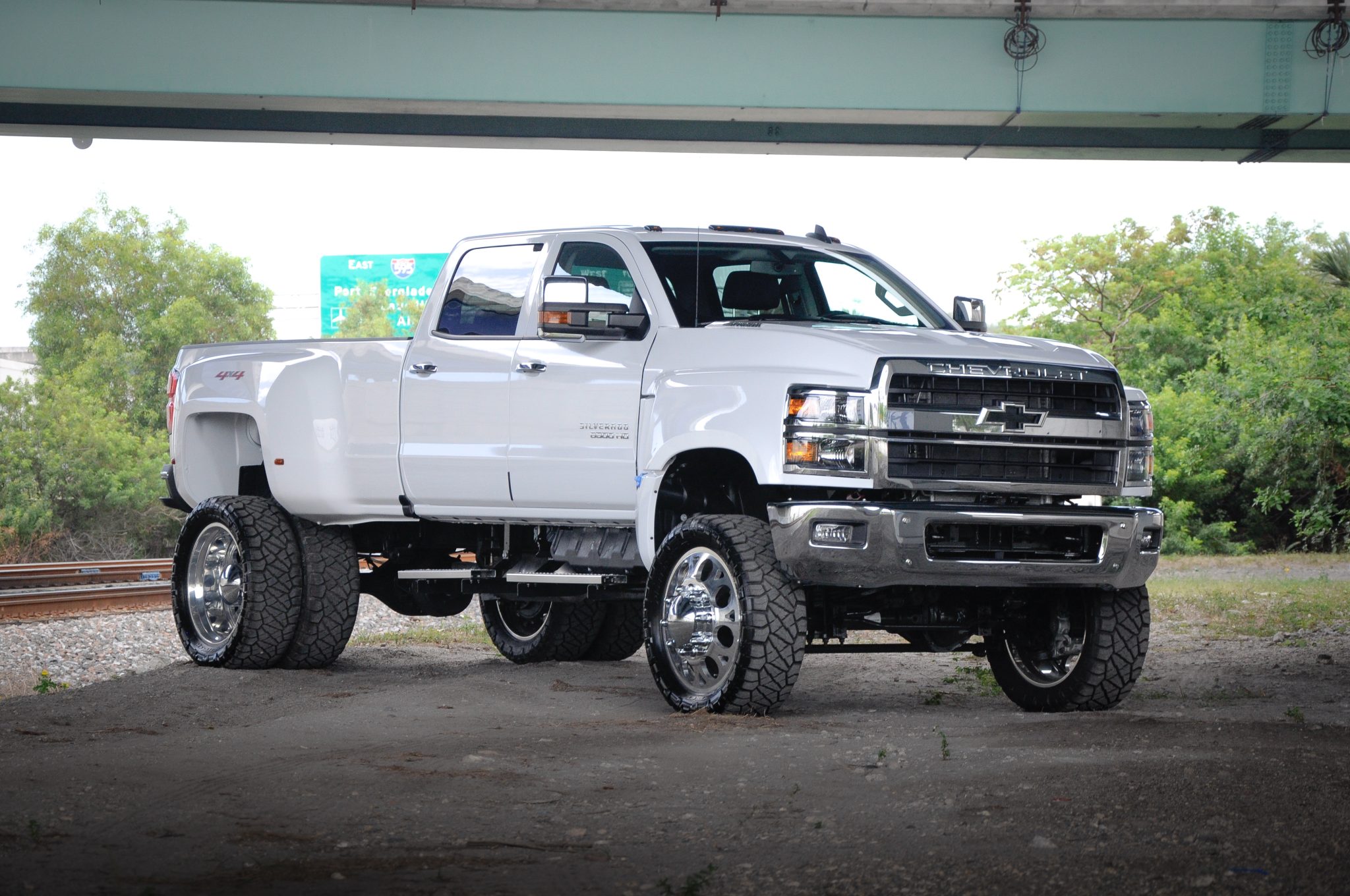 Polished 24” wheels are mounted with 37×10.5” Nitto Ridge Grappler tires. Air shocks are reportedly equipped up front, while the selling dealer notes that one of the factory rear leaf springs was removed out back to lower the ride height. Stopping power is provided by four-wheel disc brakes with an exhaust-brake system. The selling dealer notes that the Stabilitrak warning light illuminates when driving.