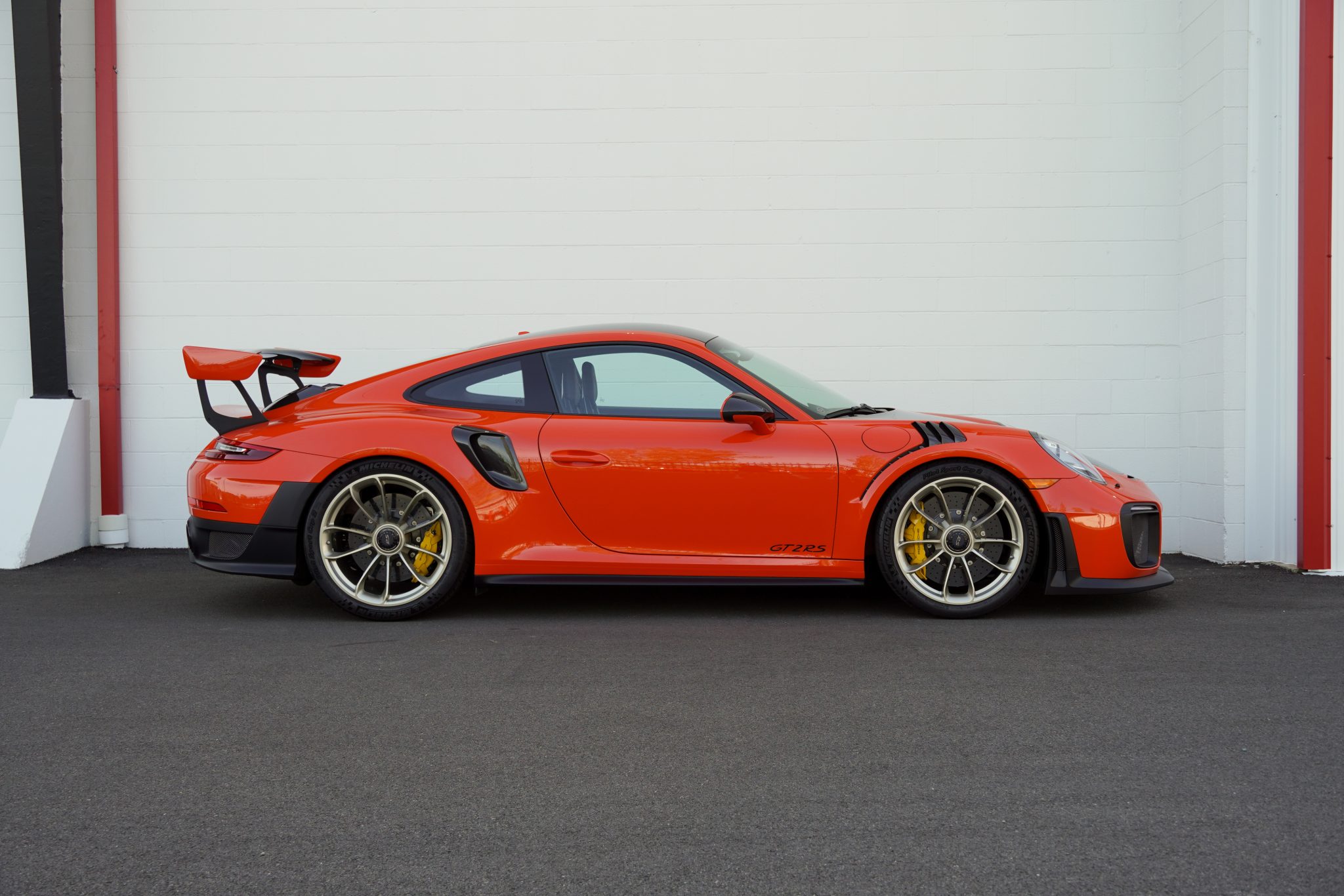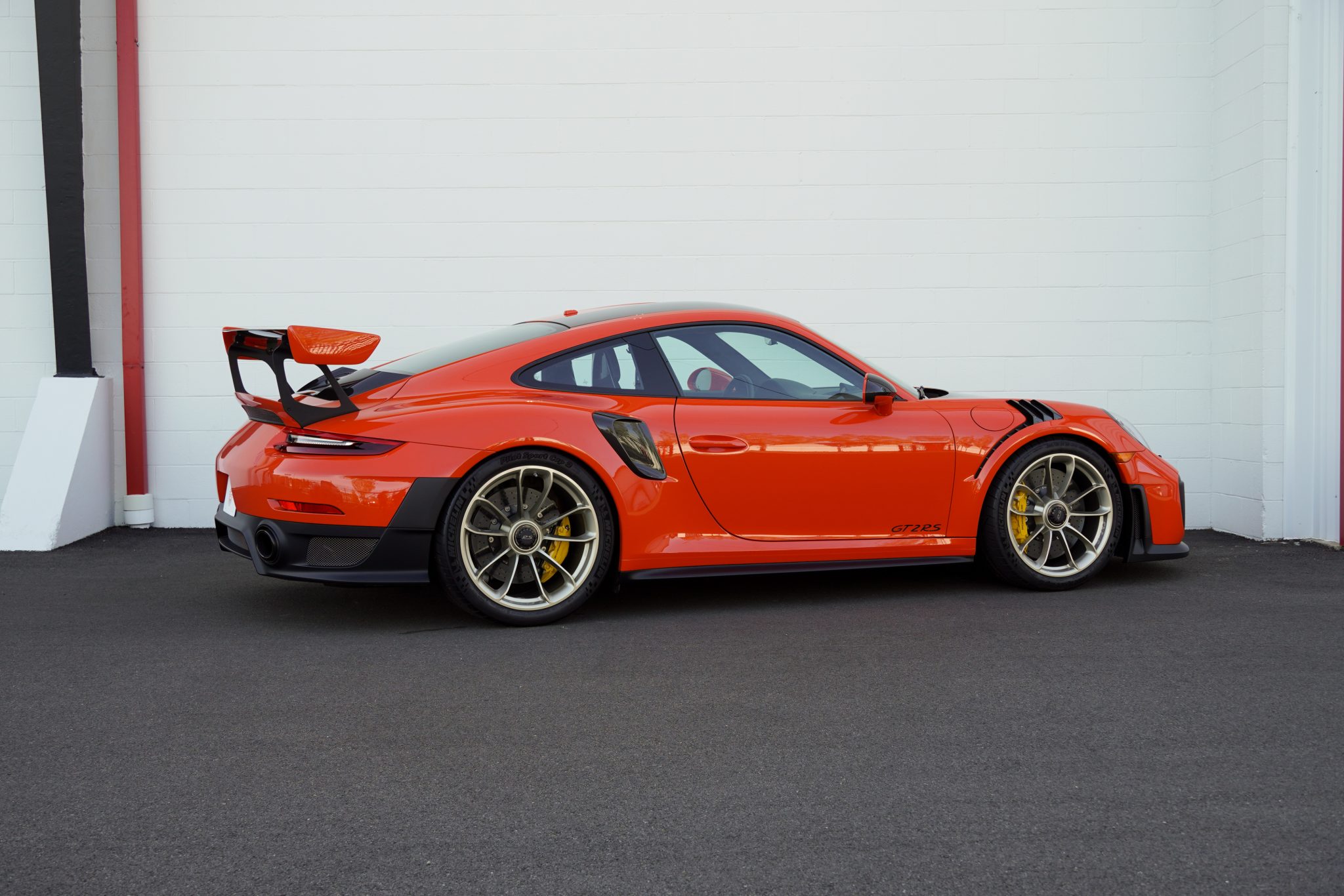 Center-lock 20″ and 21″ wheels are finished in silver and mounted with Michelin Pilot Sport Cup 2 tires with 2018 date codes that measure 265/35 in the front and 325/30 out back. Braking is provided by Porsche Ceramic Composite Brakes (PCCB) with yellow-finished calipers, and this example is fitted with a front-axle lift system.