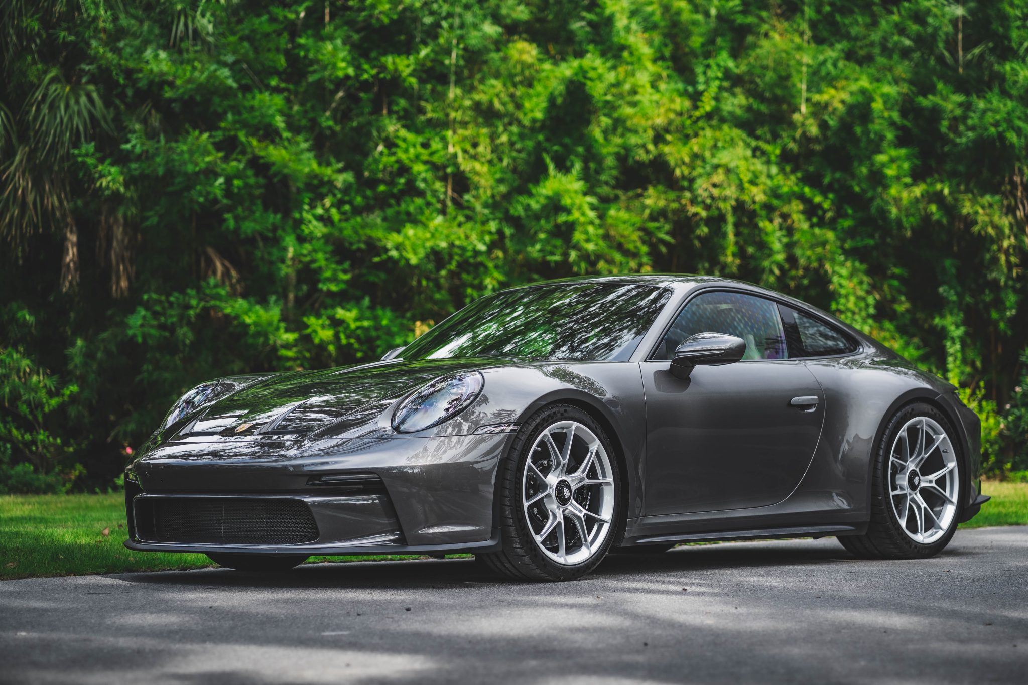 Silver 20″ and 21″ center-lock wheels are mounted with 255/35 front and 315/30 rear Michelin Pilot Sport Cup 2 tires. The car was optioned with a front-axle lift system, and stopping power is provided by a Porsche Ceramic Composite Brake (PCCB) system with black calipers over cross-drilled rotors. A Ceramic Pro ceramic coating has been applied to the wheels.