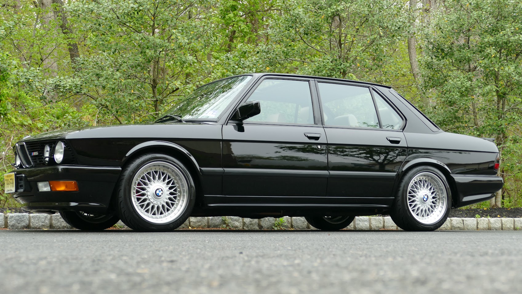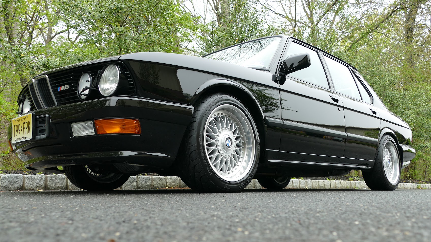 Silver-finished 17″ Style-5 basketweave alloy wheels are mounted with 225/45 Bridgestone G-force tires. E31 850CSi-spec front disc brakes have been added, and the car is equipped with ABS and red-finished calipers. The factory self-leveling rear suspension was removed in lieu of coil springs and shocks by Dinan in 1994. Aftermarket springs and a Racing Dynamics front strut bar have been added.