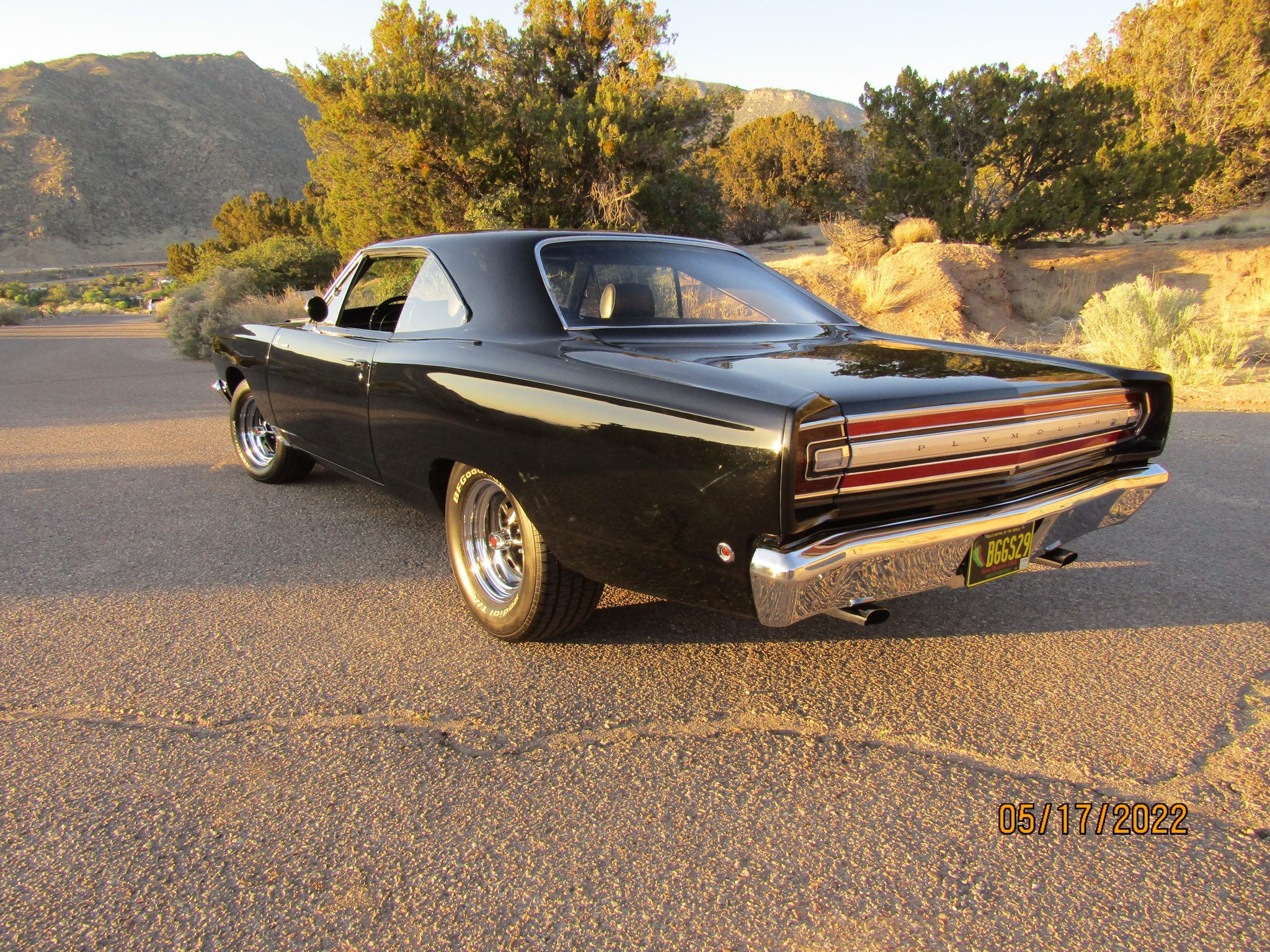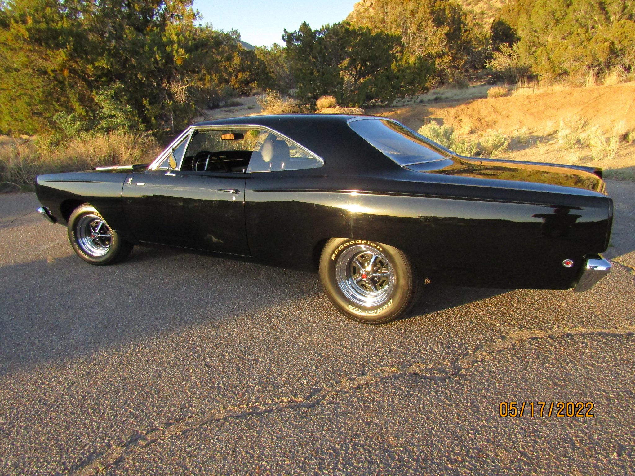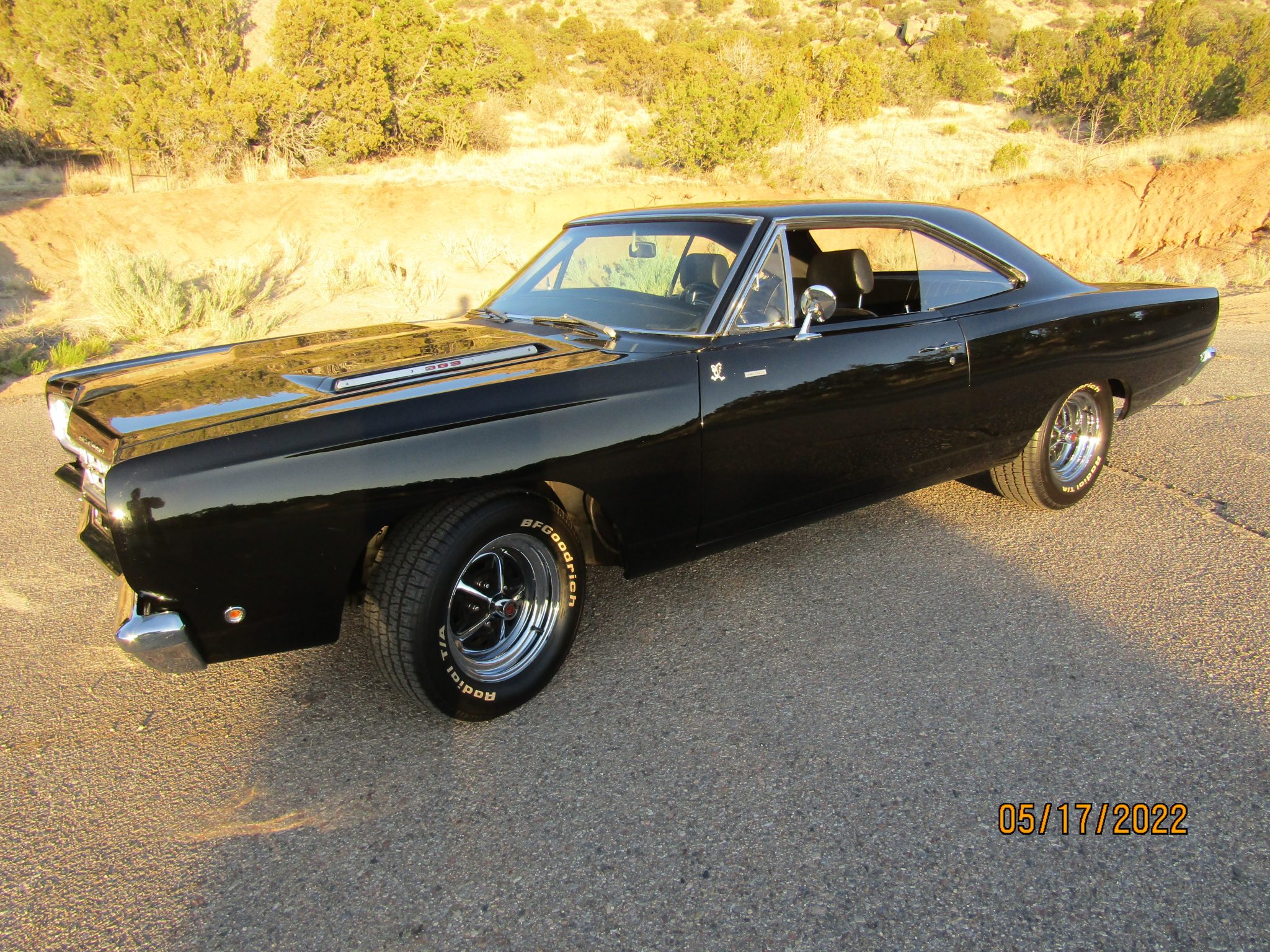 The 15″ Magnum 500-style wheels are mounted with BFGoodrich Radial T/A white-letter tires. A full-size spare is mounted in the trunk. The car is equipped with power steering and KYB shock absorbers. Braking is handled by unassisted front discs and rear drums.