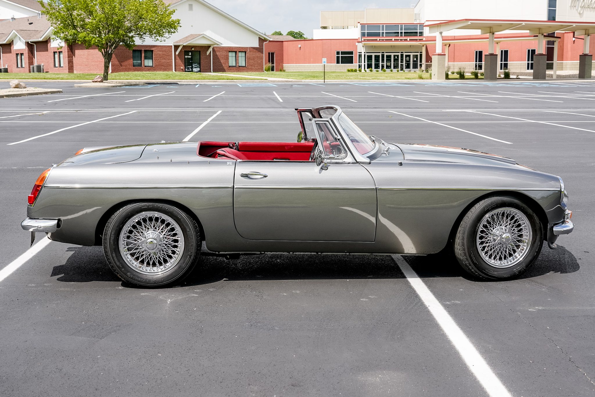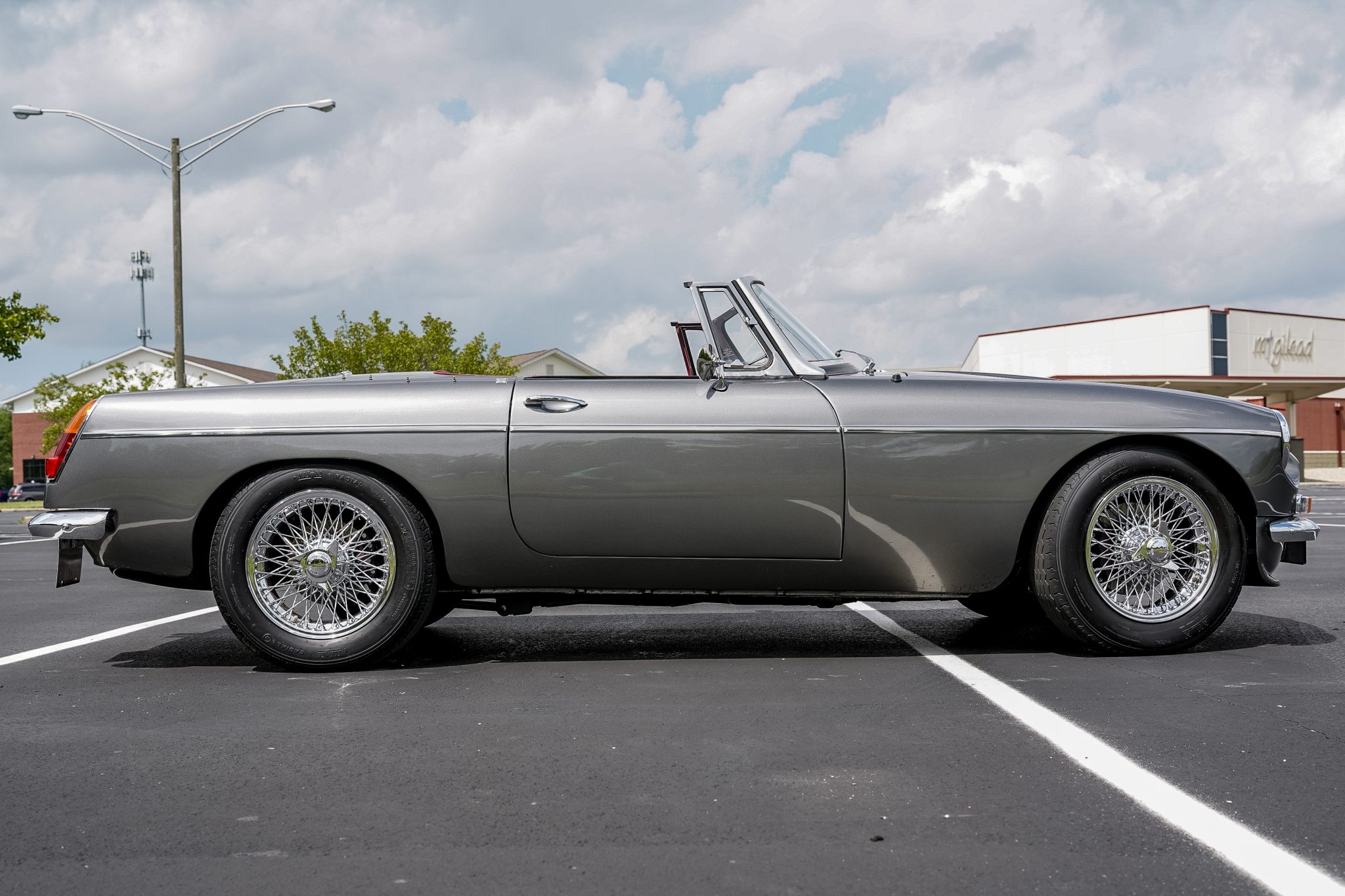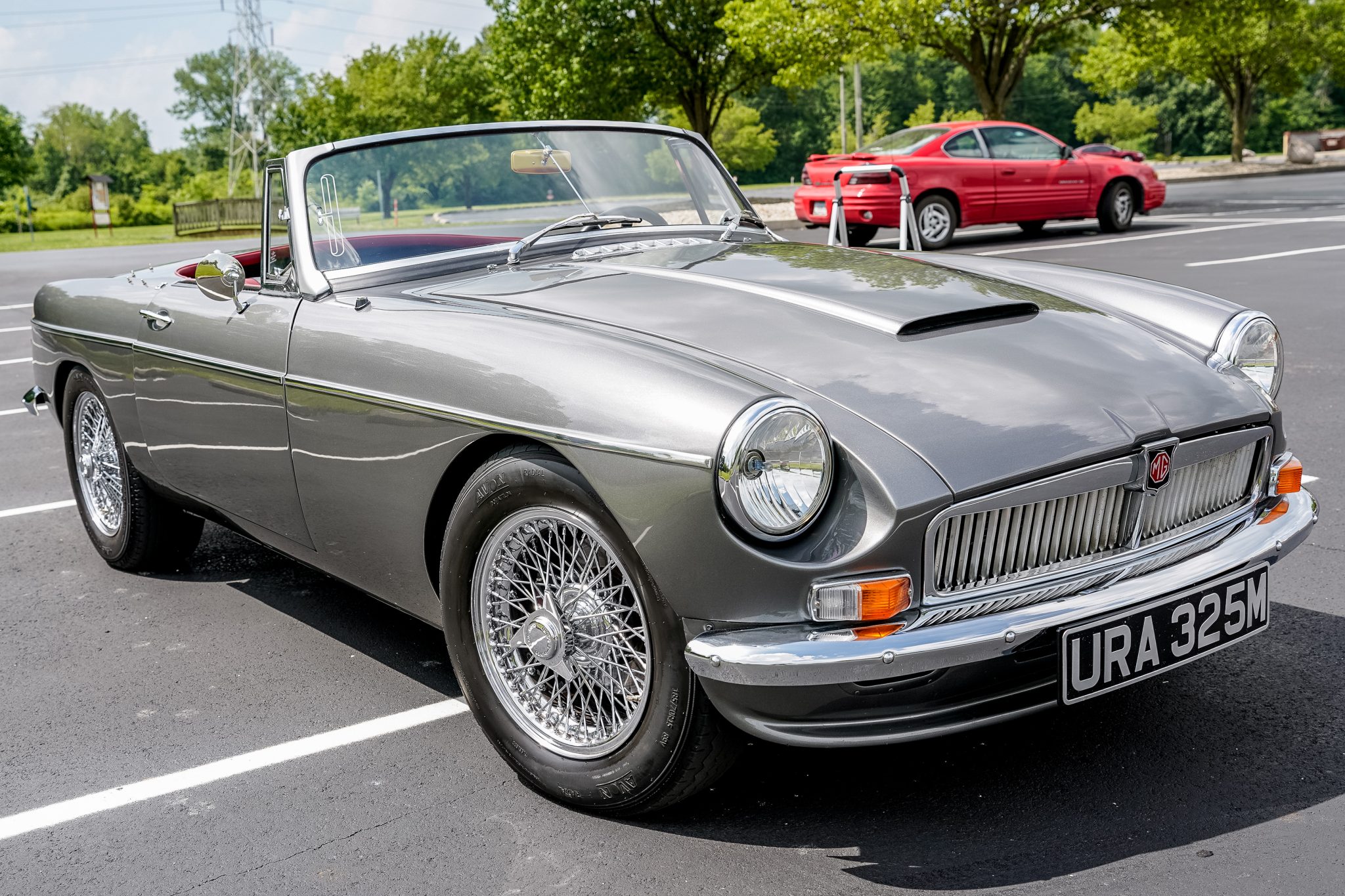 Chrome 15″ wire wheels are secured by three-lobe knock-offs and are mounted with Avon Radial CR6ZZ tires sized 185/70 up front and 215/60 out back. The suspension is modified with aluminum front uprights and tubular wishbones, a six-link live rear axle, and adjustable coilovers at all four corners. Braking is provided by Frontline-branded multi-piston calipers over four-wheel ventilated discs along with stainless-steel brake lines.