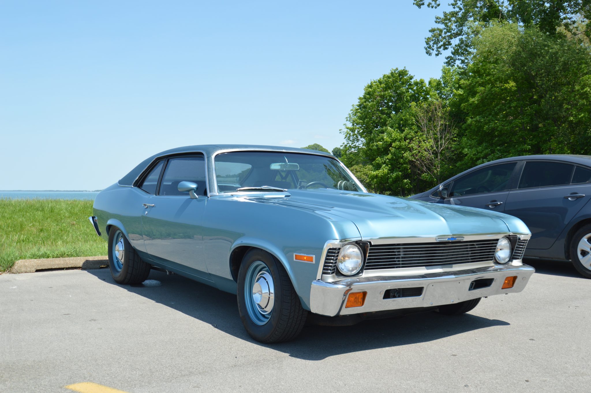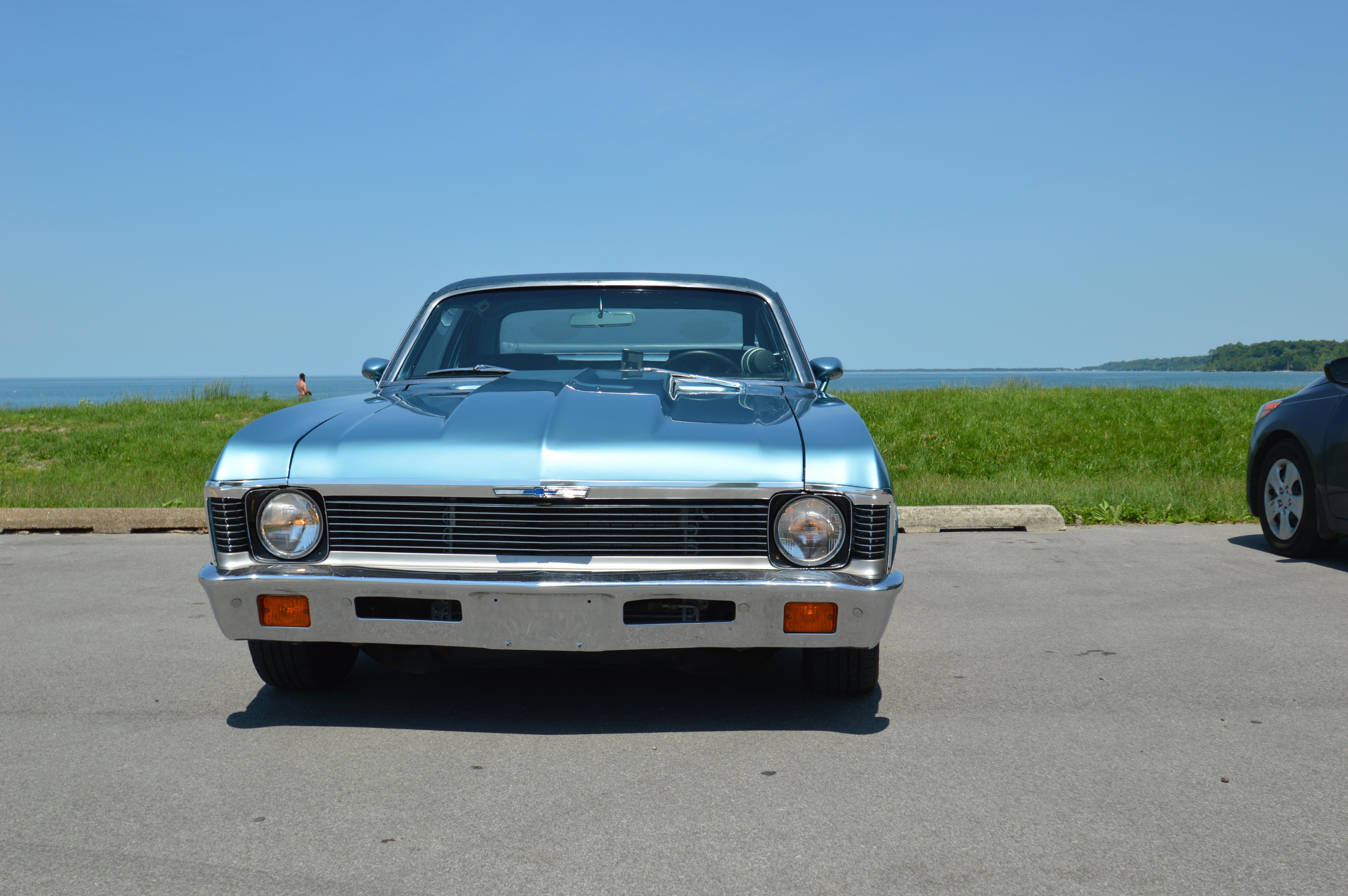 Blue-painted 14″ front and 15″ rear steel wheels with chrome hubcaps wear 195/70 Douglas All-Season and 275/60 Nitto NT555R Extreme Drag tires, respectively. The car is equipped with adjustable Cal-Trac rear traction bars, power steering, and power-assisted front disc brakes. The seller states that Hotchkis front and rear sway bars, front lowering springs, and 2″ front drop spindles have also been installed.