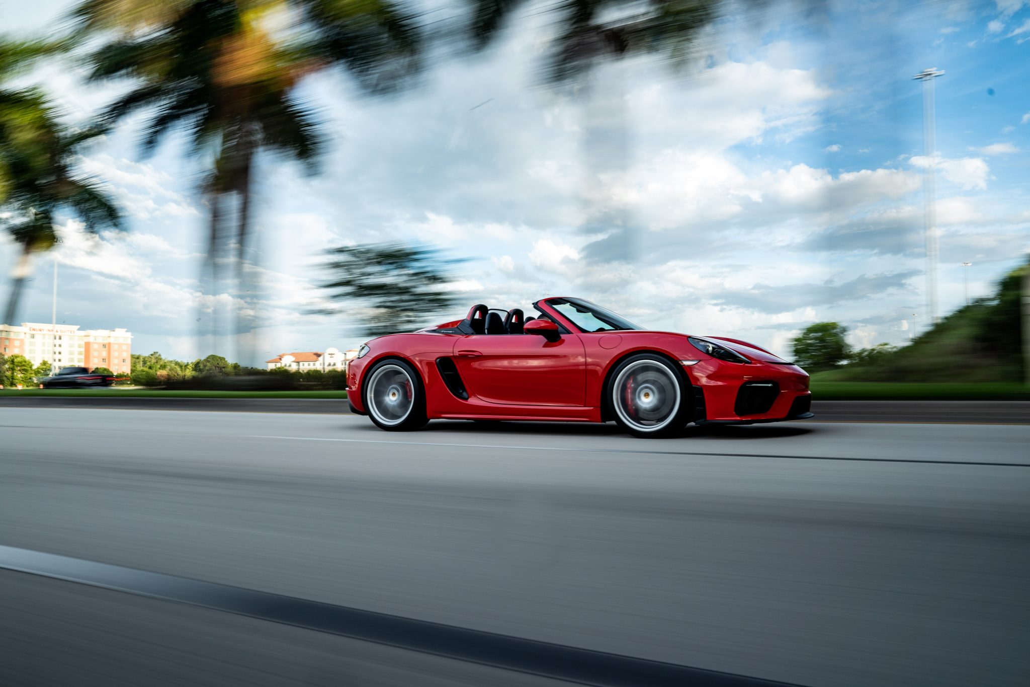 Silver-finished 20″ alloy wheels wear Porsche-crest center caps and are mounted with Michelin Pilot Sport Cup 2 tires that were installed in June 2022 and measure 245/35 up front and 295/30 out back. Stopping power is provided by red Porsche-script calipers over cross-drilled rotors at all four corners, and the car is equipped with front billet wheel spacers.