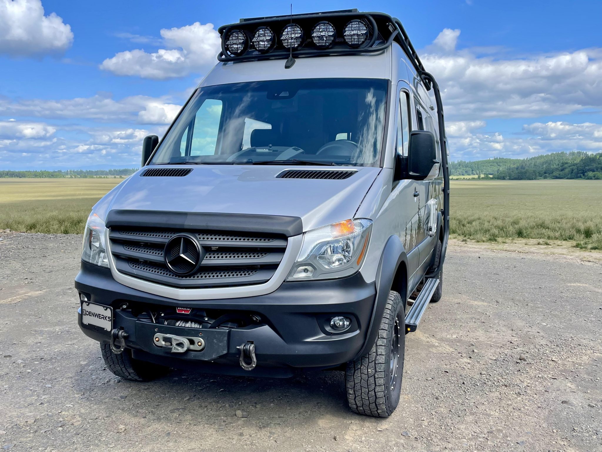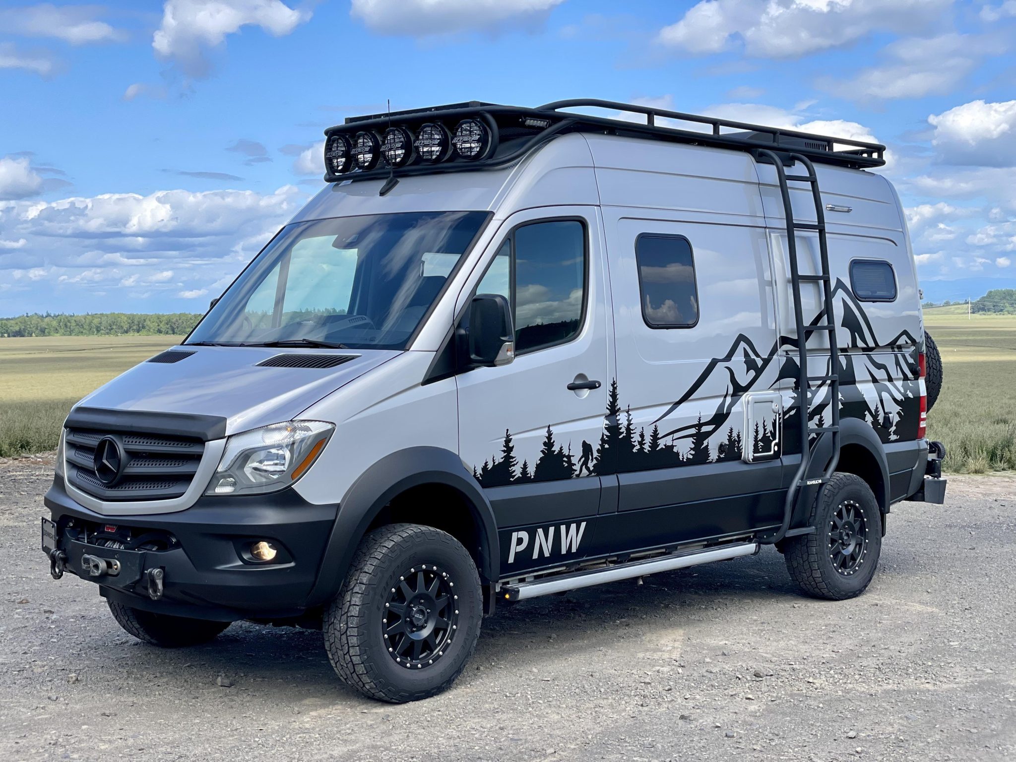 Black-finished 17” Method Race wheels are wrapped in 275/70 Cooper Discoverer AT3 tires showing 2019 date codes, and a matching spare is mounted to the rear swing-away carrier. The van is equipped with a suspension lift, Fox 2.0 Performance Series shock absorbers, and four-wheel disc brakes.