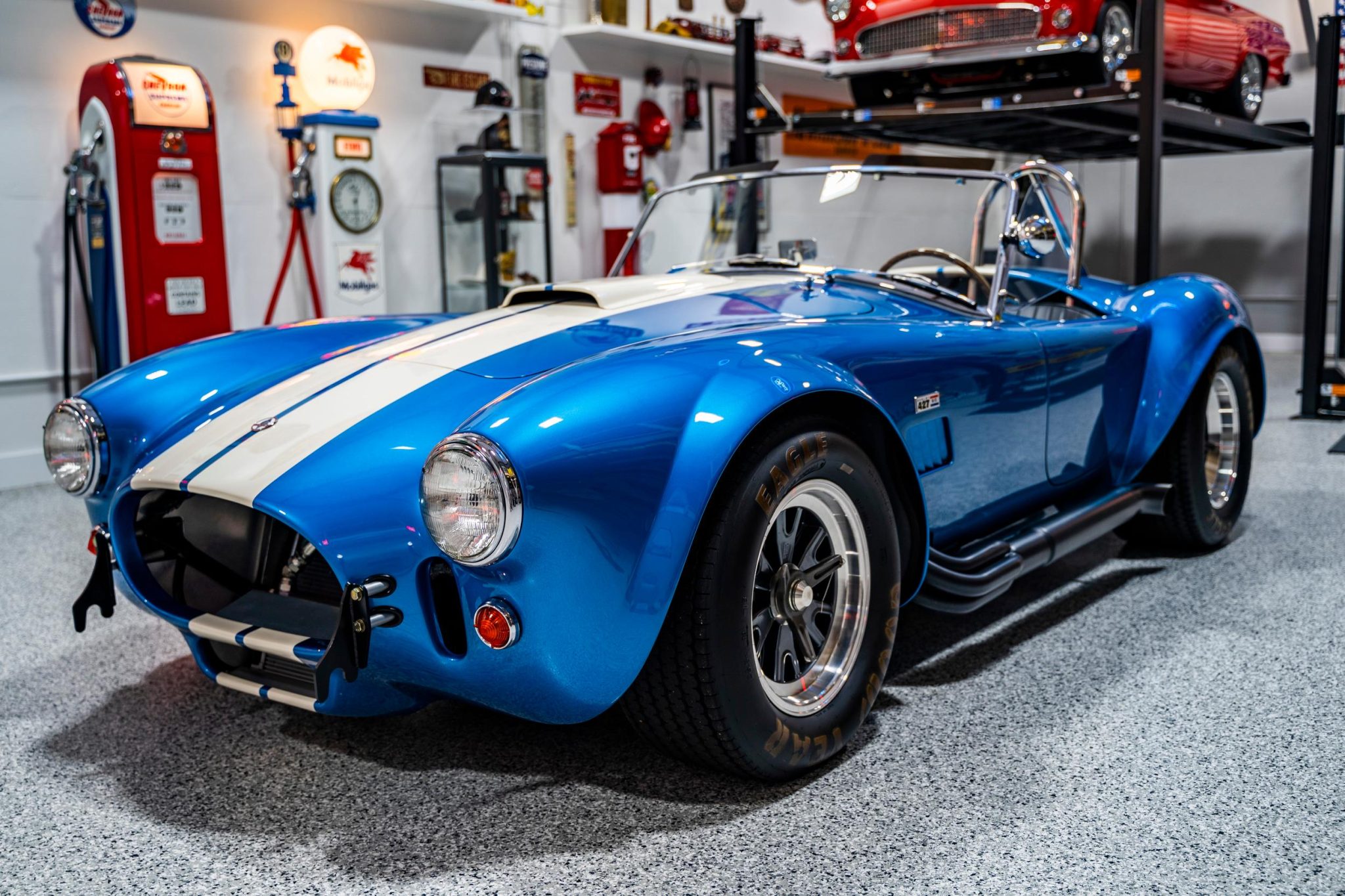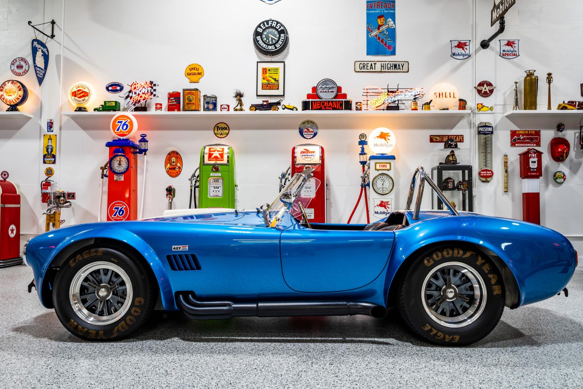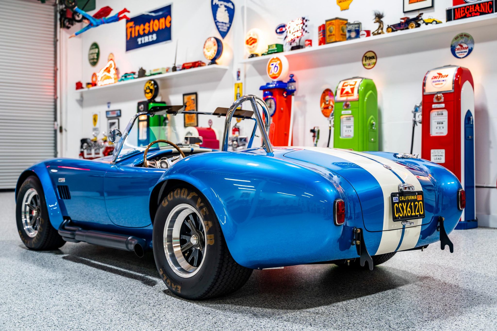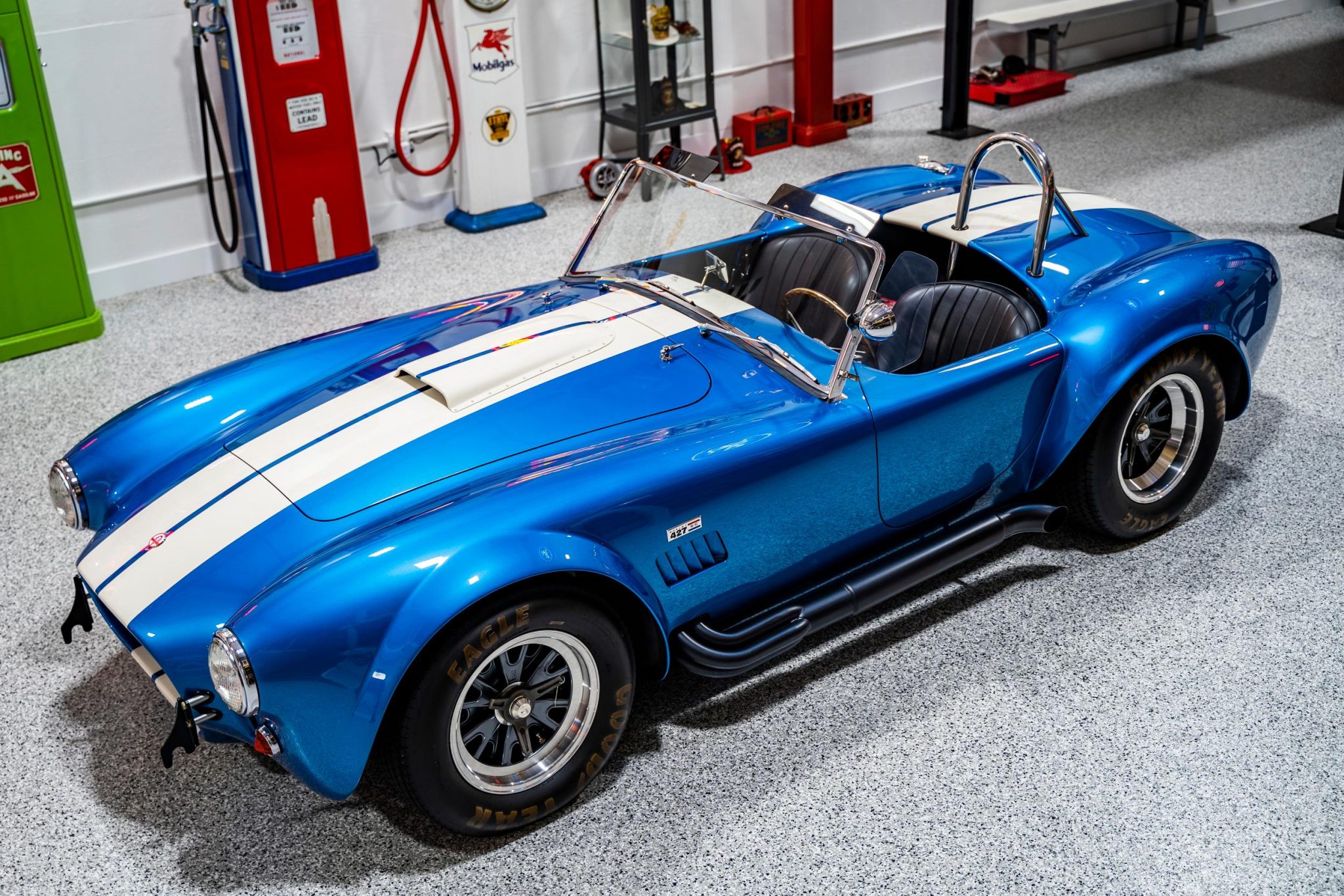 Staggered-width 15″ Shelby Trigo wheels are mounted with knock-off spinners and wear Goodyear Eagle tires with raised lettering. The car is fitted with Bilstein adjustable coilovers at all four corners, and stopping power is provided by Wilwood four-wheel disc brakes. The front swaybar bushings are said to have been replaced in 2022.