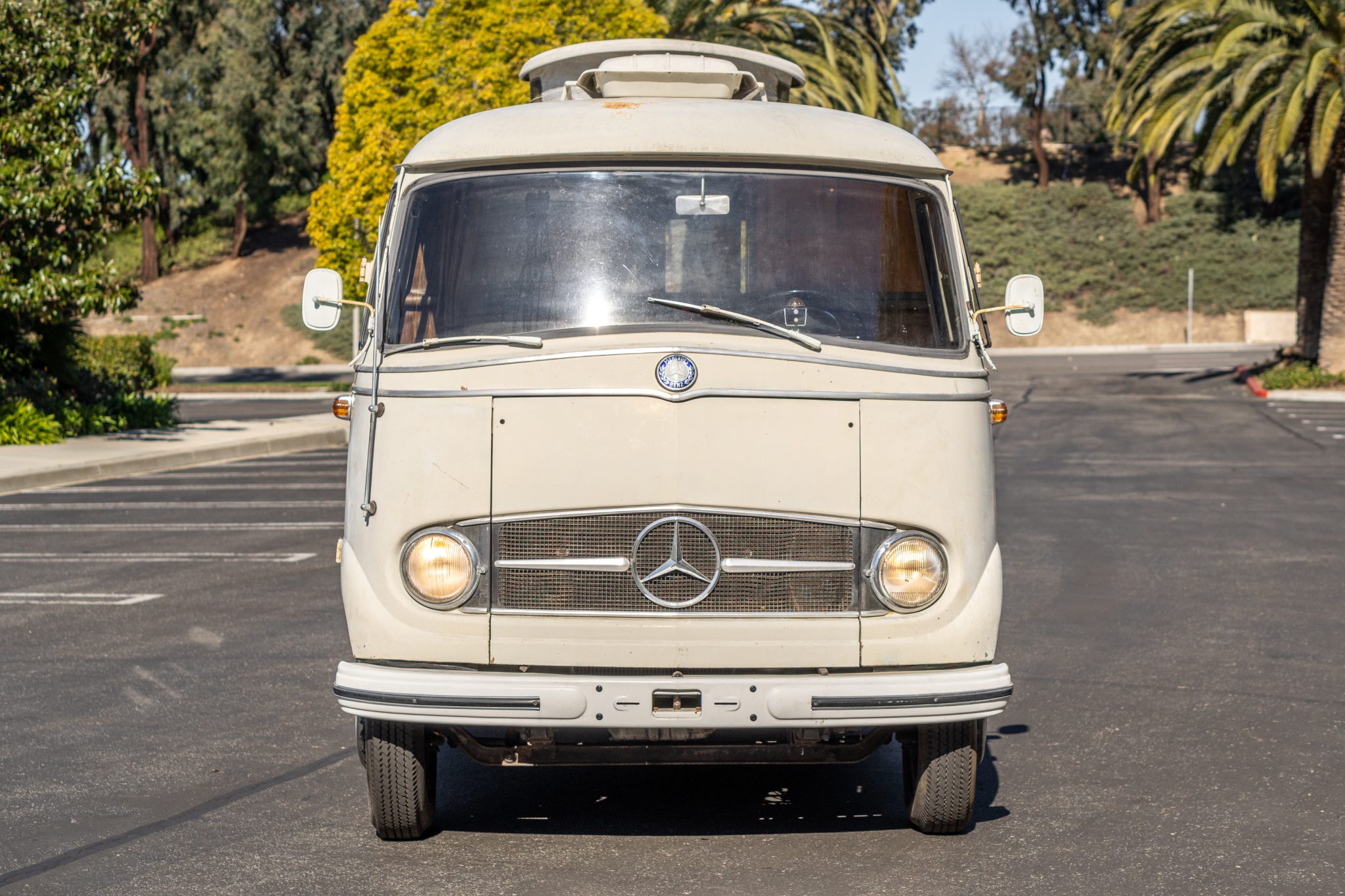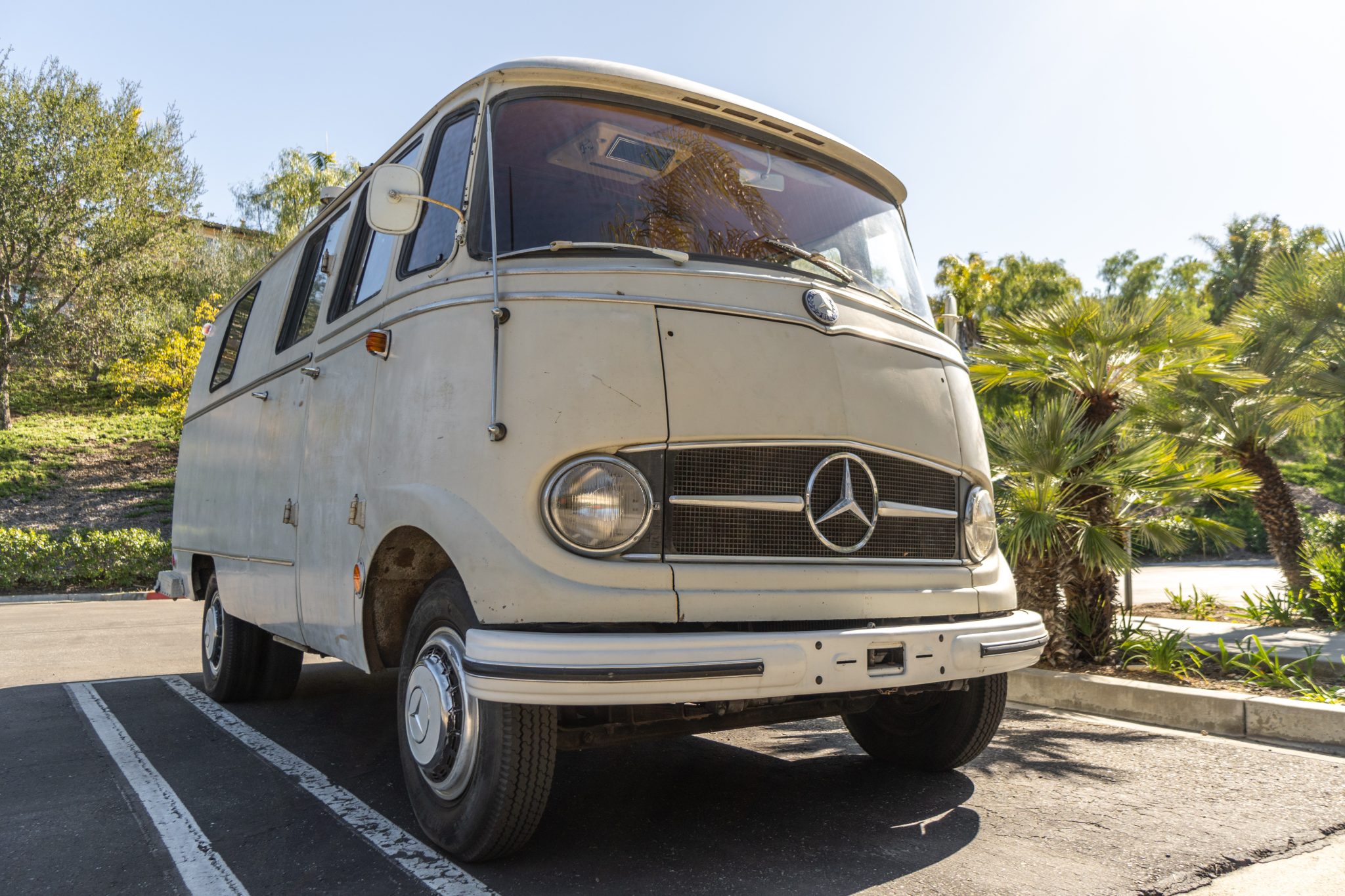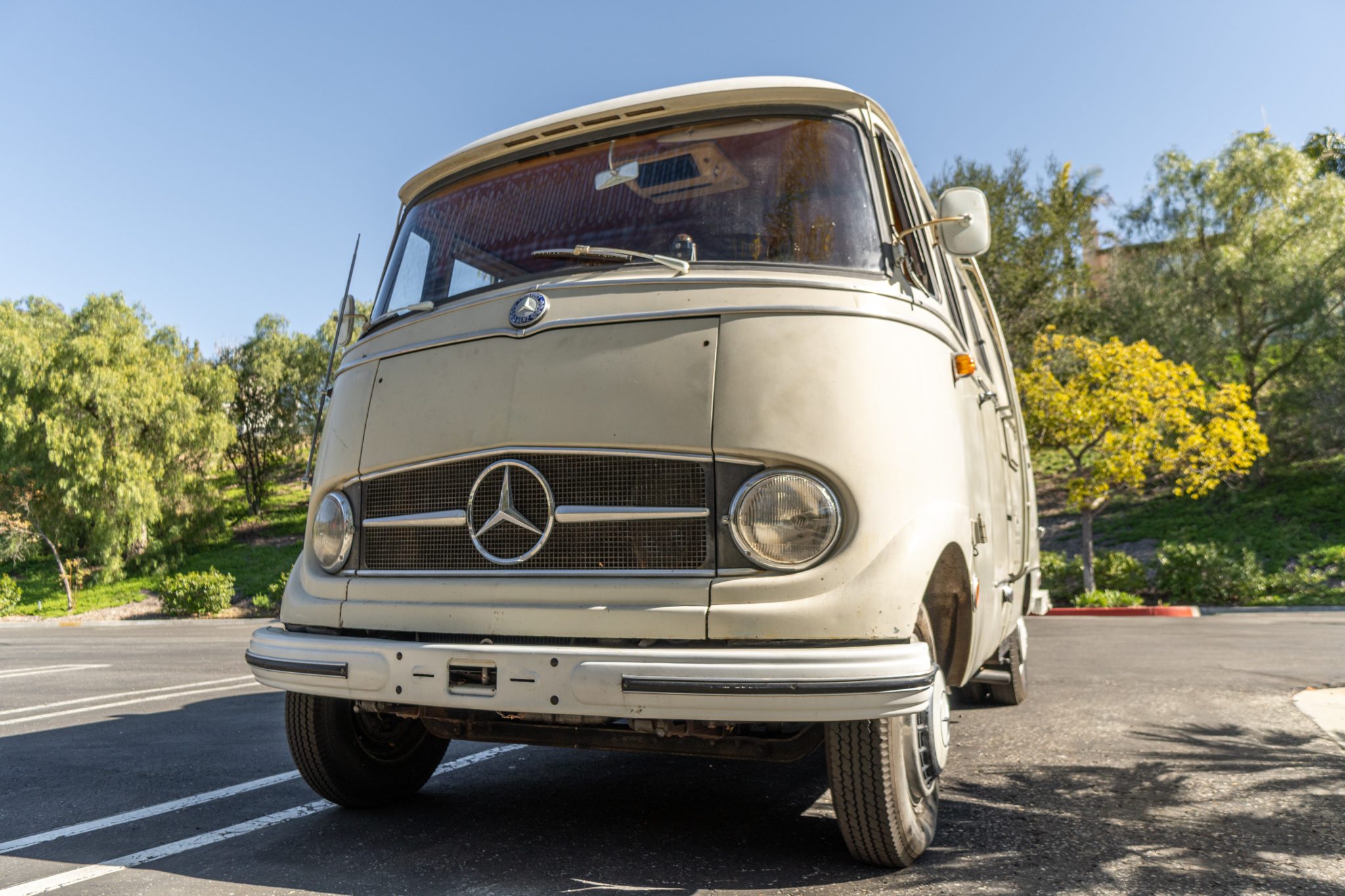 Steel 16″ wheels wear body-color covers and are mounted with a mixed set of 6.00-16″ Continental and Nankang tires, with dual wheels on each side out back. Dry rot is visible on the tires, and a spare is mounted to the right rear door. Stopping power is provided by four-wheel drums.