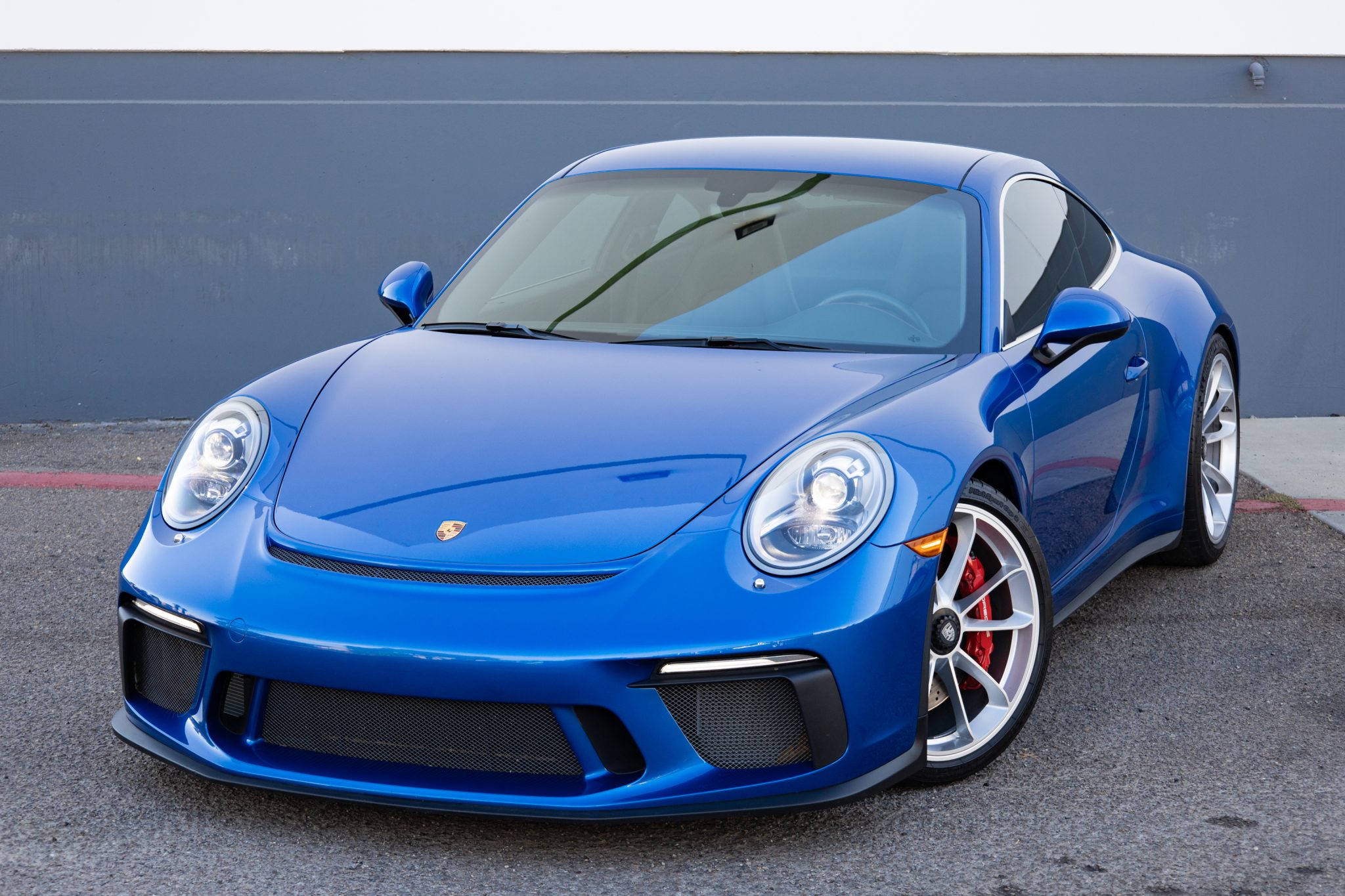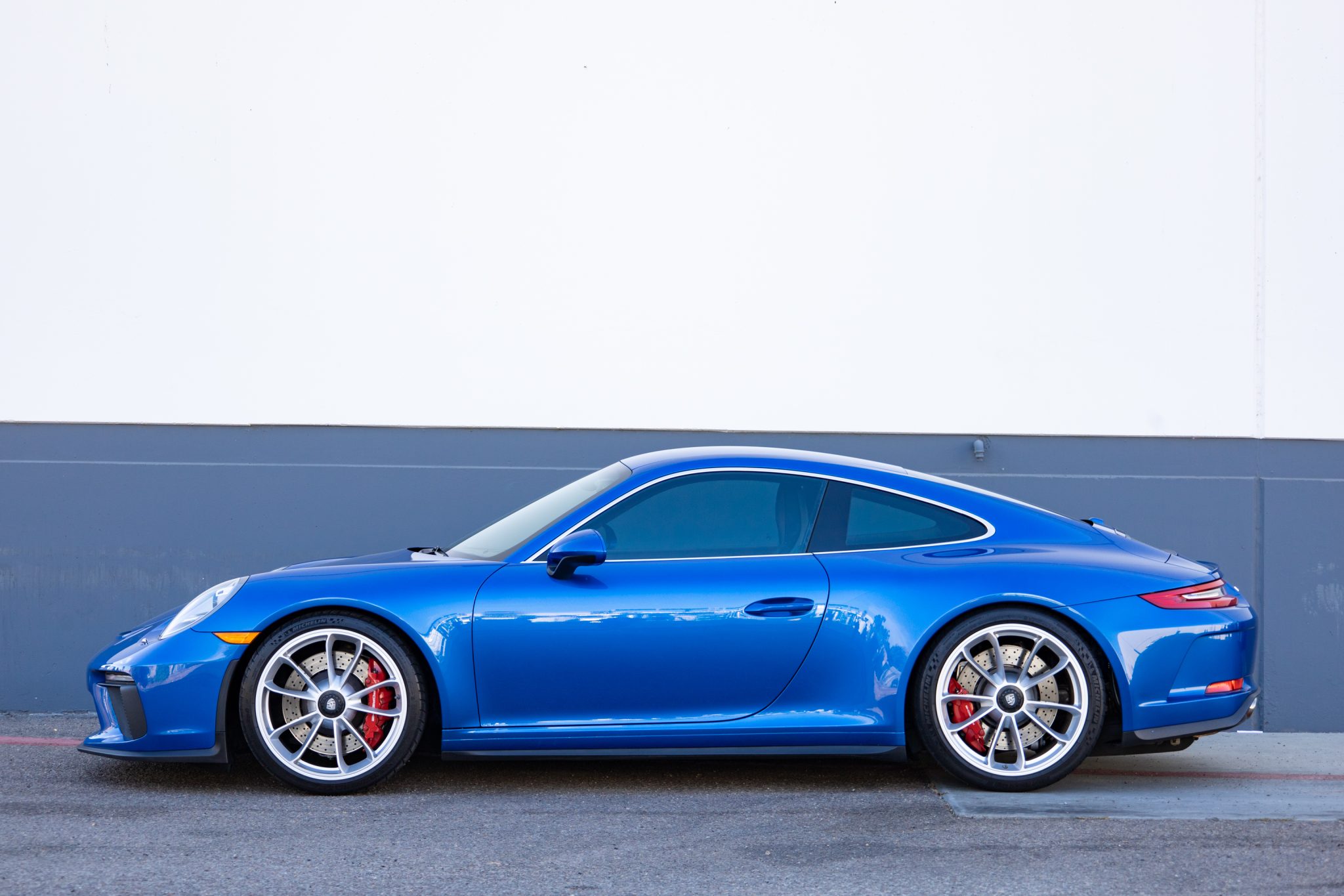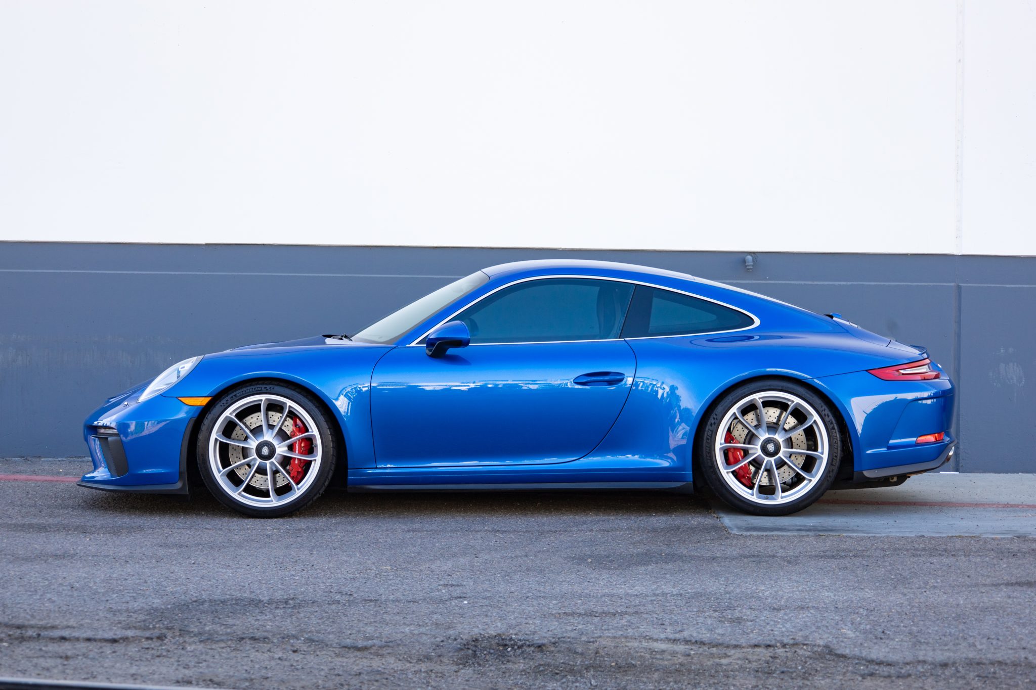 Silver 20″ center-lock alloy wheels are mounted with Michelin Pilot Sport Cup 2 tires measuring 245/35 up front and 305/30 at the rear. Rear-axle steering was standard on the GT3, and braking is handled by red Porsche-branded calipers over cross-drilled and ventilated discs.