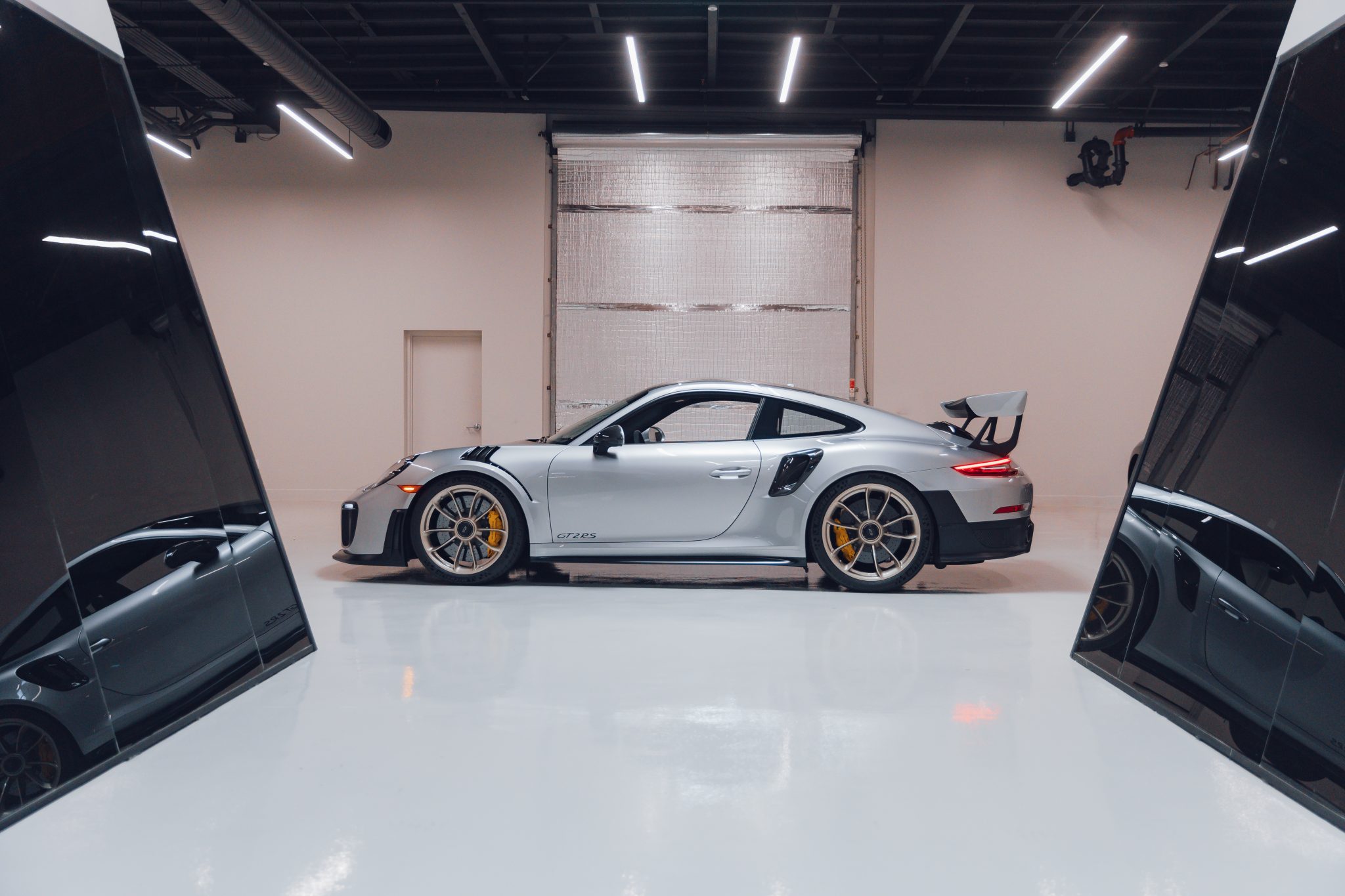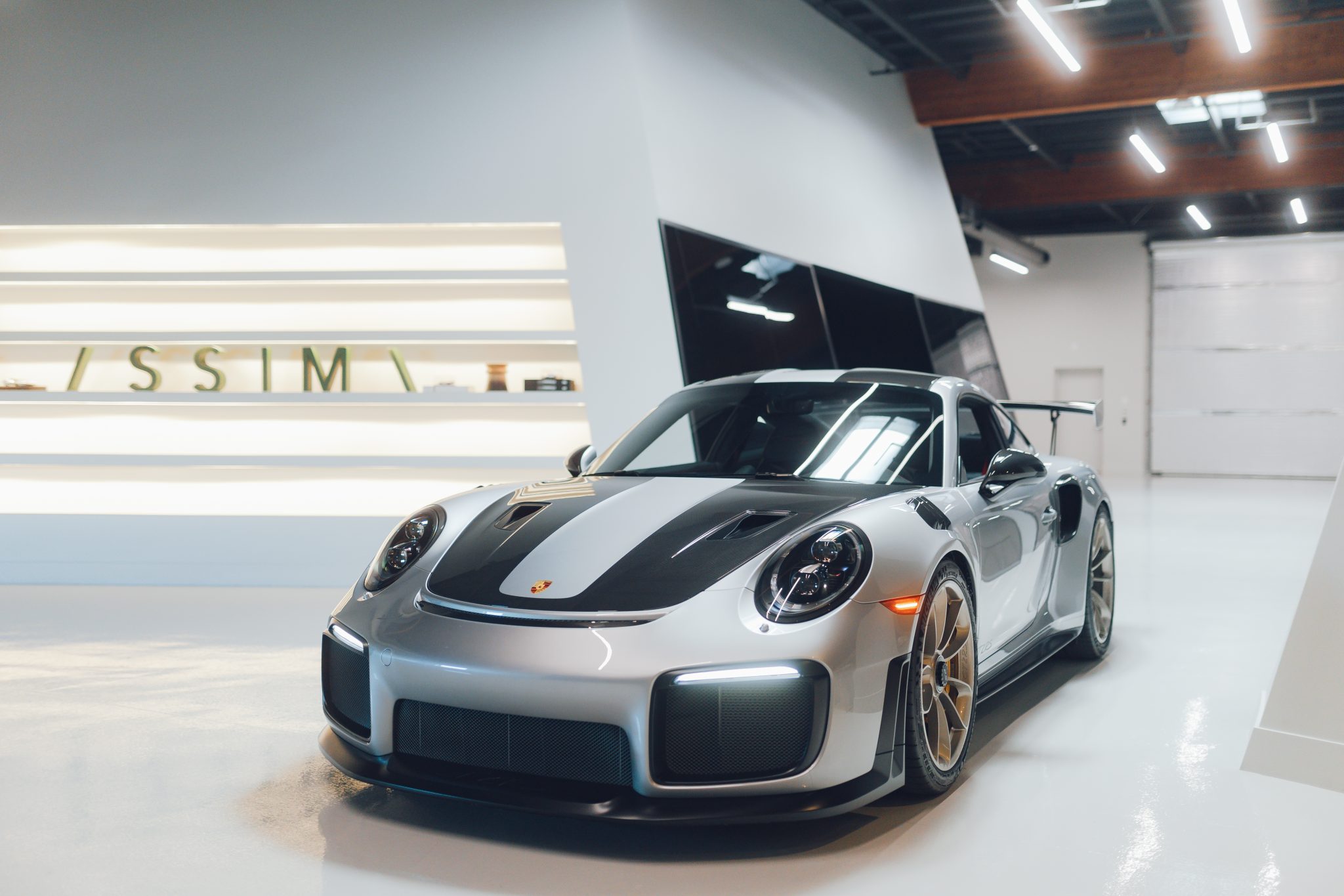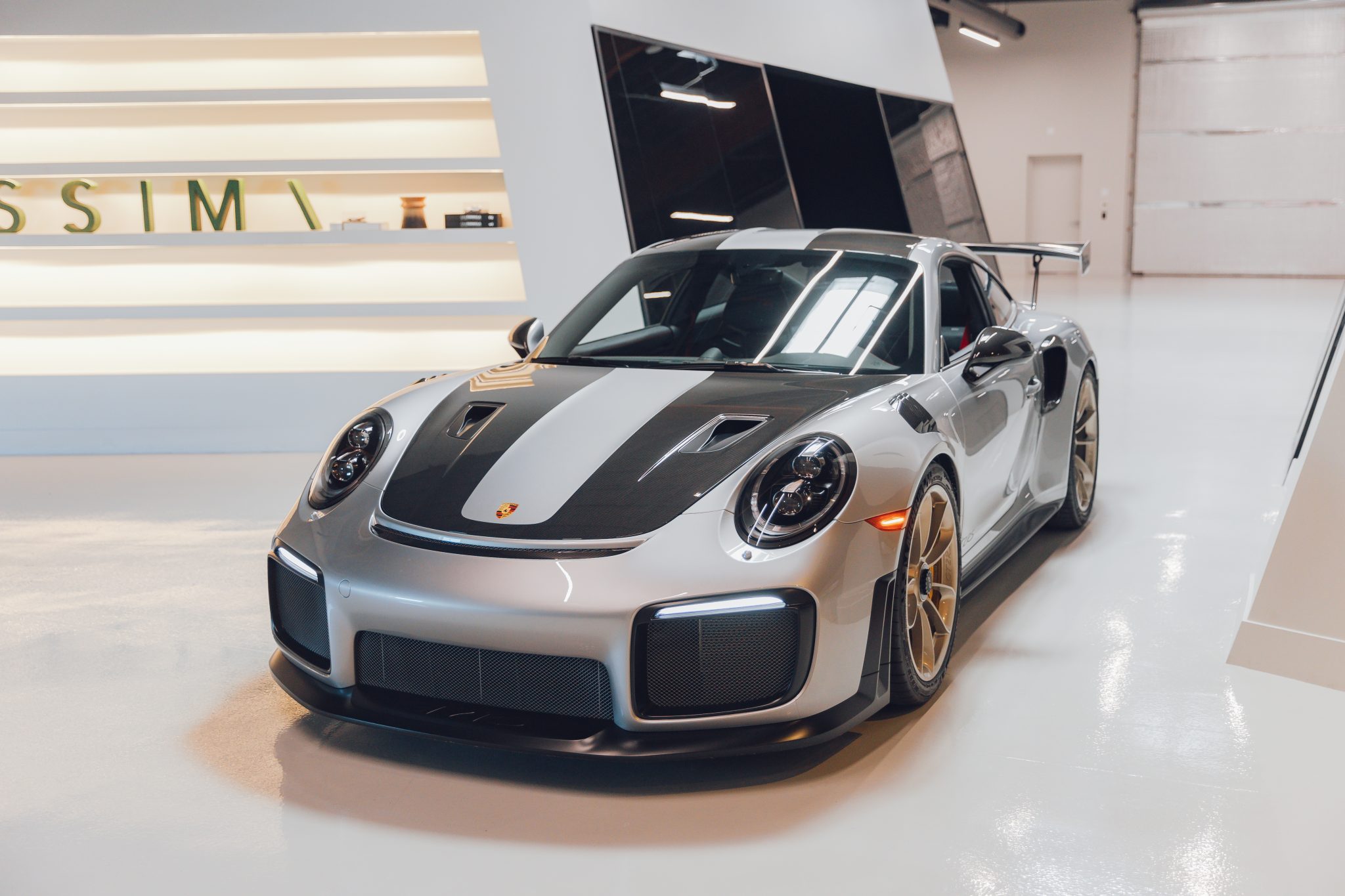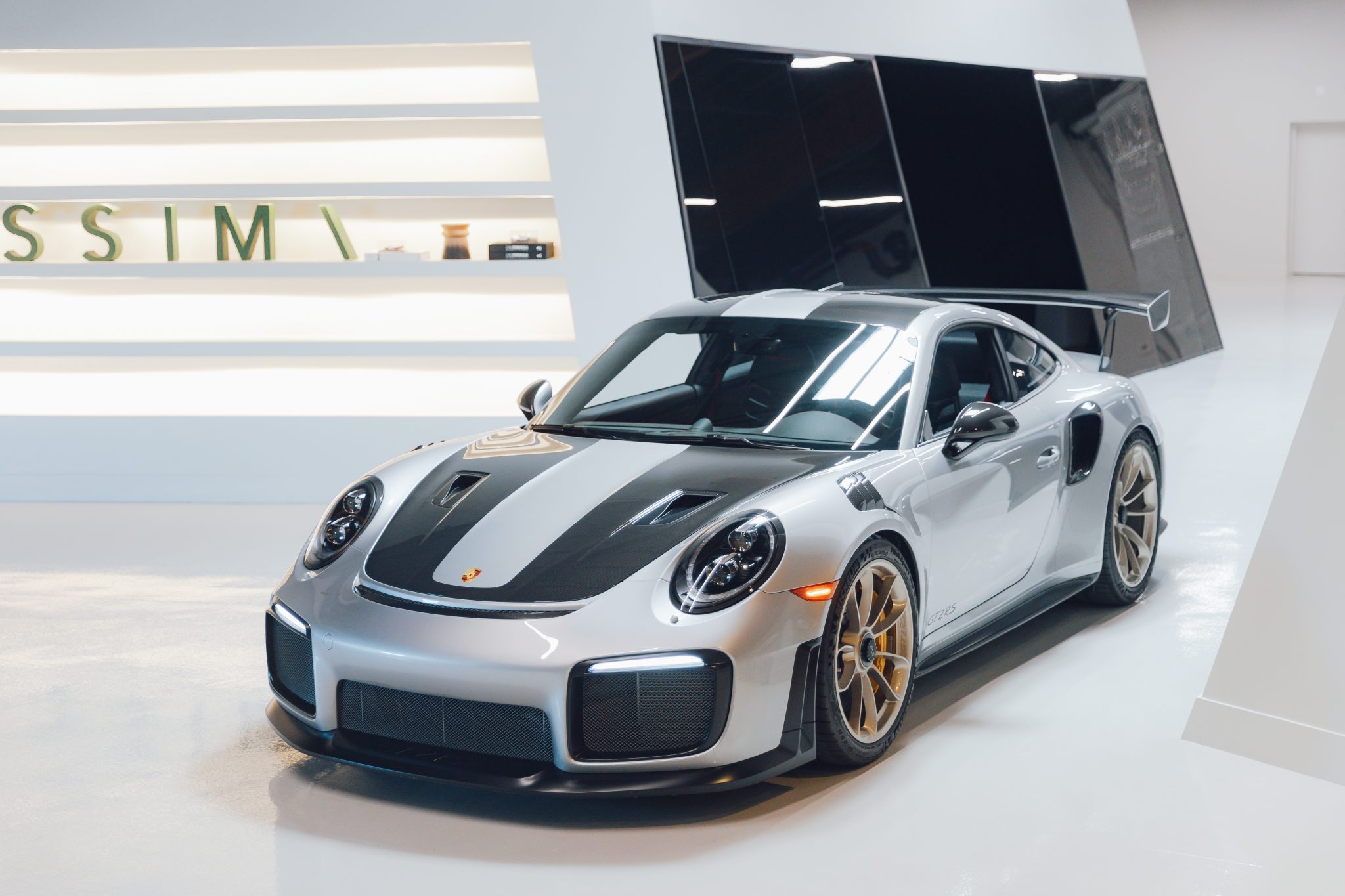 Center-locking wheels measure 20″ up front and 21″ out back, and are mounted with Michelin Pilot Sport Cup 2 tires measuring 265/35 and 325/30, respectively. The Porsche Ceramic Composite Brake system employs yellow six-piston front and four-piston rear calipers, and the GT2 RS suspension utilizes ball joints in place of bushings to allow for individually adjustable ride height, camber, caster, and toe. The Weissach package adds carbon-fiber sway bars and end links.