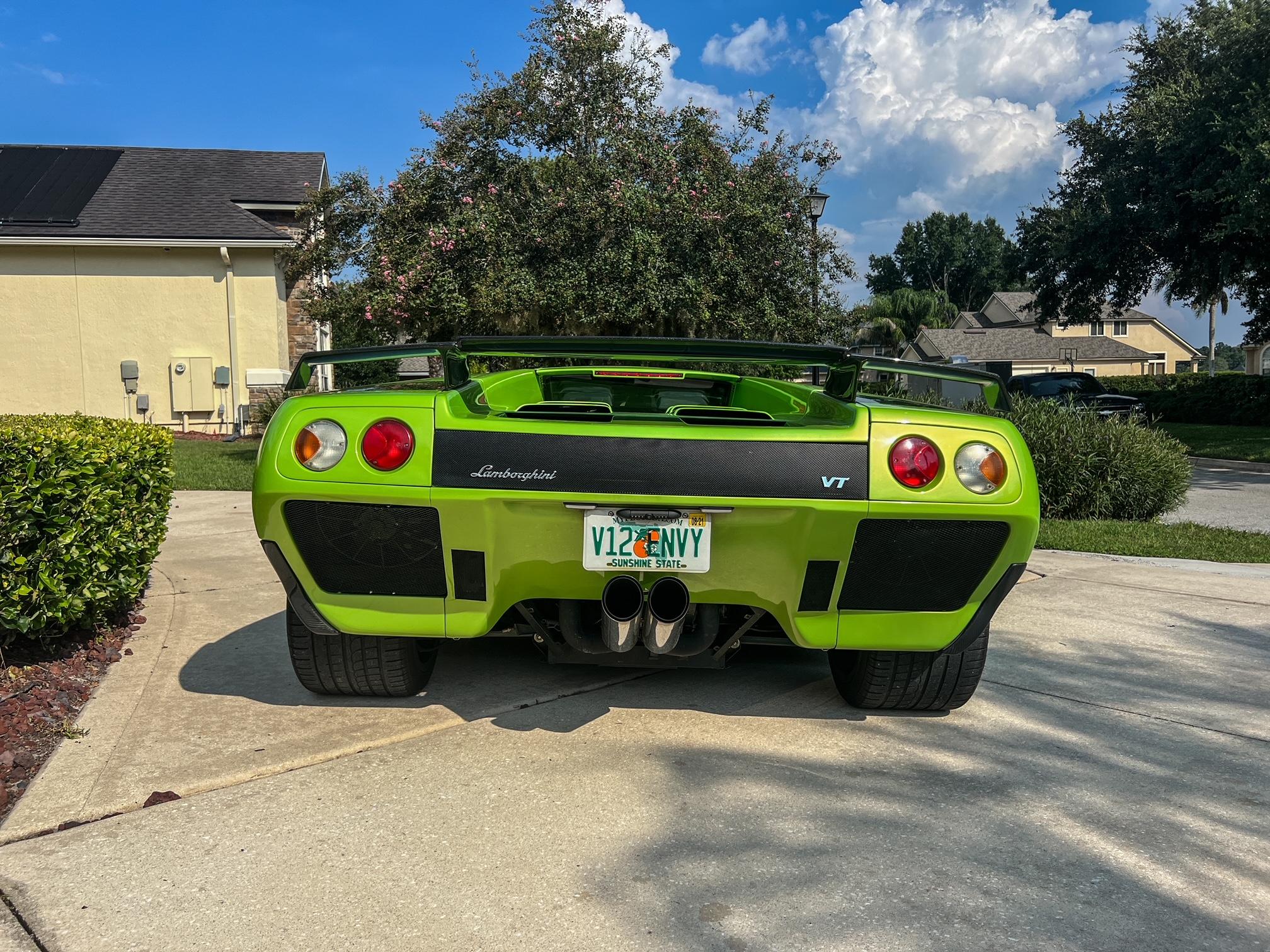 The factory 18″ magnesium wheels were powder-coated black in February 2015. They wear Lamborghini center caps and are mounted with 245/35 front and 335/30 rear Pirelli P Zero Rosso tires showing 2009 and 2014 date codes. Stopping power is provided by green servo-assisted multi-piston Brembo calipers over cross-drilled rotors.
