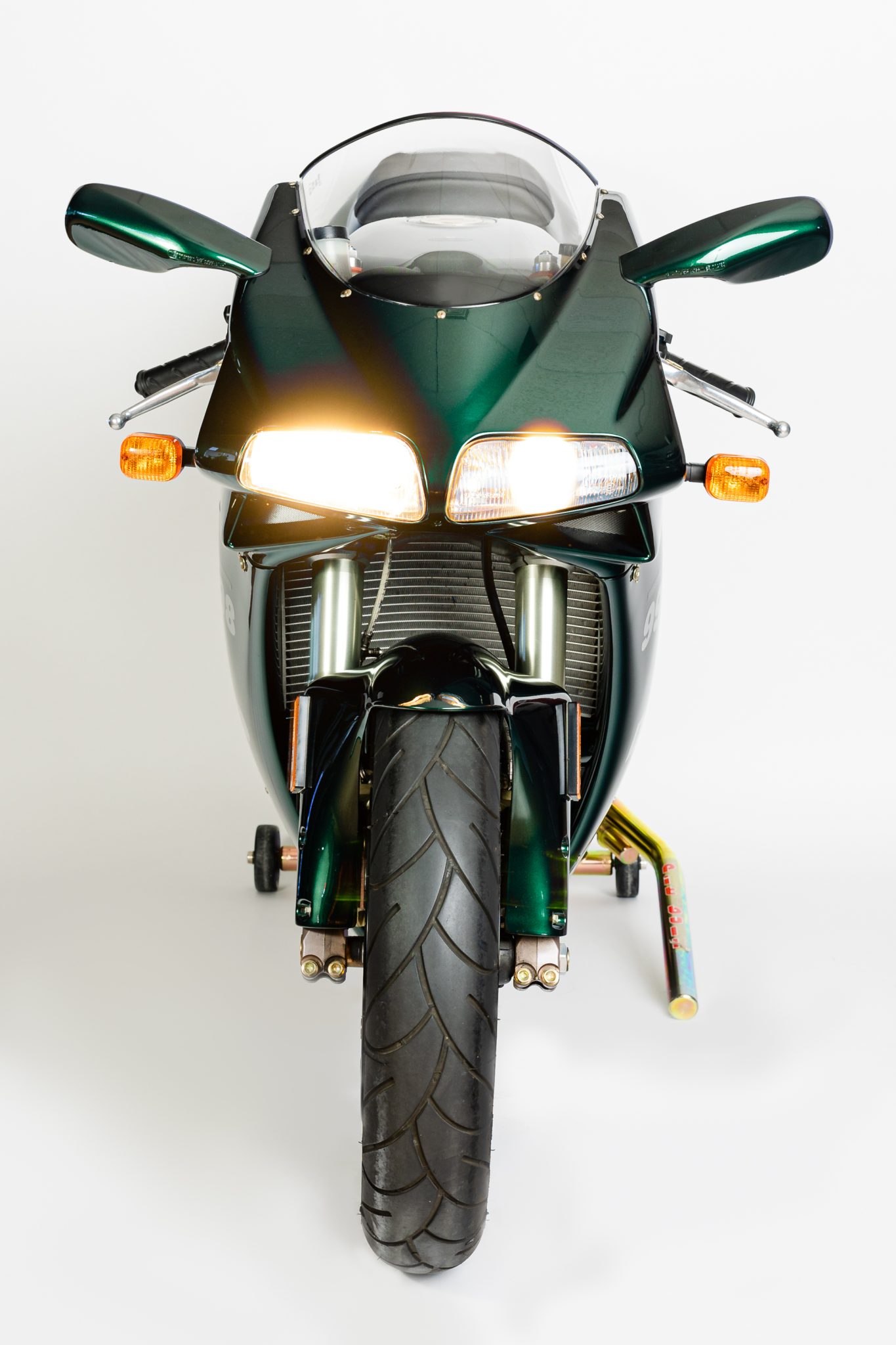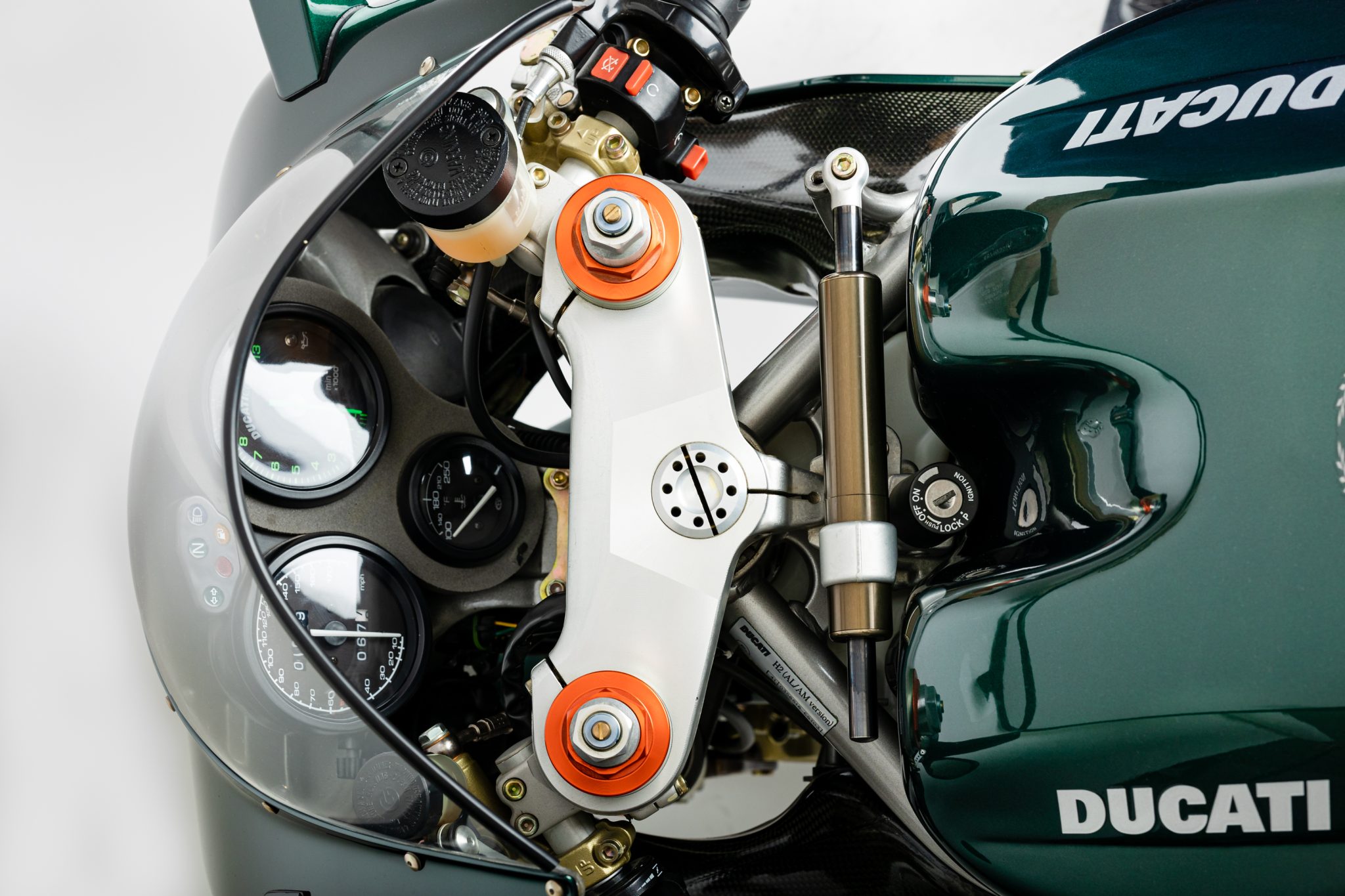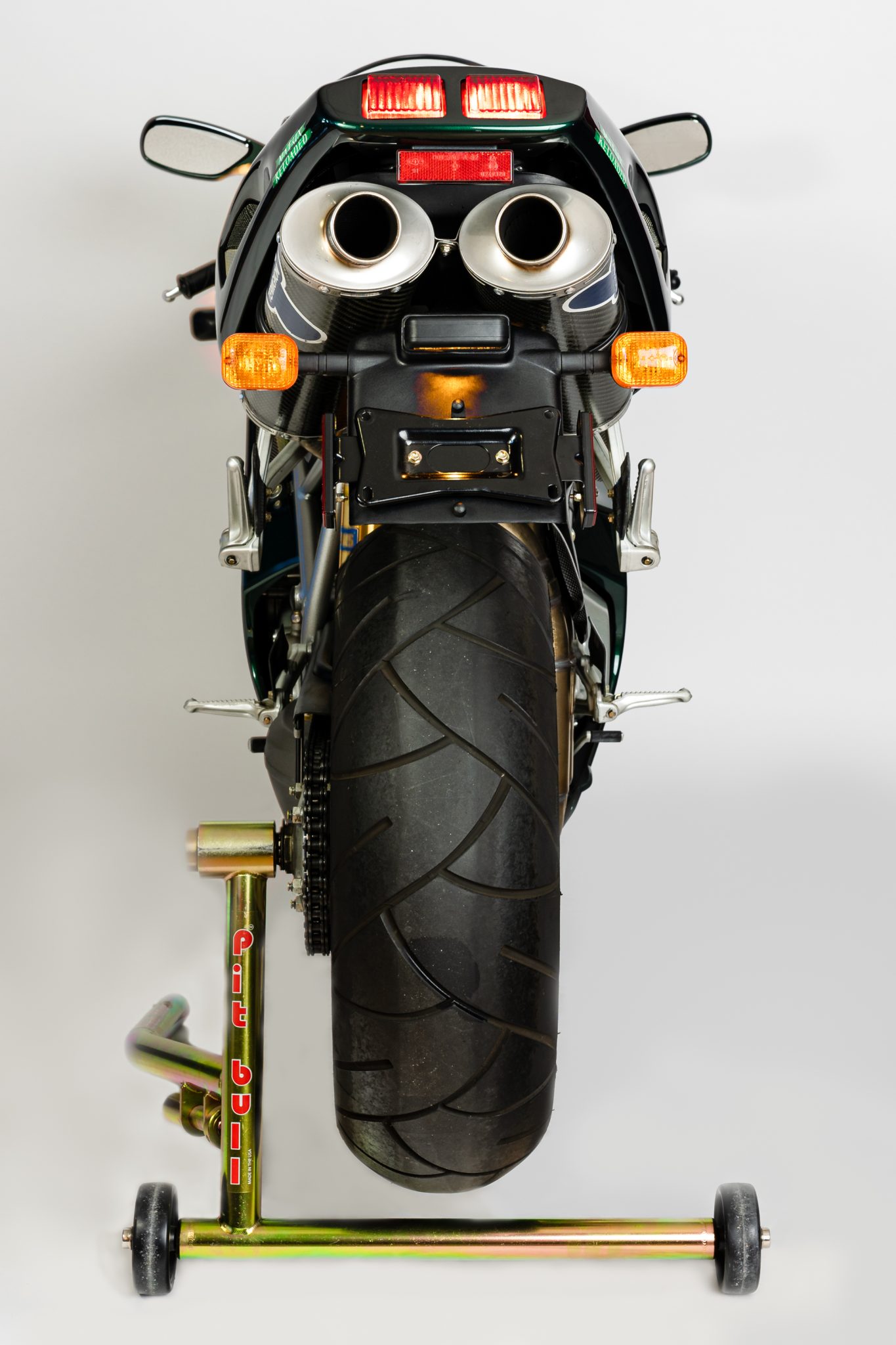 Five-spoke 17″ Marchesini wheels are finished in gray and wear 120/70 front and 190/50 rear Michelin Pilot Sport tires showing 2003 date codes. Adjustable suspension consists of a Showa 43mm inverted fork as well as a remote-reservoir Öhlins monoshock attached to the single-sided aluminum swingarm. Brembo braking components include dual 320mm drilled discs and four-piston calipers up front along with a 220mm drilled disc and a two-piston caliper out back.