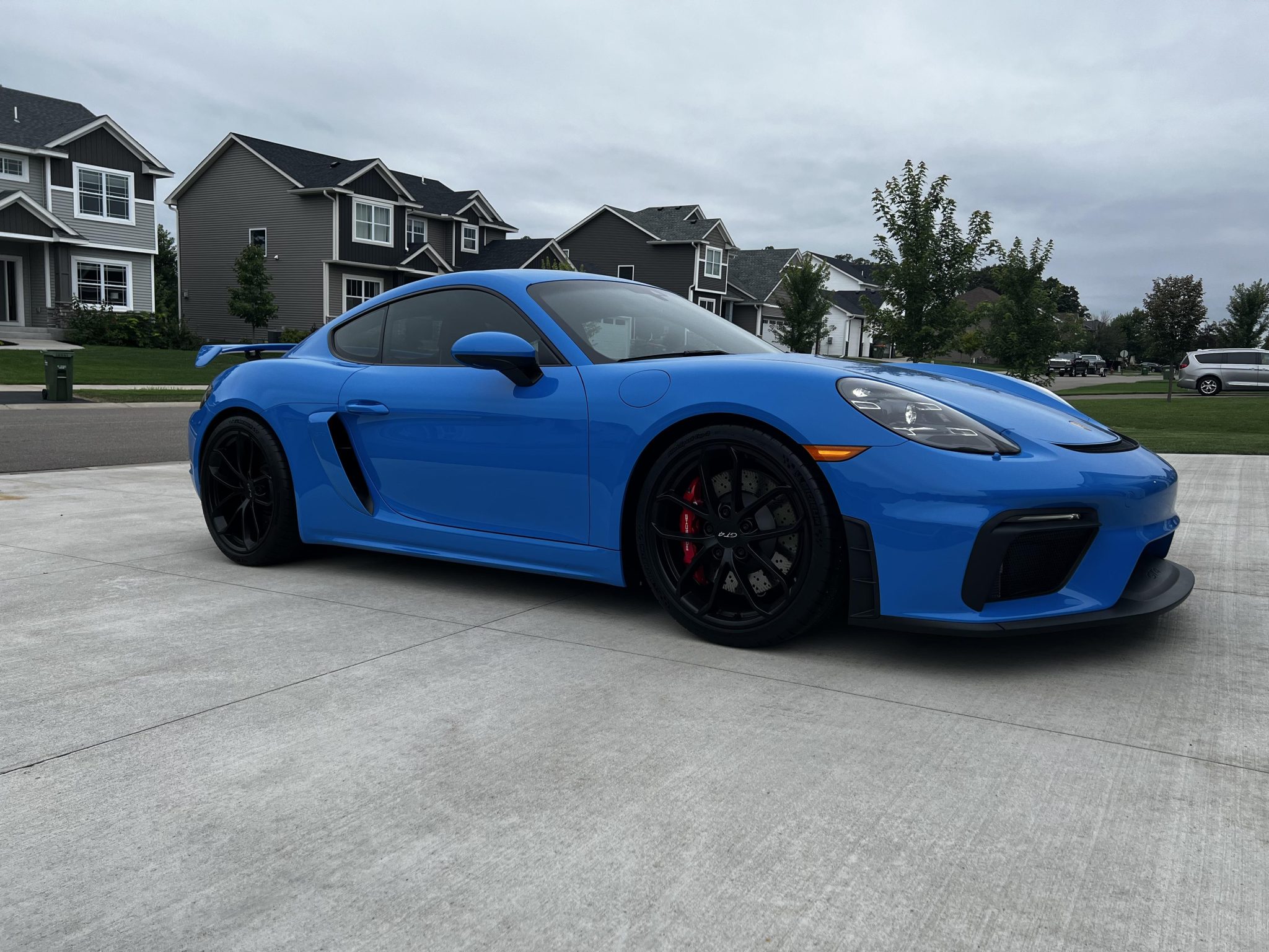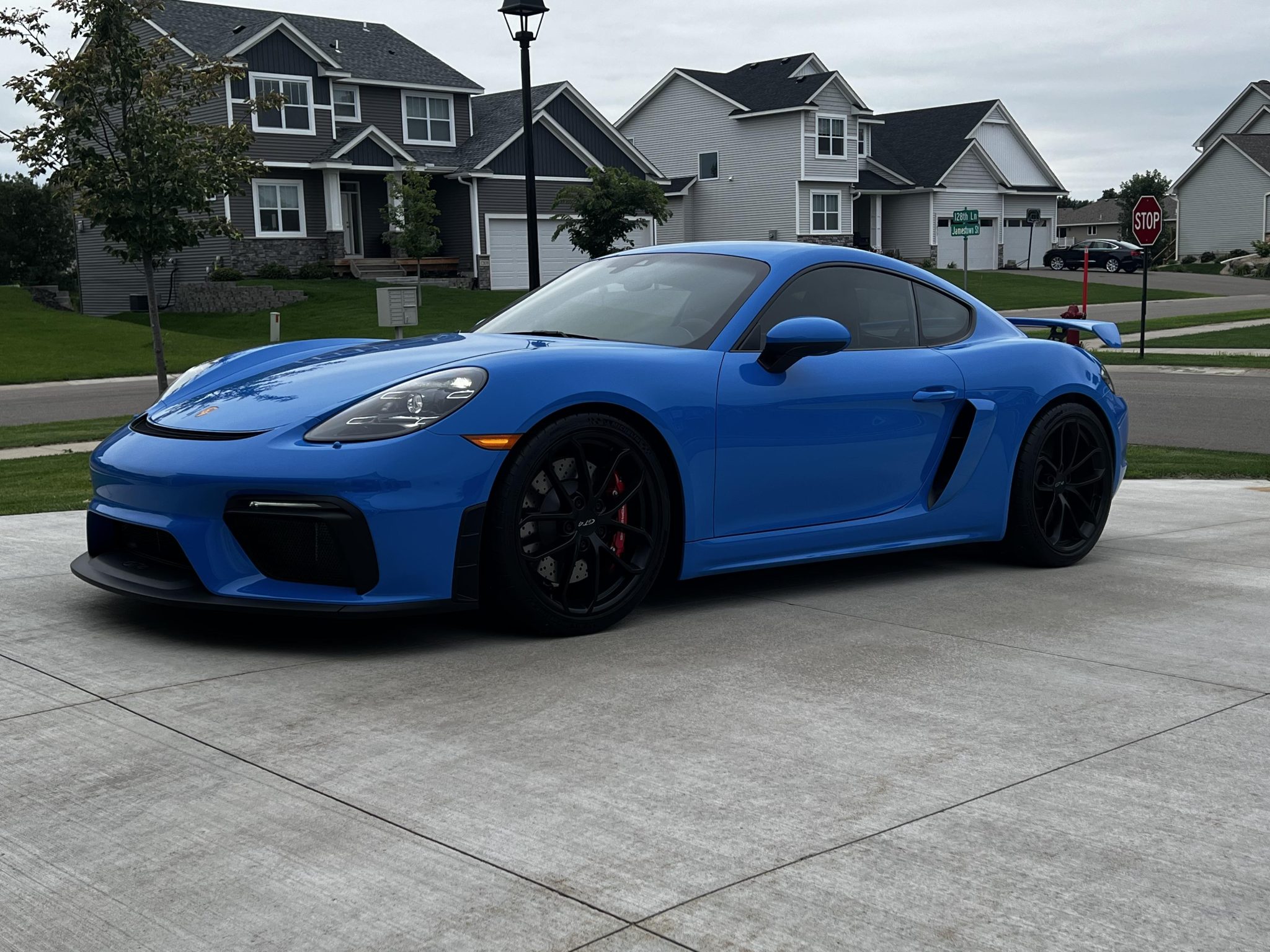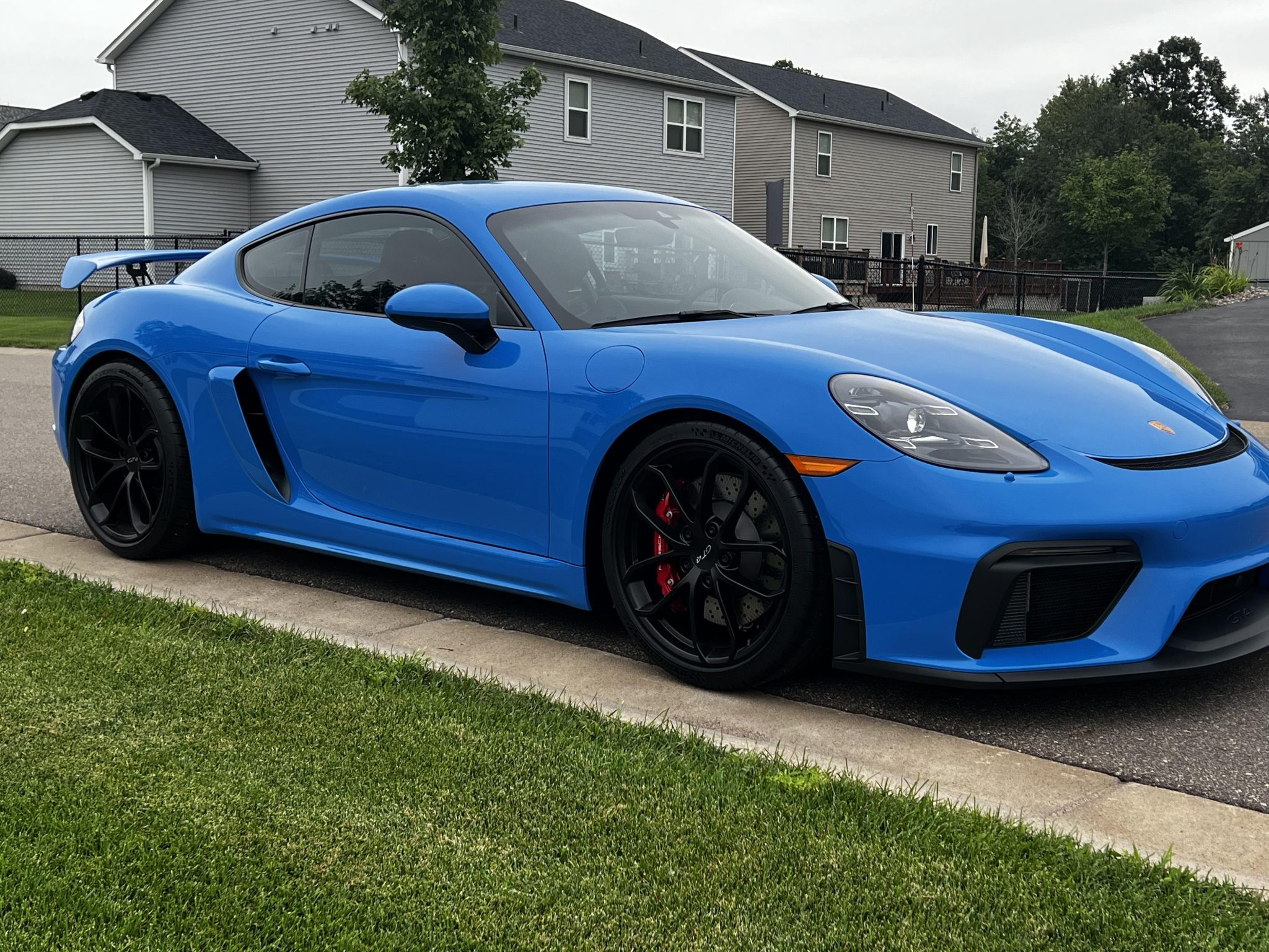 Staggered-width 20″ GT4 wheels are painted in Satin Black and wear Michelin Pilot Sport Cup 2 tires measuring 245/35 in the front and 295/30 in the rear. Stopping power is provided by red Porsche-branded calipers fitted over cross-drilled rotors at all four corners.