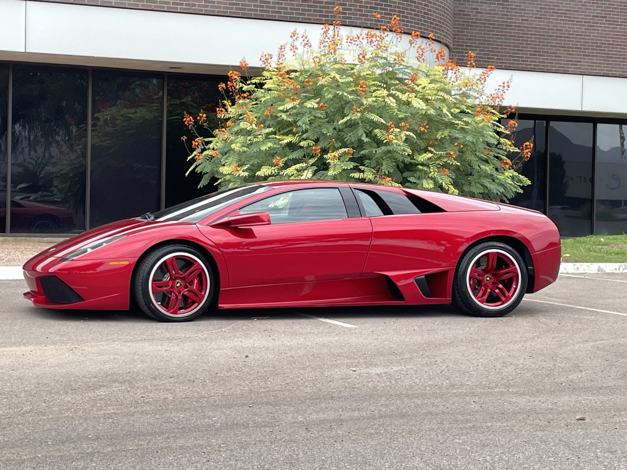 Body-colored 18″ Hemera alloy wheels are mounted with 245/35 front and 335/30 rear Pirelli P Zero Rosso tires that were reportedly installed under current ownership. The car is equipped with a front-axle lift system, and stopping power is provided by red-painted Lamborghini-script calipers over cross-drilled carbon-ceramic rotors.