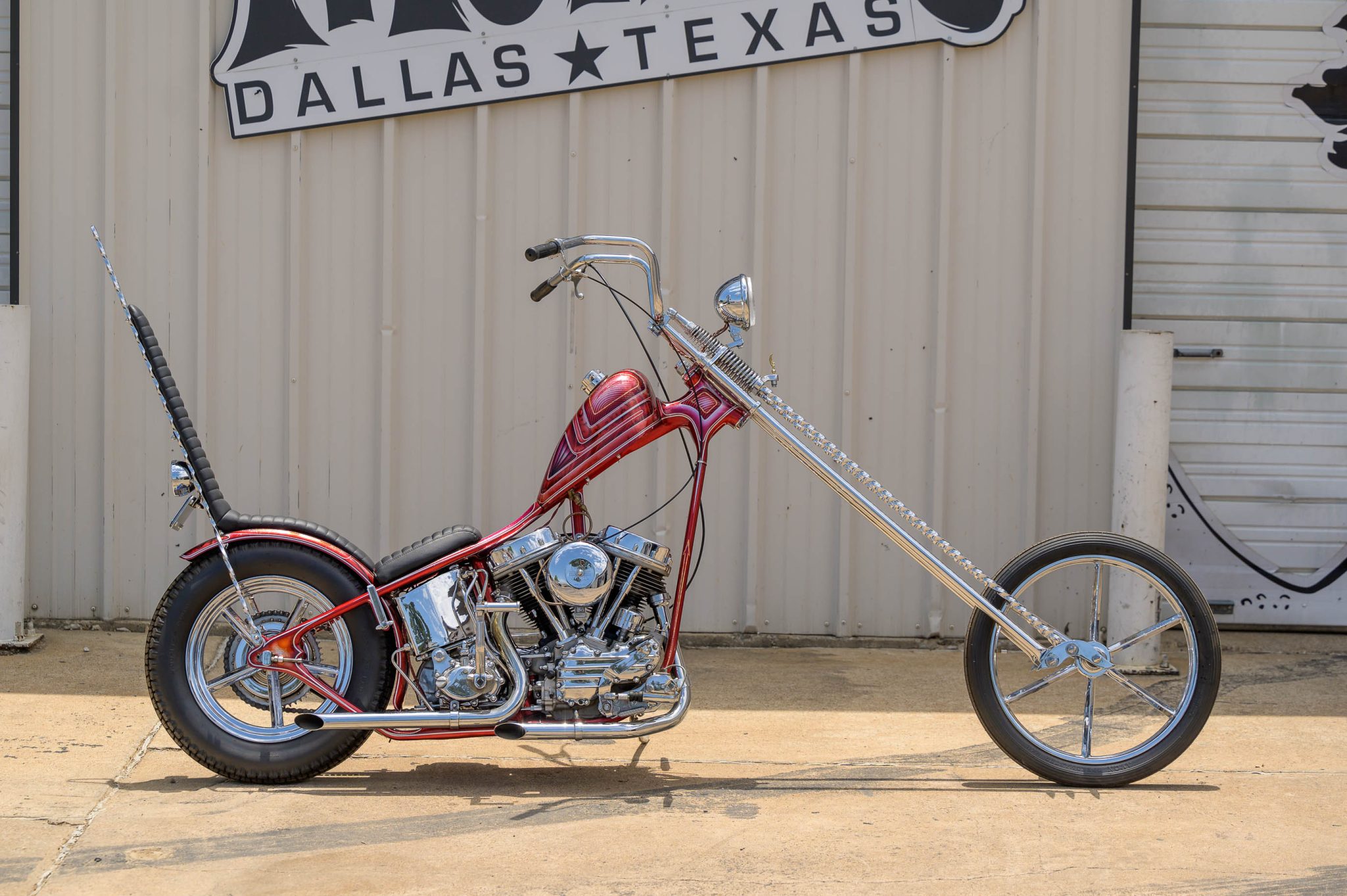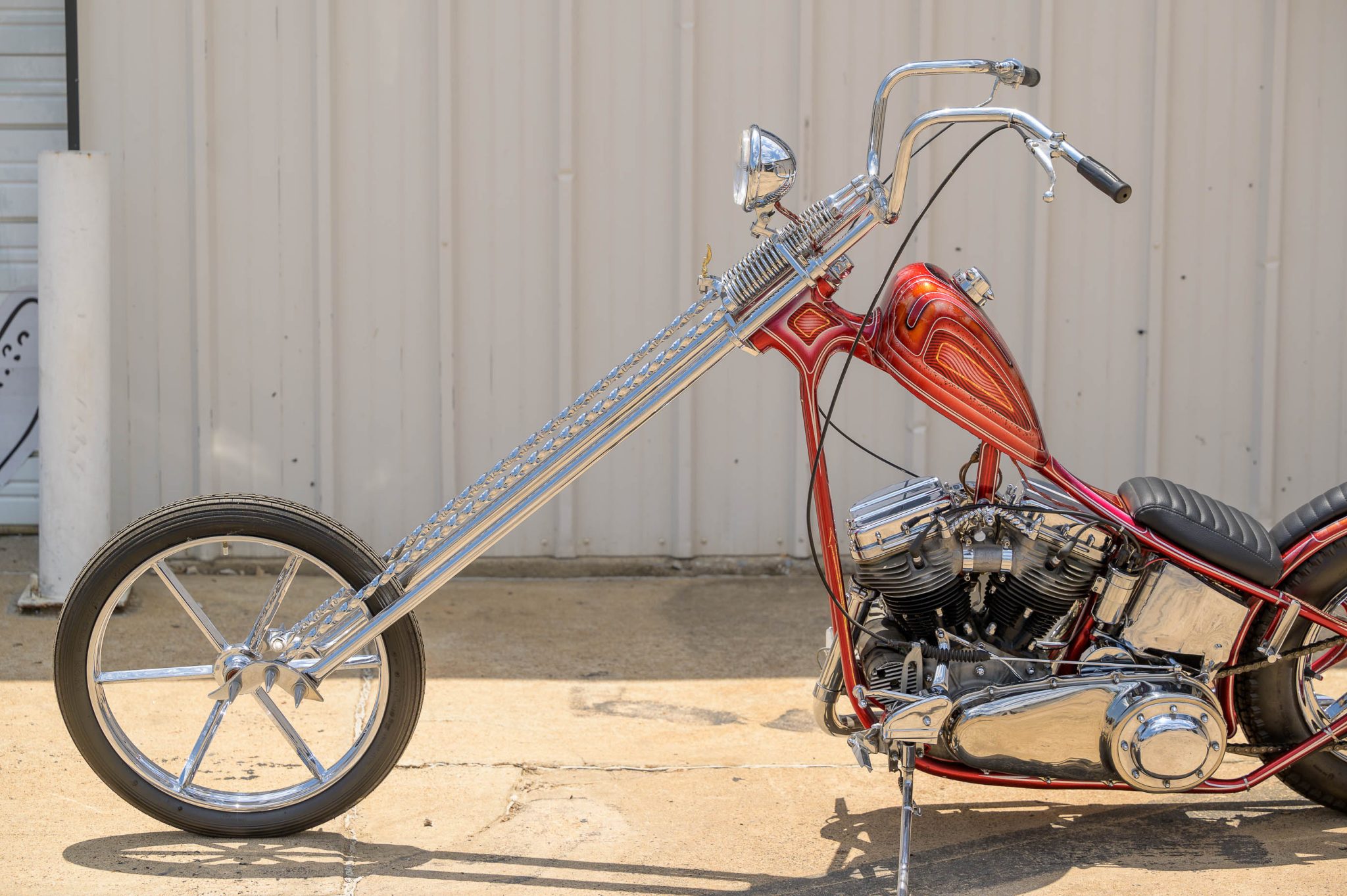 The front end features a Denver’s Choppers 25″-over twisted-springer fork with spiked rocker plates as well as a chrome-finished 21″ Invader square-spoke steel wheel wearing a ribbed 3.00″ Avon Speedmaster MKII tire. The rigid rear rests on a 16″ Invader wheel wrapped in a 5.00″ Avon Safety Mileage tire. Braking power is from a hydraulic rear drum only.
