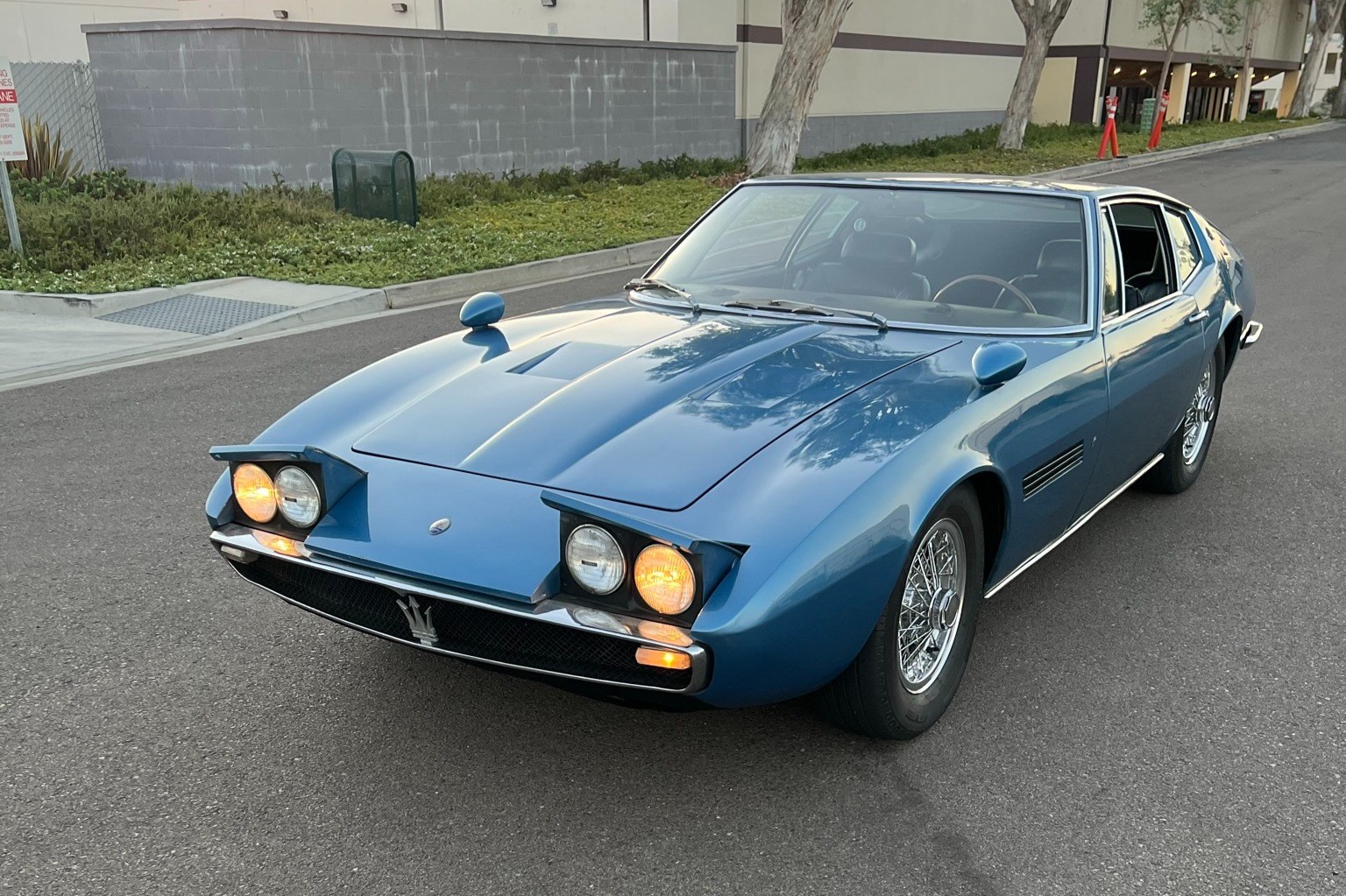 Polished Borrani wire wheels are secured by octagonal knock-offs and are wrapped in 215/70R15 GT Radial Maxtour Steel Belted tires, while a matching spare wears Goodyear Eagle GT rubber. Stopping is handled by servo-assisted ventilated disc brakes, and the front calipers are said to have been rebuilt in late 2021.