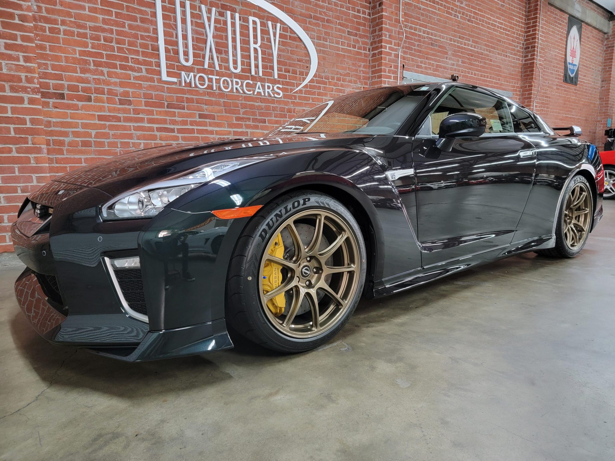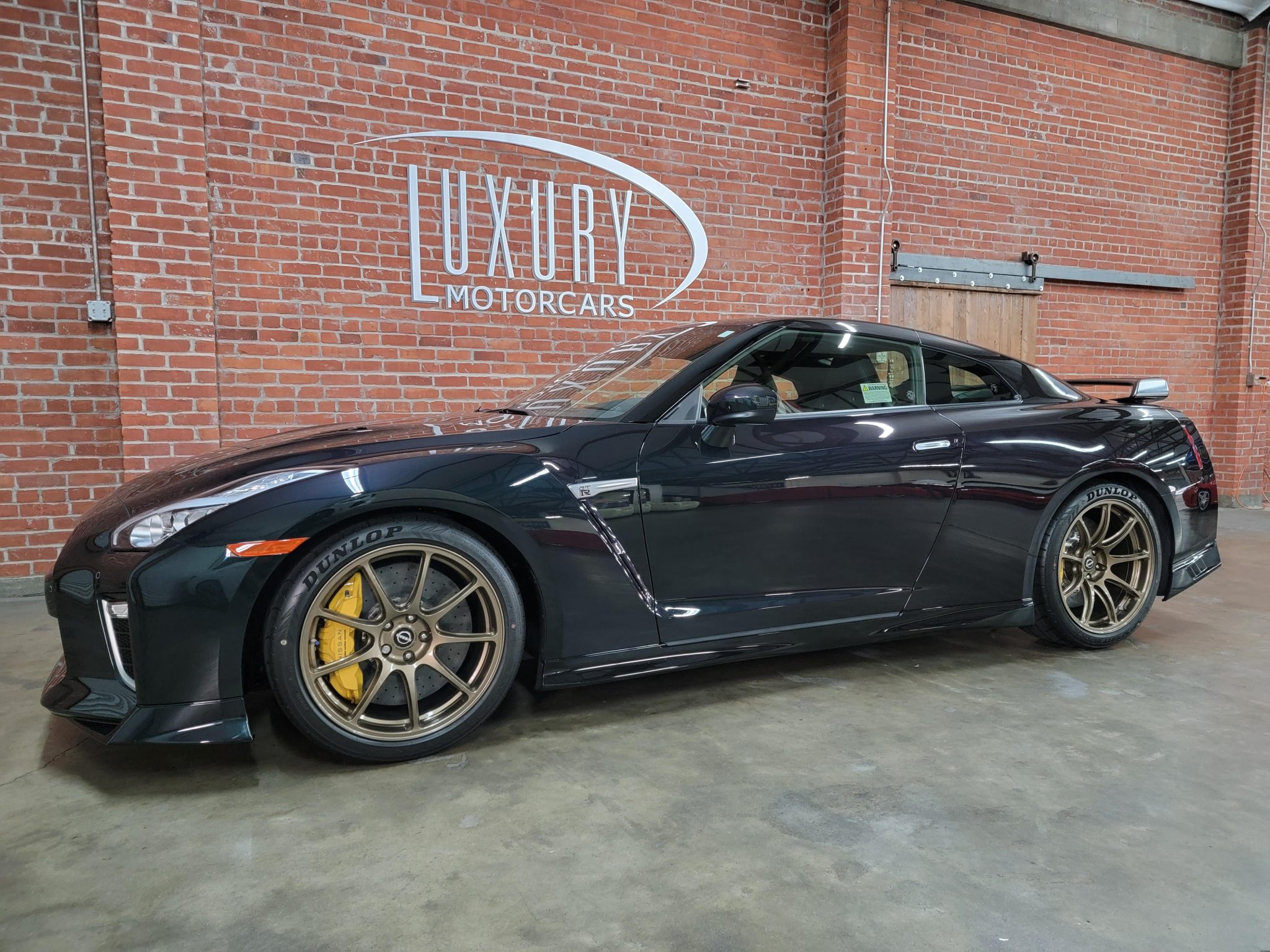 Gold-finished 20″ RAYS forged alloy wheels wear 255/40 front and 285/35 rear Dunlop SP Sportmaxx tires. The GT-R T-Spec utilizes Bilstein Damptronic electronically-controlled shock absorbers in addition to a double-wishbone front and independent multi-link rear suspension. Stopping power is borrowed from the NISMO model and consists of yellow Brembo calipers over cross-drilled carbon-ceramic rotors at all four corners.