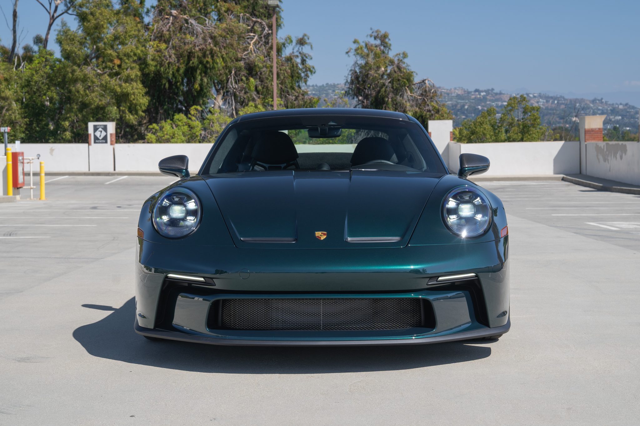 Forged 20″ and 21″ center-lock wheels wear a Satin Neodyme finish and are mounted with 255/35 front and 315/30 rear Pirelli P Zero Corsa tires. The car features a double-wishbone front suspension setup with Porsche Active Suspension Management as well as a front-axle lift system and rear-axle steering. Braking is provided by black Porsche-branded six-piston front and four-piston rear aluminum monoblock calipers fitted over carbon-ceramic rotors.