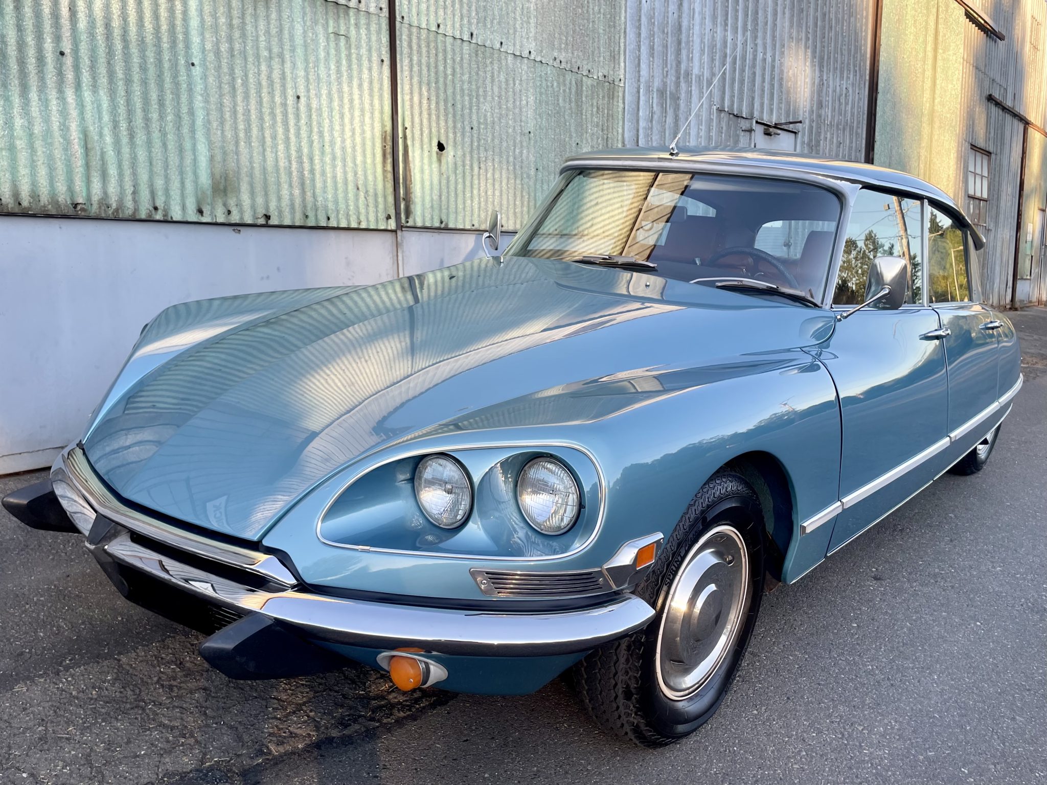 The 15″ steel wheels have been powdercoated gray and wear chrome hubcaps along with Vredestein Sprint Classic radial tires. A matching spare is stored under the hood, ahead of the engine. The hydropneumatic suspension system was refreshed in 2021 with a replacement hydraulic pump, regulator, six spheres, clutch re-engagement control, and centrifugal regulator. Overhauls of the power-assisted steering rack and the inboard front-disc-brake systems also were reportedly performed.
