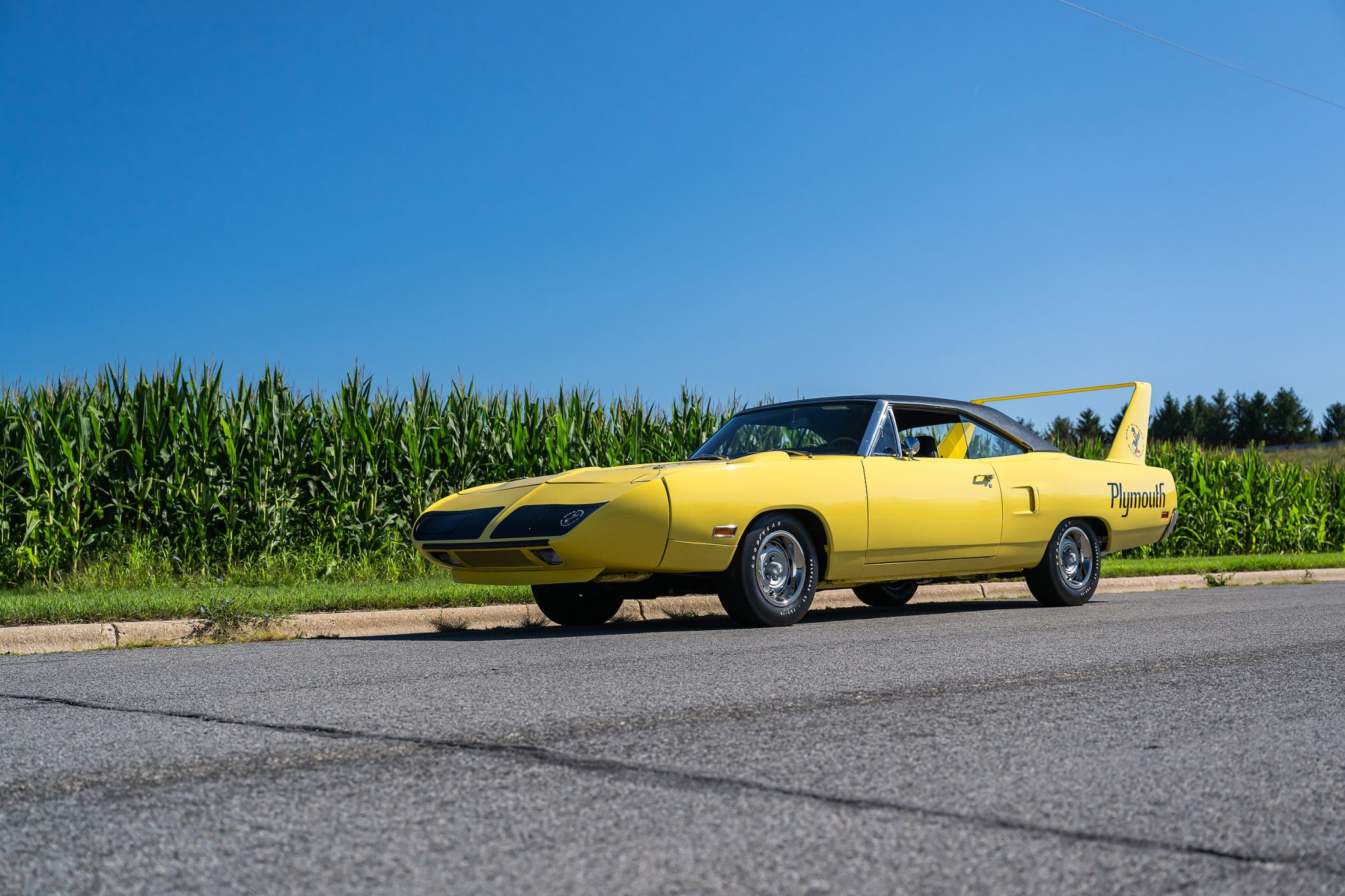The 15″ Rallye wheels wear chrome beauty rings and are mounted with F60-15 Goodyear Polyglas GT white-letter tires. A black-painted spare wheel with a matching Goodyear tire is mounted in the trunk. The car is equipped with power steering, and braking is handled by power-assisted front discs and rear drums.