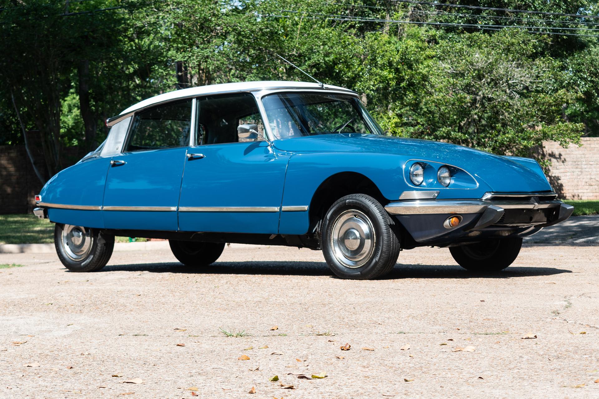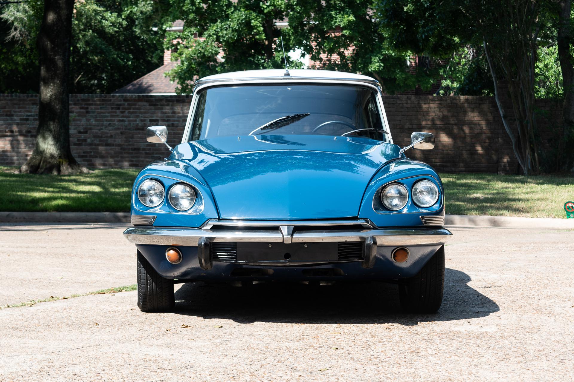 Cream-finished 15” steel wheels wear stainless-steel covers and are mounted with 195/65 Sailun Atrezzo SH406 tires showing 2020 date codes. A spare wheel with an older Michelin tire is stored ahead of the radiator. The car rides on a self-leveling, height-adjustable hydropneumatic suspension with parallel semi-leading arms up front and trailing arms out back. Stopping power is provided by inboard-mounted front discs and rear drums. Chipped paint and blemishes are visible on the wheels.