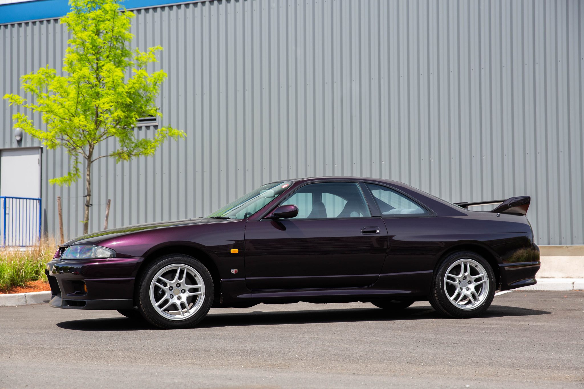 Silver-painted 17” alloy wheels are wrapped in Bridgestone Potenza S001 tires measuring 245/45 and showing 2014 and 2013 date codes. Super HICAS four-wheel steering, Brembo ventilated disc brakes, and front and rear strut braces were standard equipment on R33 GT-R models.