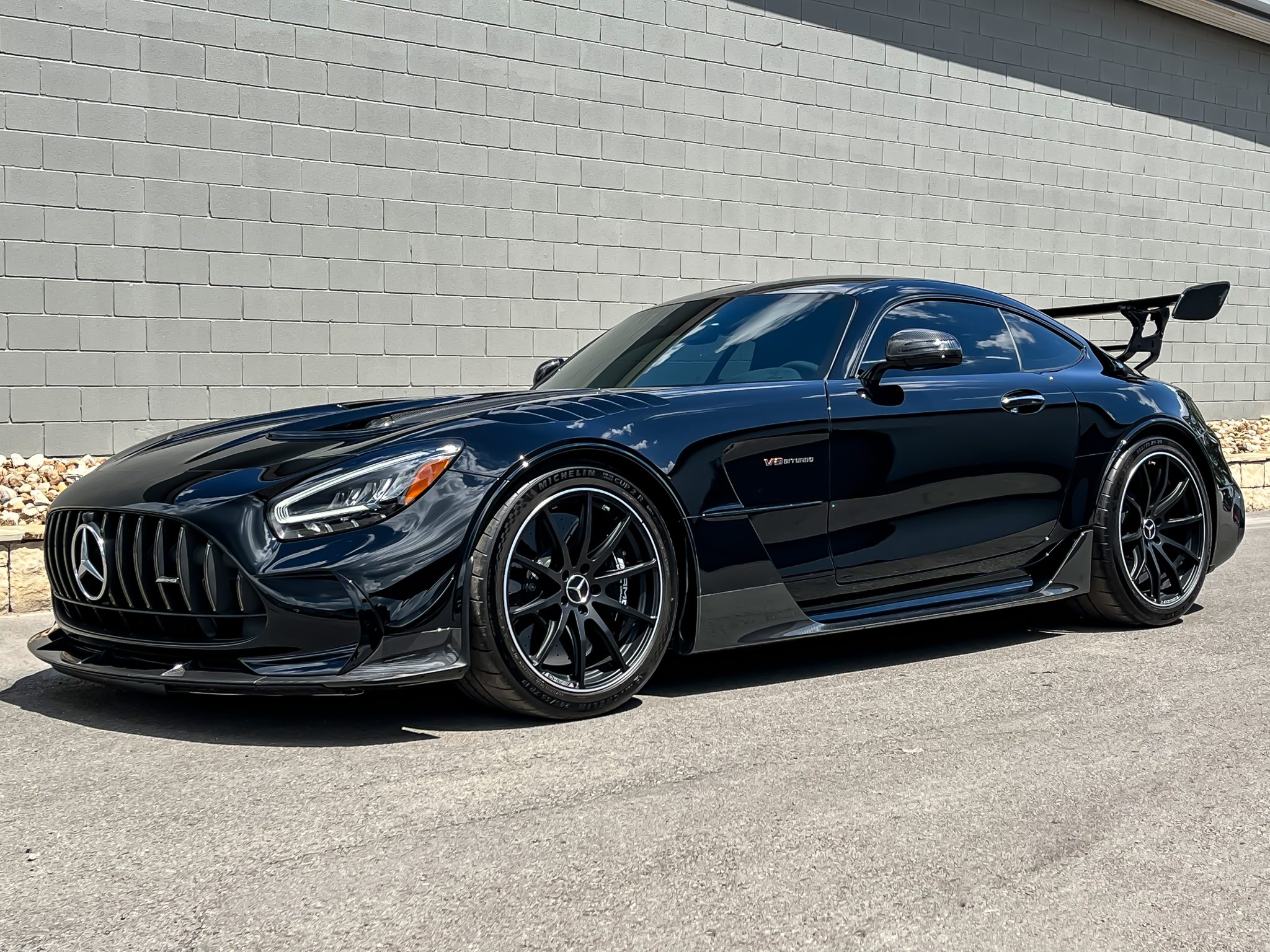 Forged 19″ and 20″ wheels are finished in black with silver lips and mounted with Michelin Pilot Sport Cup 2 R tires that measure 285/35 up front and 335/30 out back. The car features an adaptive coilover suspension with driver-selectable modes, and Black Series equipment includes a carbon-fiber front anti-roll bar and carbon-fiber chassis bracing. Braking is handled by multi-piston monobloc brake calipers clamping ceramic composite brake rotors with model-specific pads.