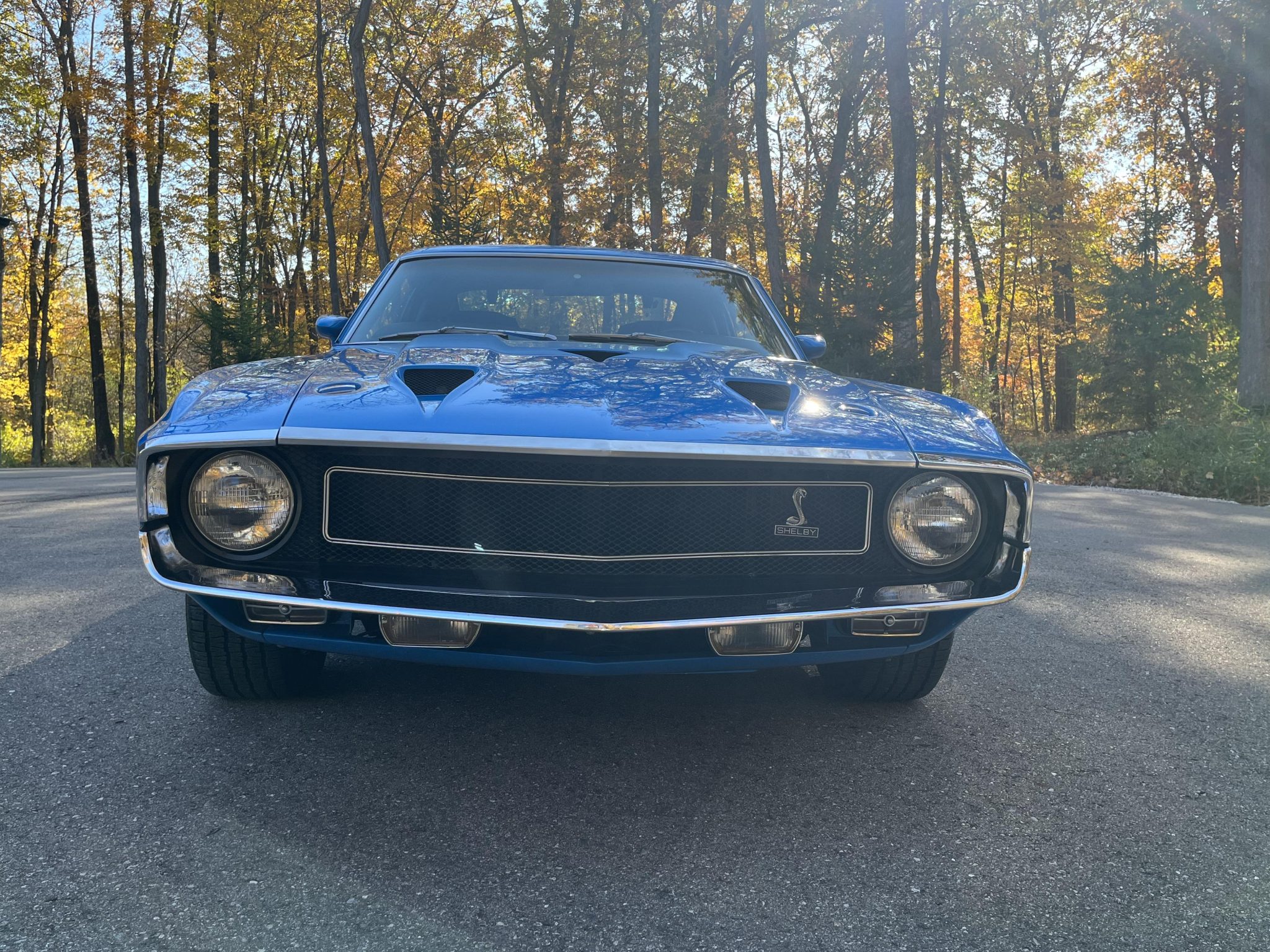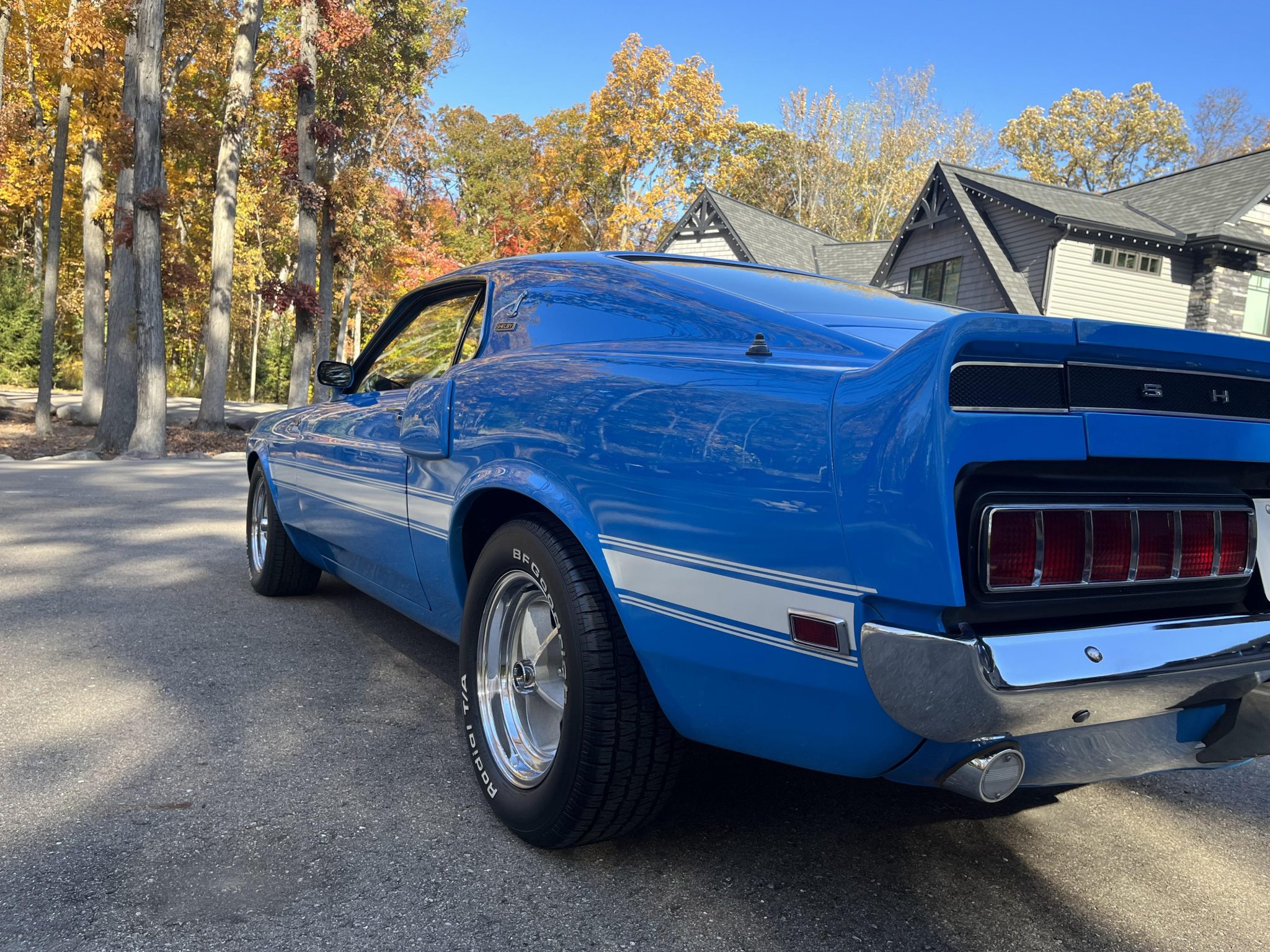 Five-spoke 15″ wheels with polished lips wear black Shelby center caps and are mounted with 235/60 BFGoodrich Radial T/A white-letter tires. The car is equipped with power steering, and braking is handled by power-assisted front discs and rear drums.
