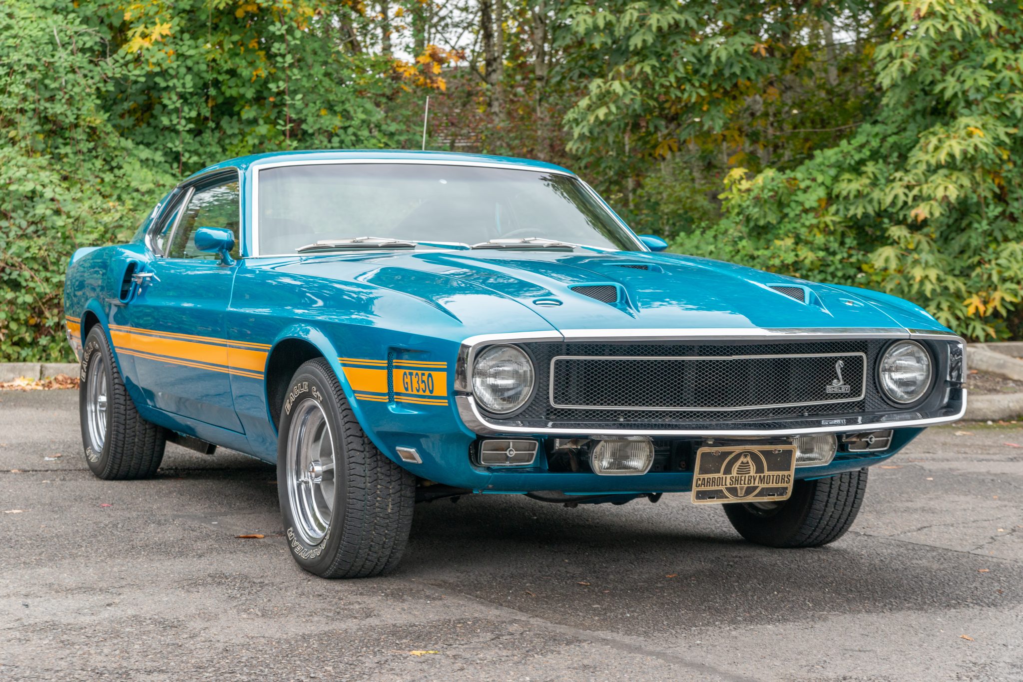 Shelby-branded 15″ five-spoke alloy wheels are mounted with 215/65 and 255/60 Goodyear Eagle GT tires. Braking is handled by power-assisted front discs and rear drums.