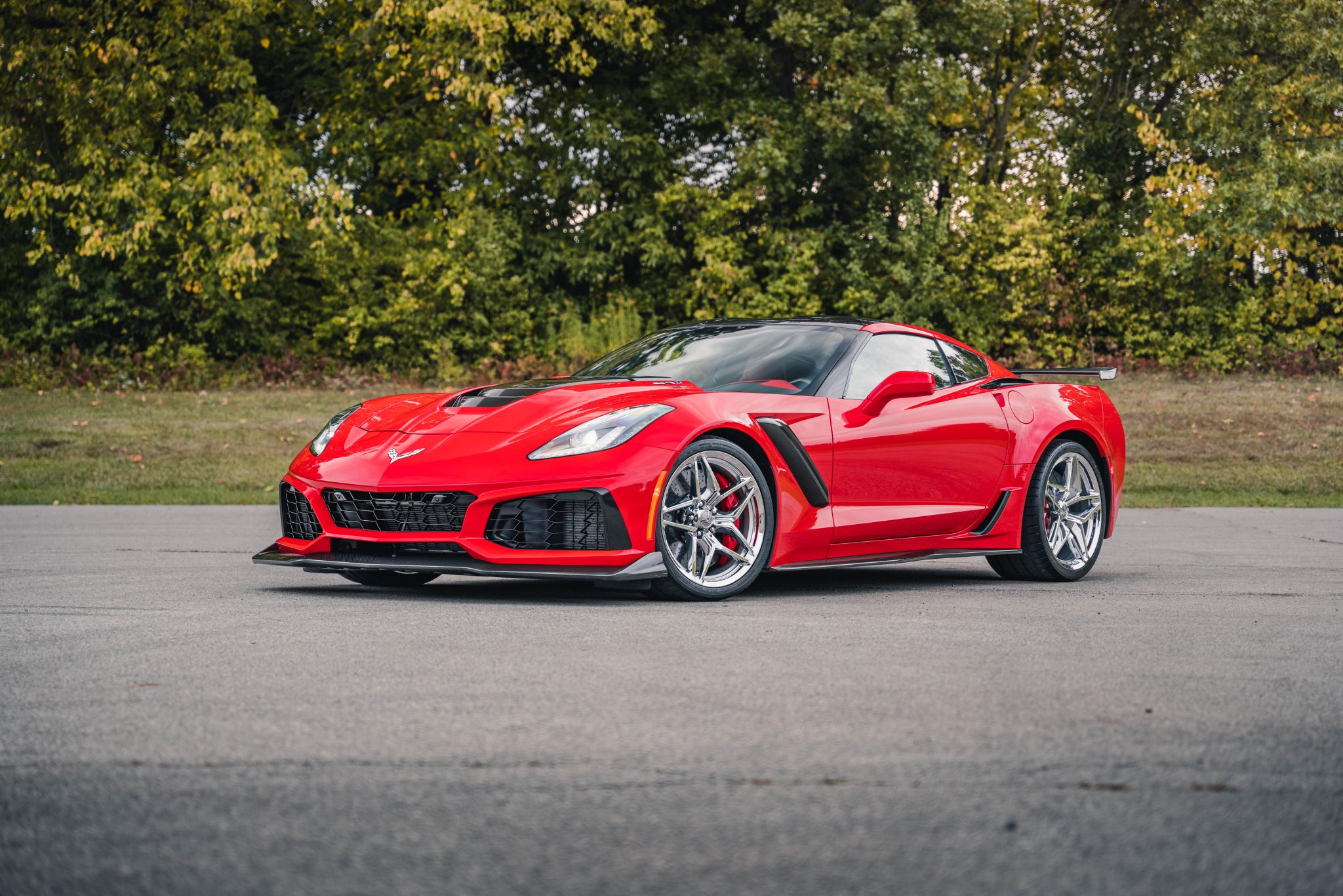 Chrome 19″ and 20″ ZR1 wheels are mounted with Michelin Pilot Super Sport tires measuring 285/30 up front and 335/25 at the rear. The car is equipped with Magnetic Ride Control and a ZR1 performance suspension. Stopping power is provided by cross-drilled carbon-ceramic discs with red-finished Brembo calipers at each corner.