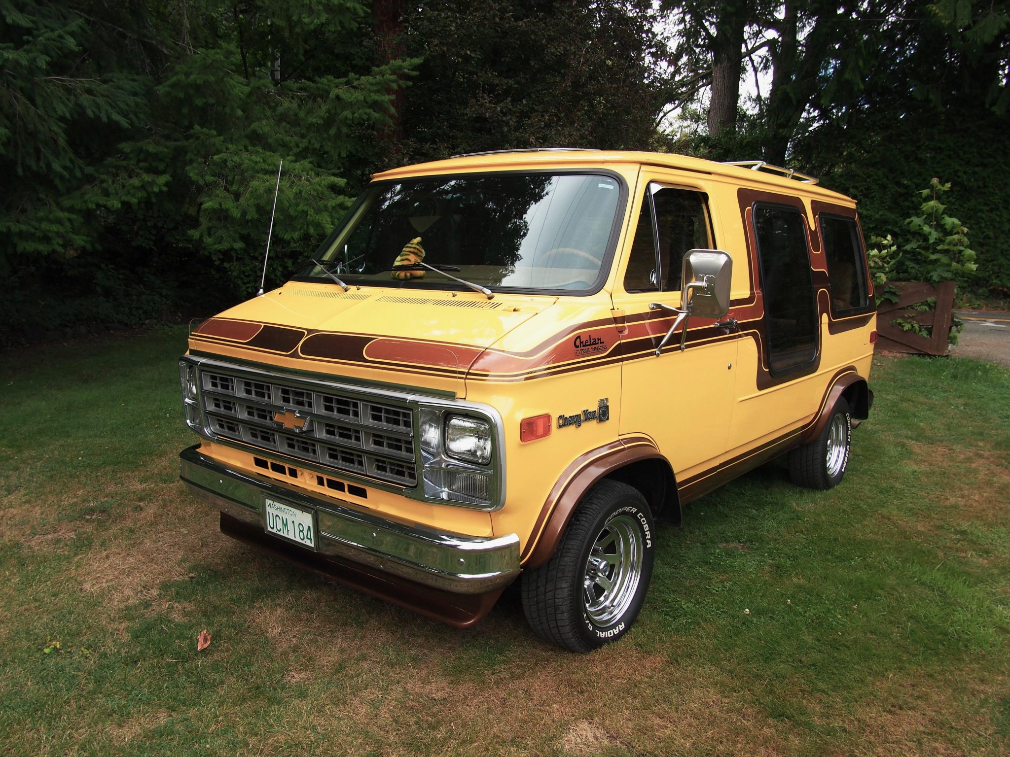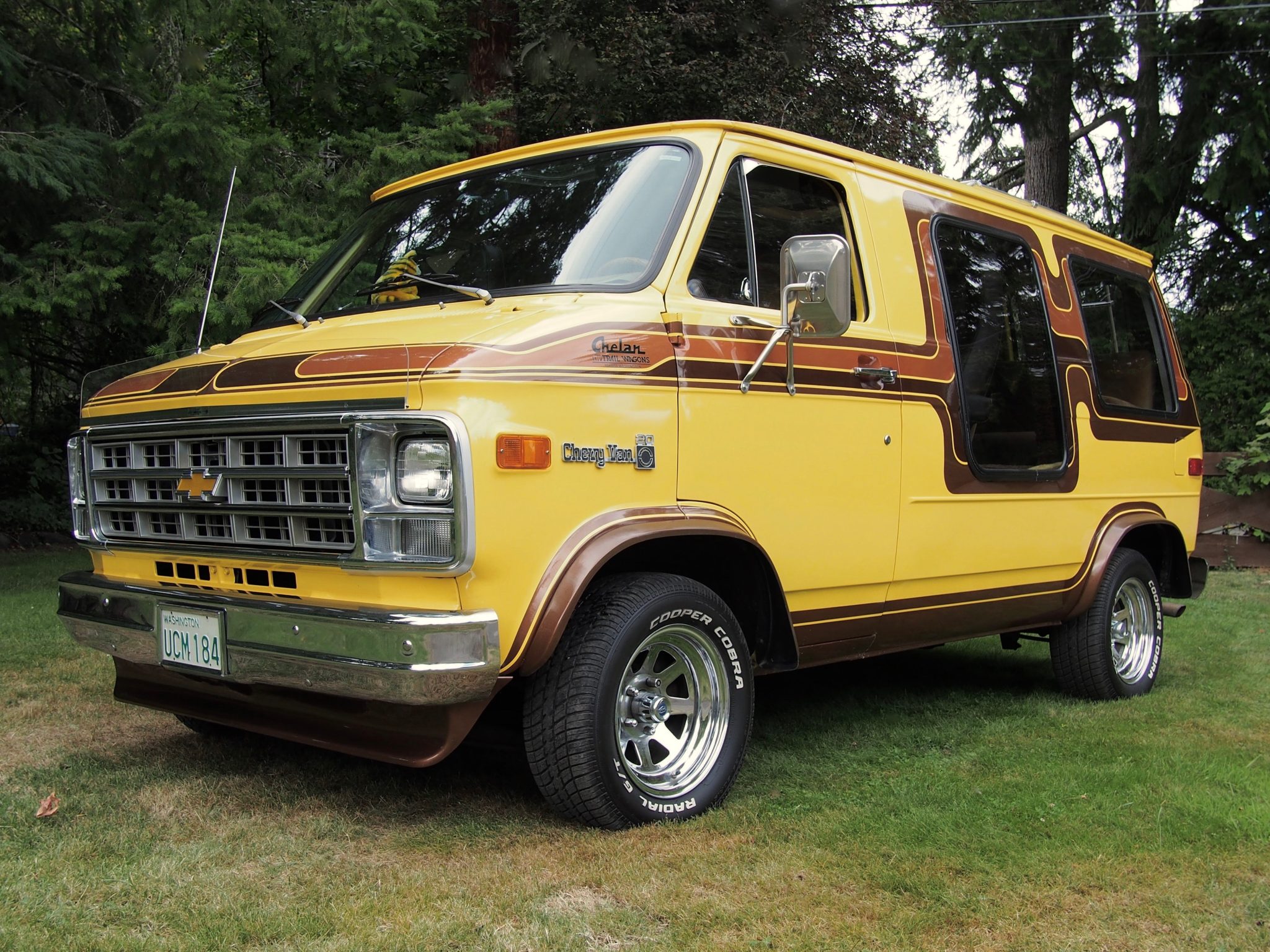 Chrome 15″ wagon wheels wear 235/60 Cooper Cobra tires that show date codes from 2020, while a spare tire with a cover is mounted on the right rear door. Braking is provided by front discs and rear drums, and the van is equipped with power steering and heavy-duty rear springs. Service performed under current ownership reportedly included replacing the brake pads and shoes, wheel cylinders, and brake hoses. Discoloration is visible on one of the wheels.