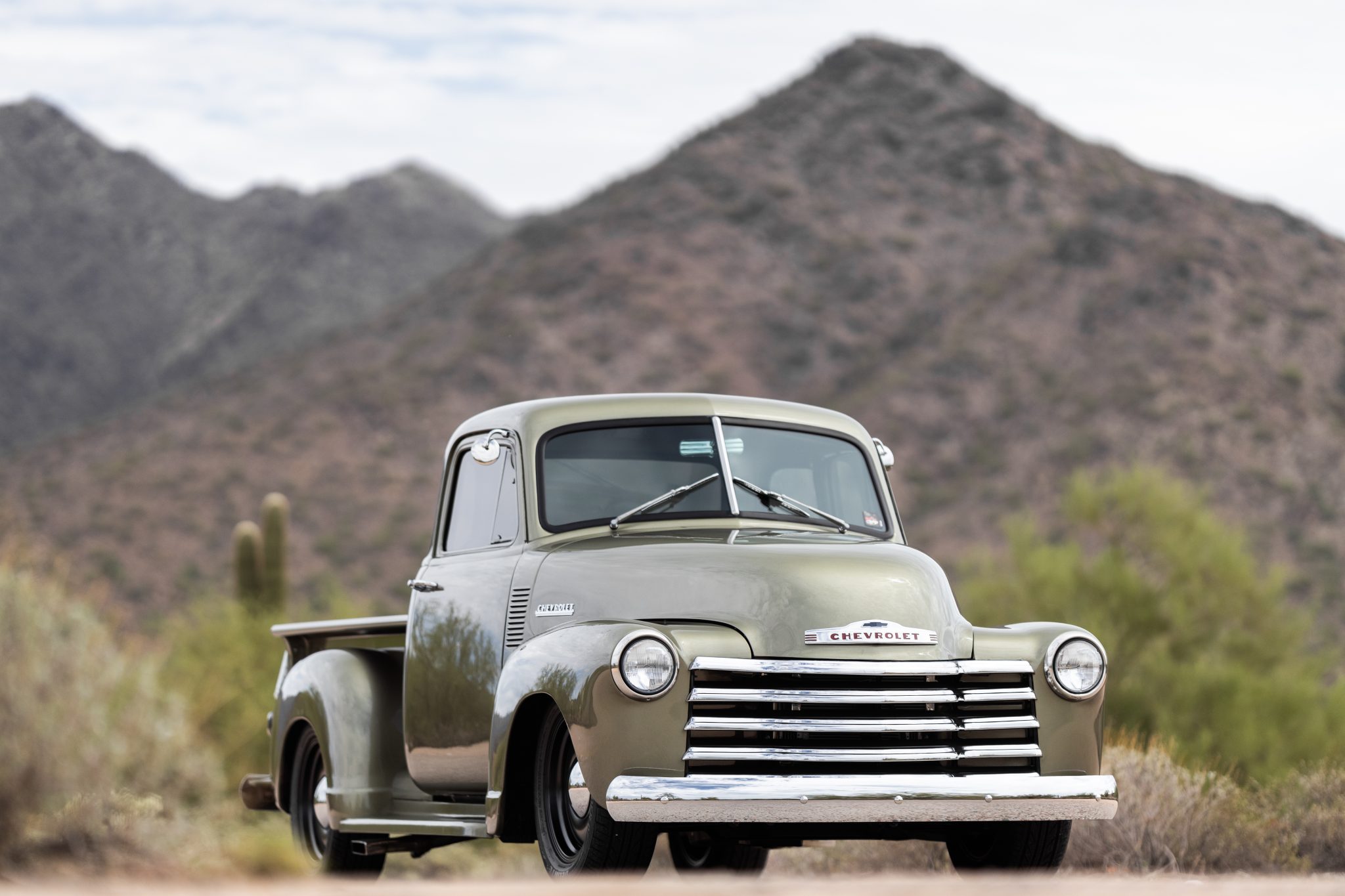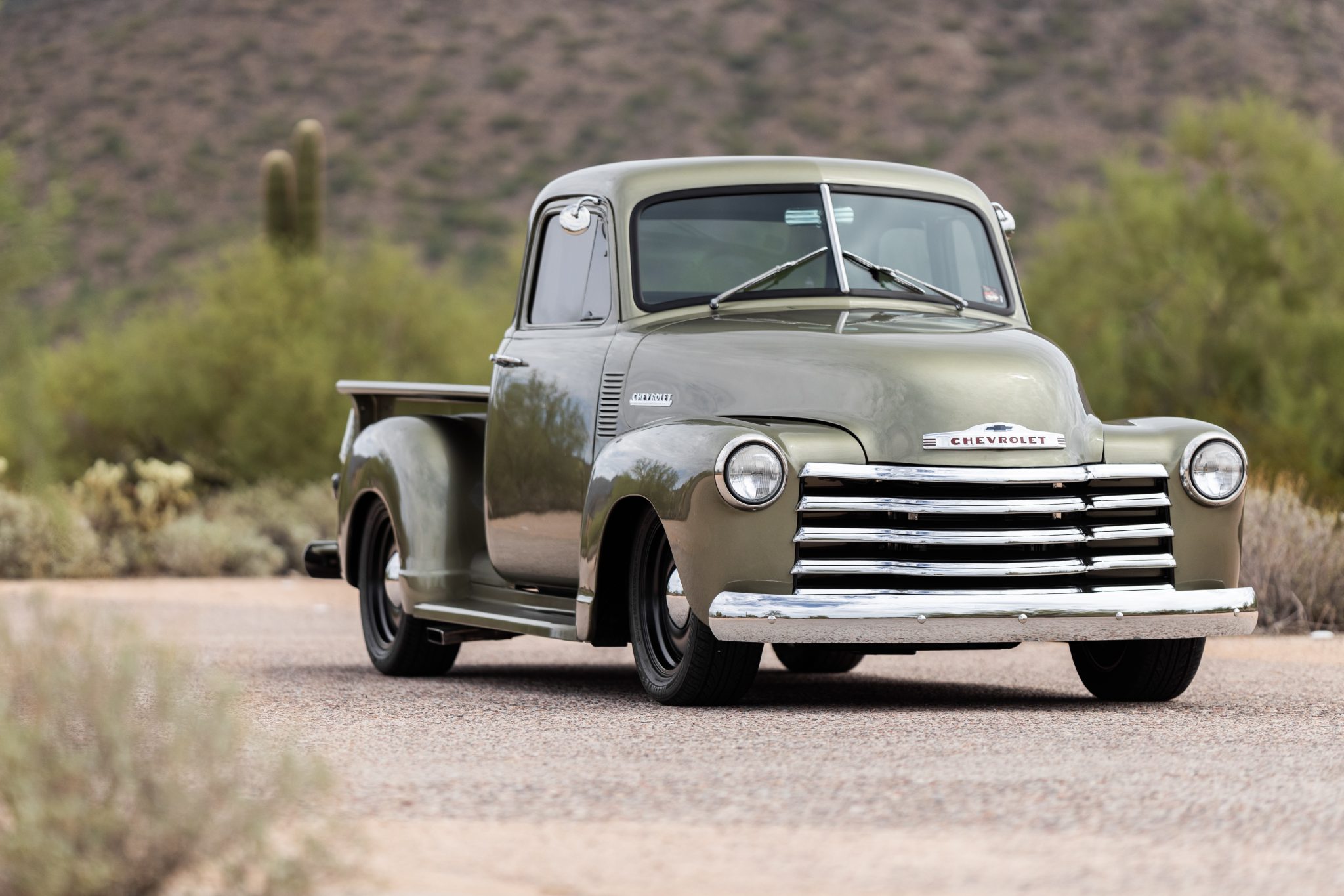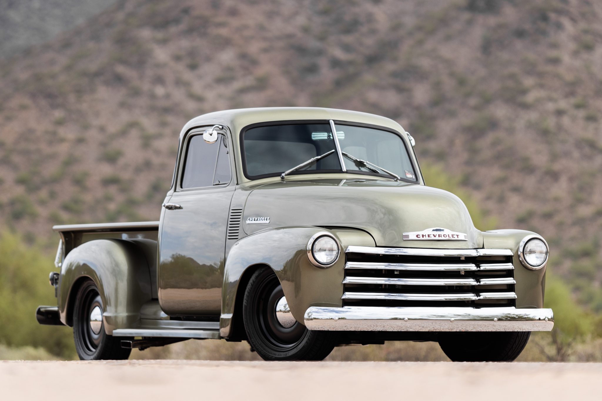 Black Coys C-33 smoothie-style 18″ aluminum wheels are mounted with Delinte tires. A Mustang II front clip with QA1 coilovers and rack-and-pinion steering has been installed along with a four-link rear suspension with coilovers; the front coilovers were replaced in 2021. The truck is also equipped with four-wheel disc brakes.