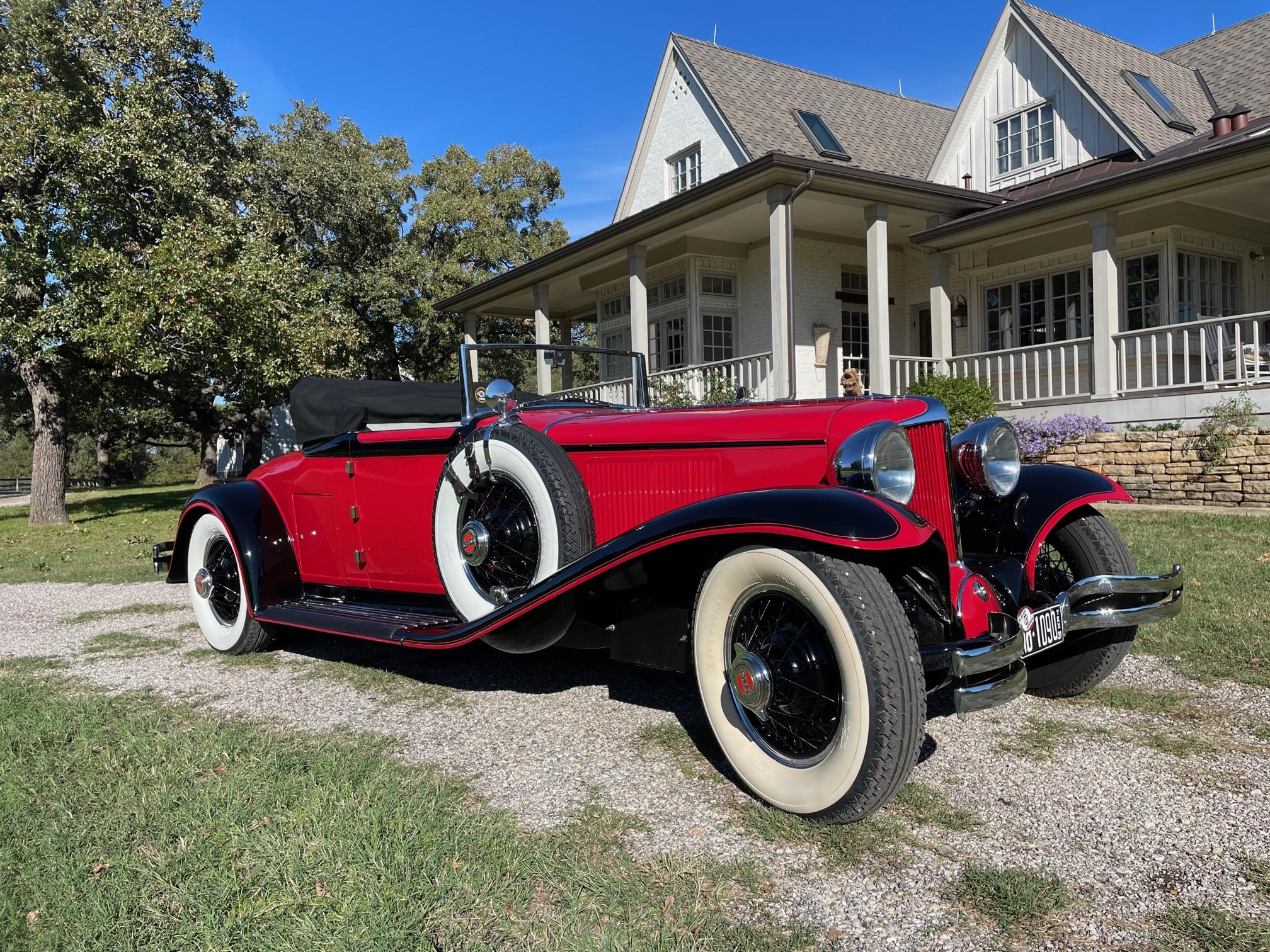 This example wears two-door cabriolet bodywork that was removed from the frame and repainted in its current livery of red with black accents during the 2000s refurbishment reportedly performed by Jim Livings in Tucson, Arizona. Various imperfections in the finish are shown up close in the photo gallery below. Additional features include dual cowl-mounted spotlights, Sparton electric horns, a rear luggage rack, and a rectangular exhaust outlet, while turn signals have been added. The black convertible top was fitted during the refurbishment and can be stowed under a matching boot.