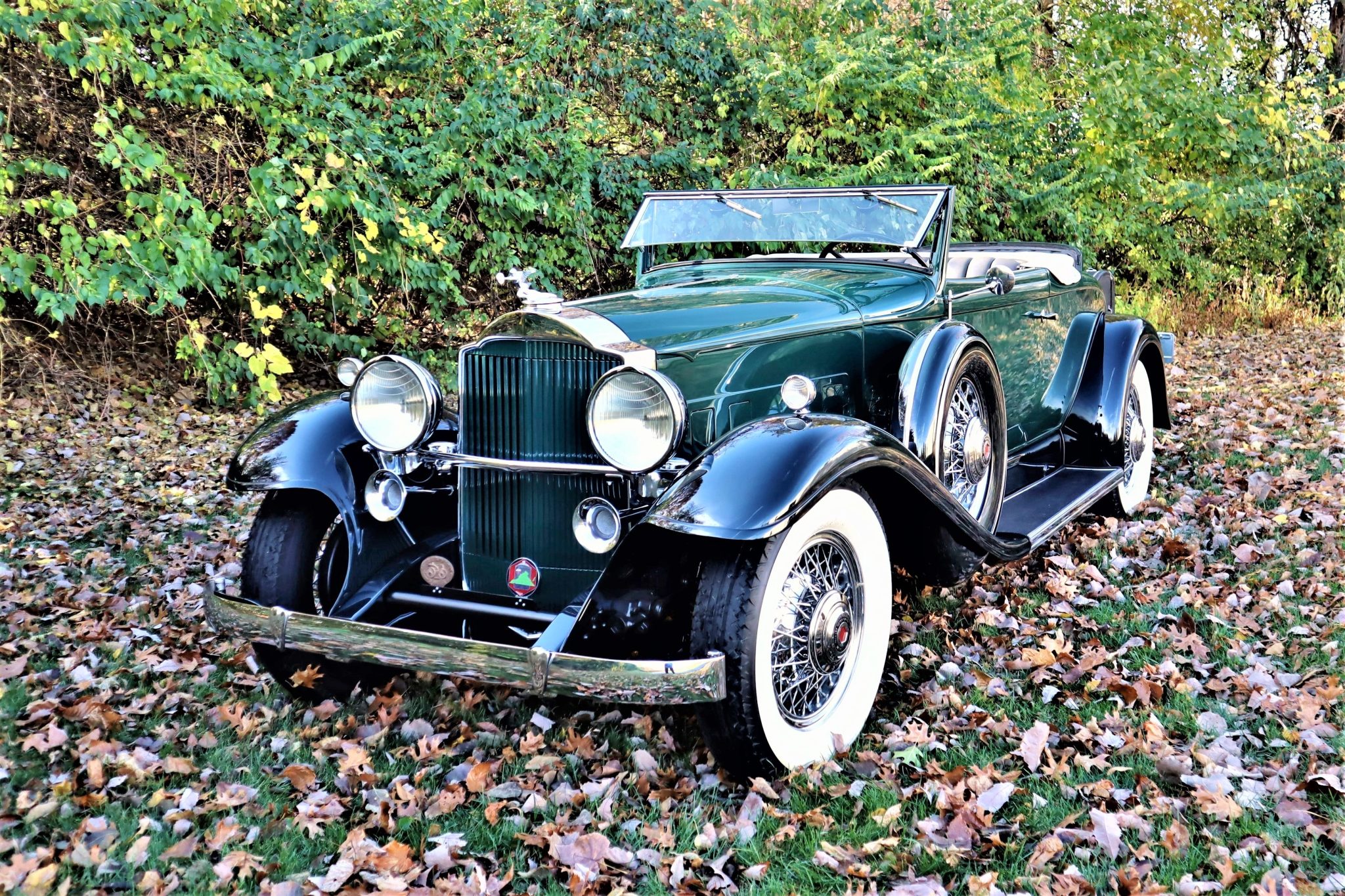 Chrome 19″ wire wheels wear Packard-branded hubcaps and are mounted with Firestone whitewall bias-ply tires. Dual spare wheels are mounted in Midnight Green cases with chrome accents in the front fenders. Ninth Series Packards introduced a “double-drop” chassis design with X-bracing and featured automatic chassis lubrication and adjustable shock absorbers. Stopping power is provided by four-wheel mechanical drum brakes.
