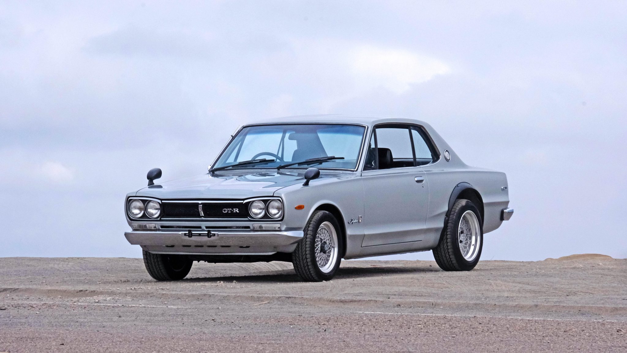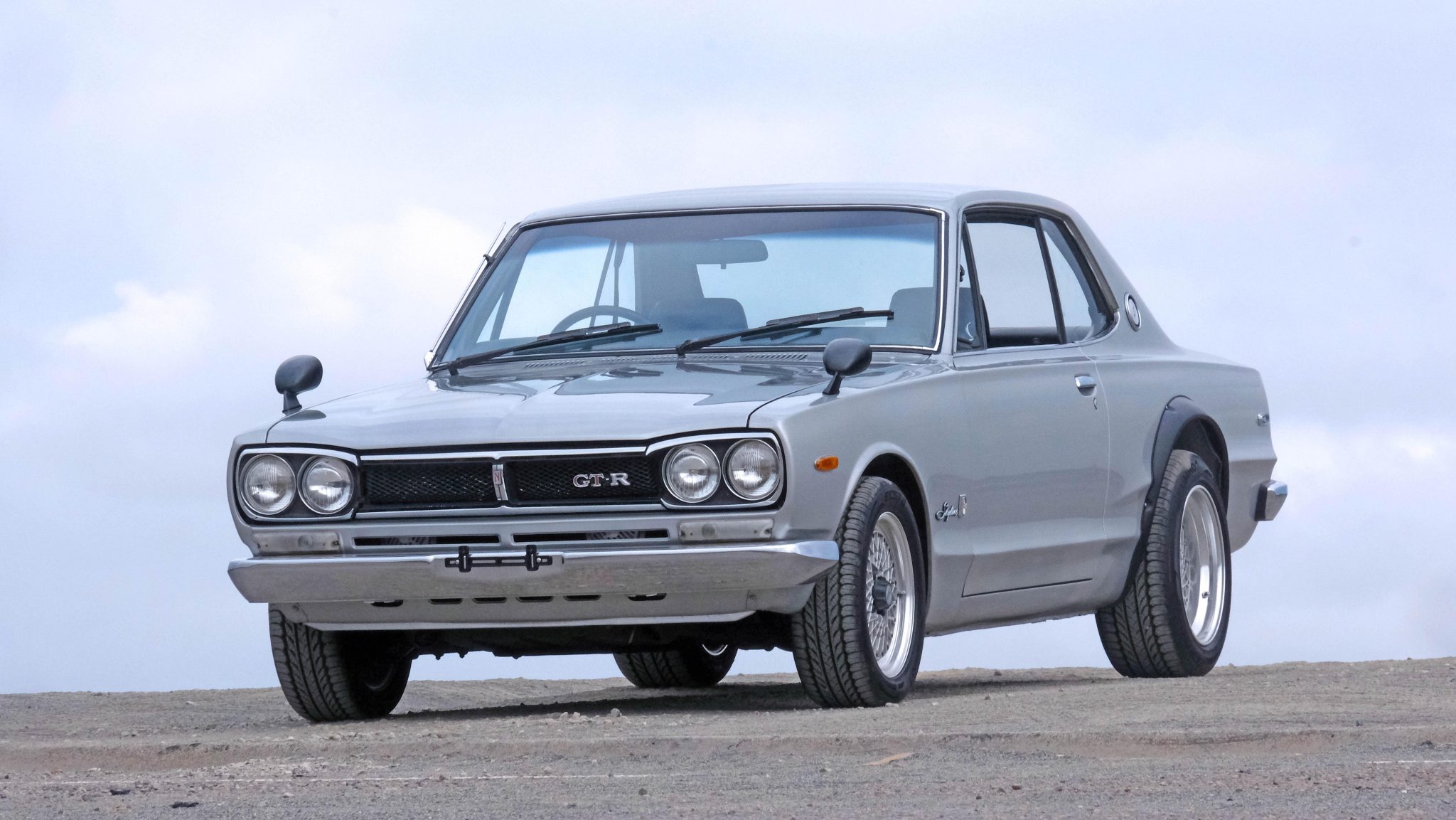 This example is finished in silver and is said to have received touchup paintwork on the rocker panels and lower areas of the body. Exterior details include black fender-mounted side mirrors, black rear wheel arch flares, a locking fuel-filler door integrated into the trunk line, dual exhaust outlets, and GT-R badges on the grille and rear panel.