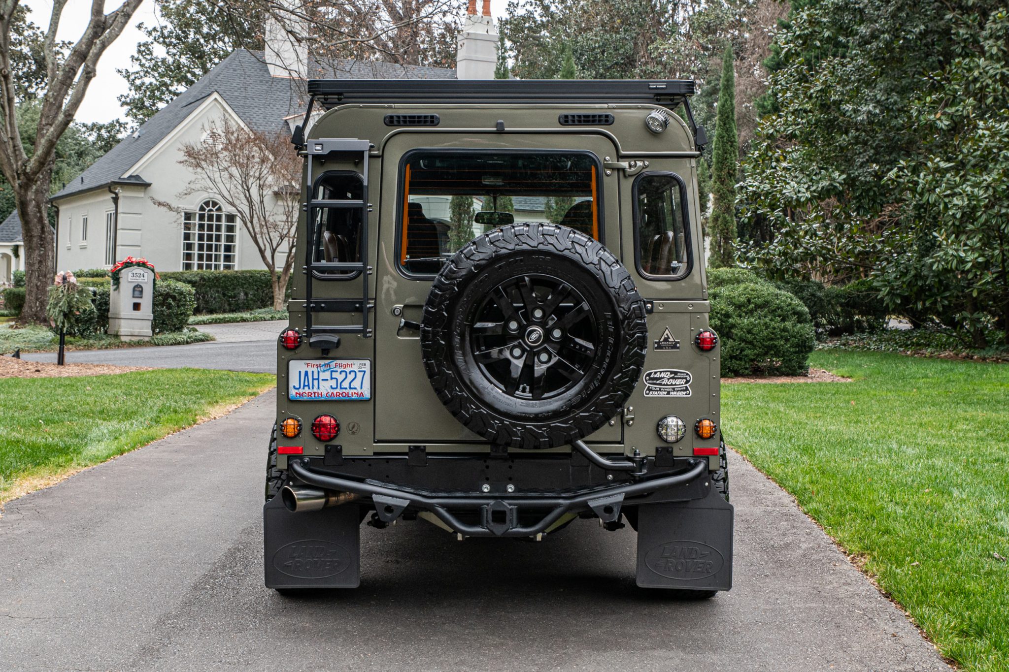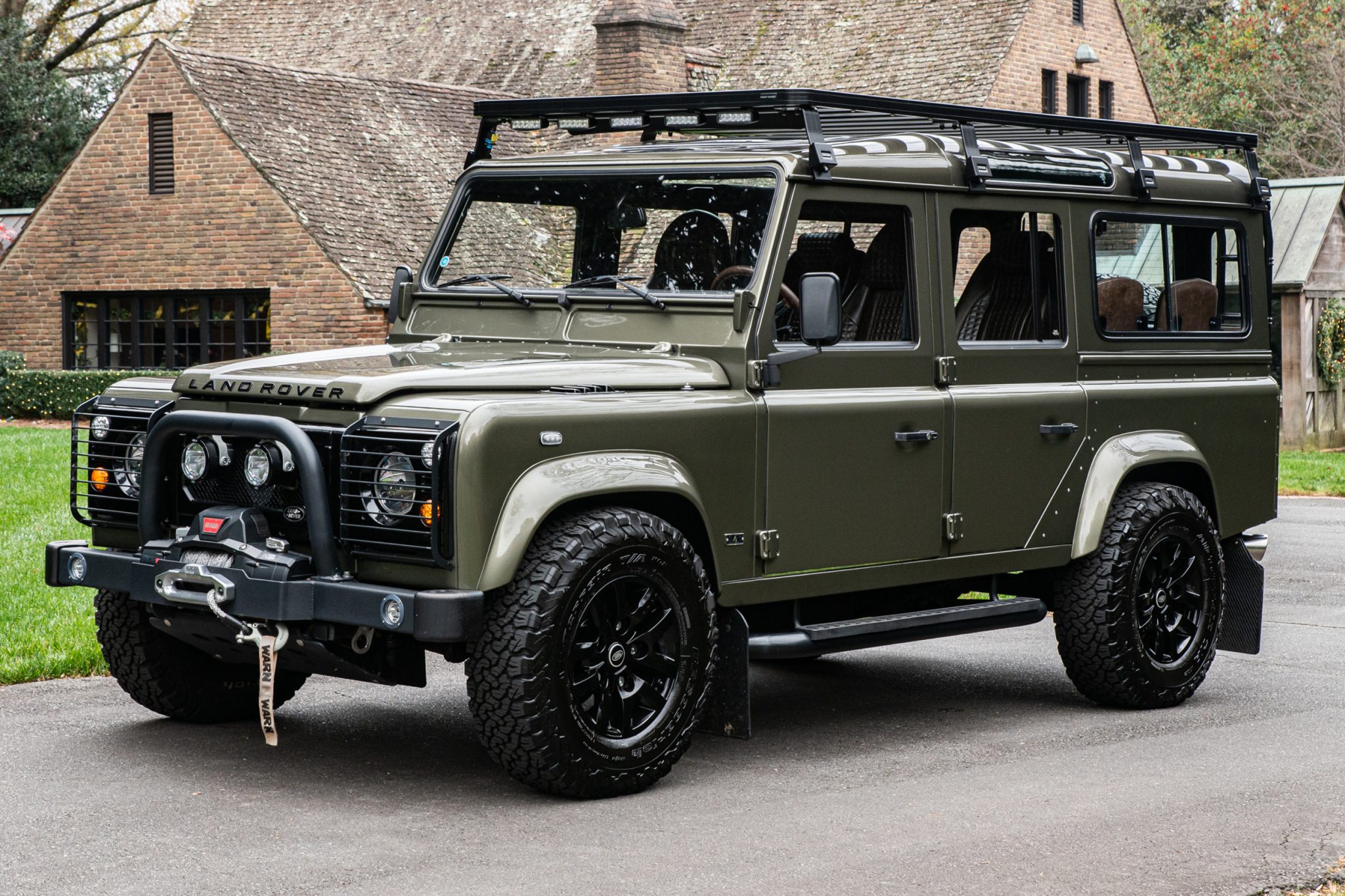 Kahn 16″ alloy wheels wear Land Rover center caps and 265/75 BFGoodrich All-Terrain T/A K02 tires. A matching spare is affixed to the swing-out rear tailgate. The truck is equipped with Old Man Emu suspension components including a steering stabilizer and dampers. Stopping power is provided by Wilwood four-wheel disc brakes with six-piston front and four-piston rear calipers over slotted rotors.