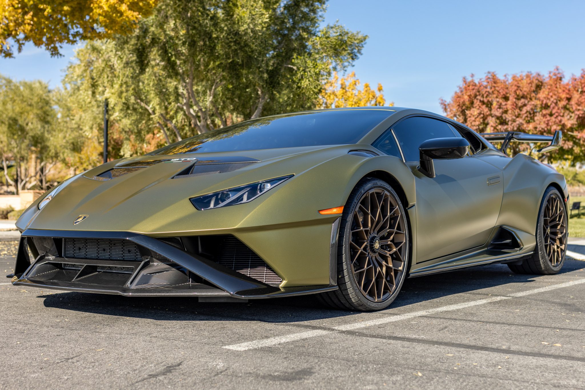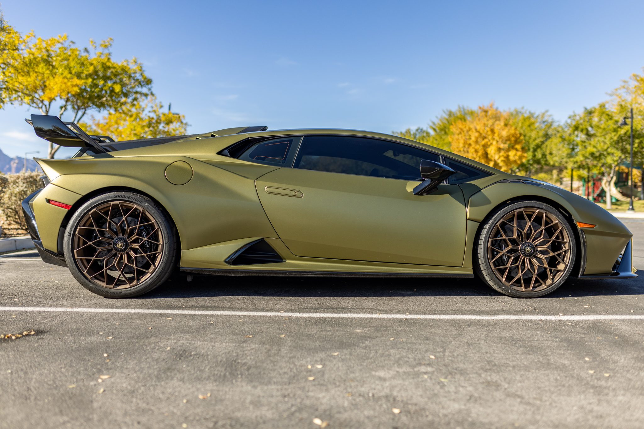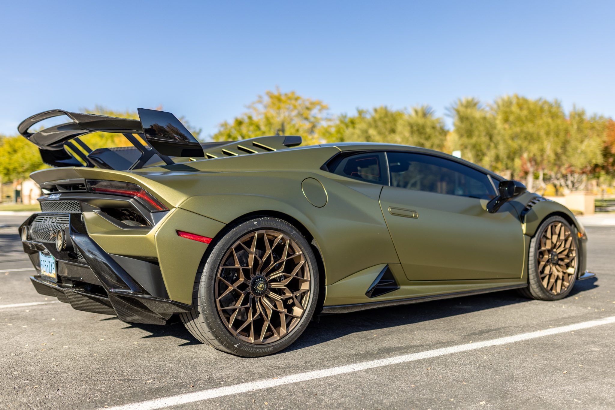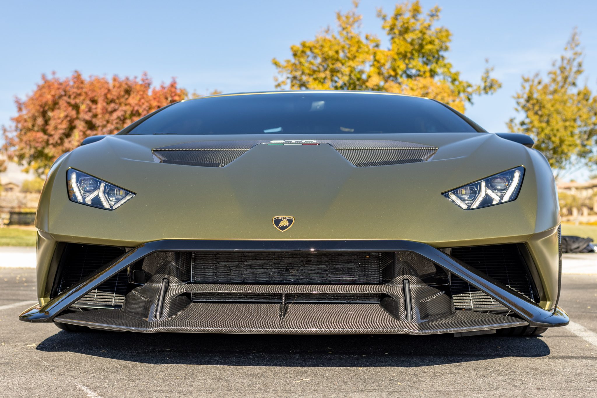 The 20″ forged center-lock wheels were powder-coated bronze under current ownership and are wrapped in 245/30 front and 305/30 rear Bridgestone Potenza Sport tires. Braking is handled by Brembo CCM-R carbon-ceramic discs with black-finished calipers that feature Lamborghini script at all four corners. The car is also equipped with electro-mechanical power steering, rear-wheel steering, electronic stability control, magneto-rheological suspension, and a front-end lift system.