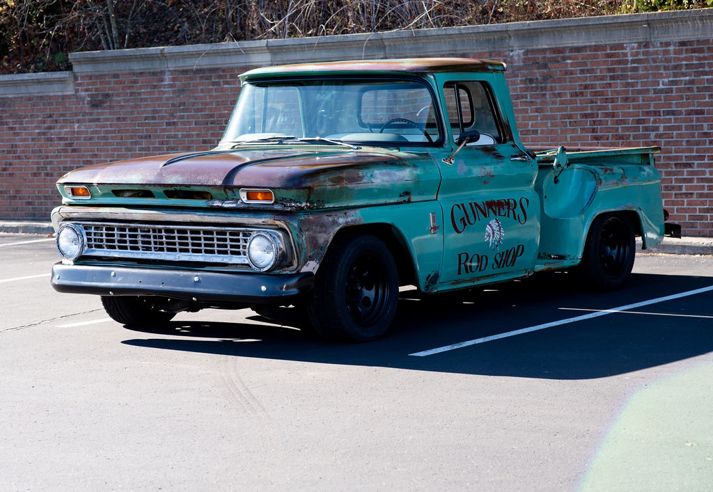 Black 15″ eight-hole wheels are mounted with a mixed set of 245/50 Falken and Mirada tires. The truck is equipped with air springs and power-assisted steering. Braking is provided by power front discs and rear drums.