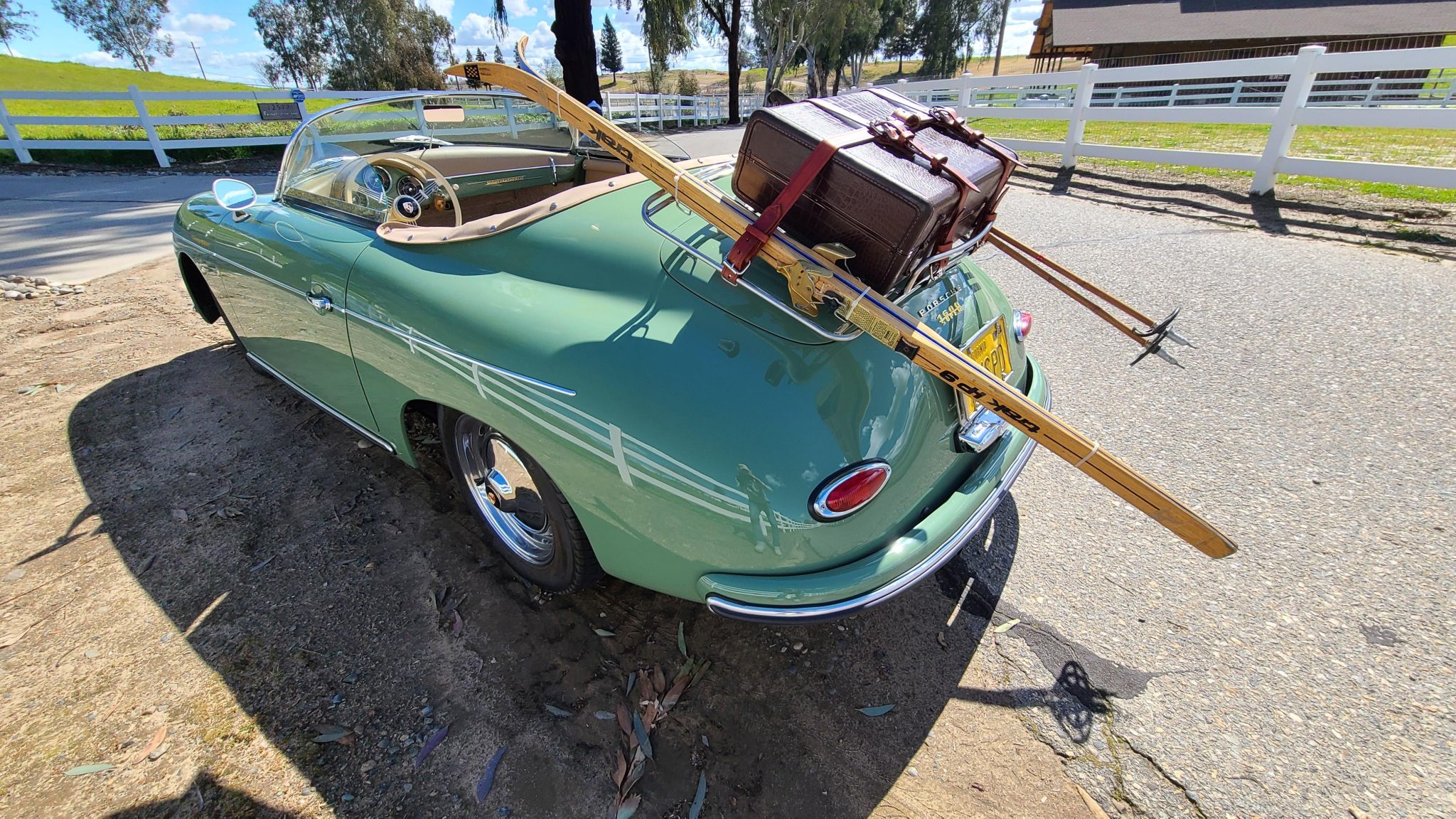 Polished 15” aluminum Vintage 190 wheels wear chrome hubcaps with Porsche crests and are mounted with 185/65 Pirelli P4 tires. Braking is through four-wheel discs, and the car features independent rear suspension.